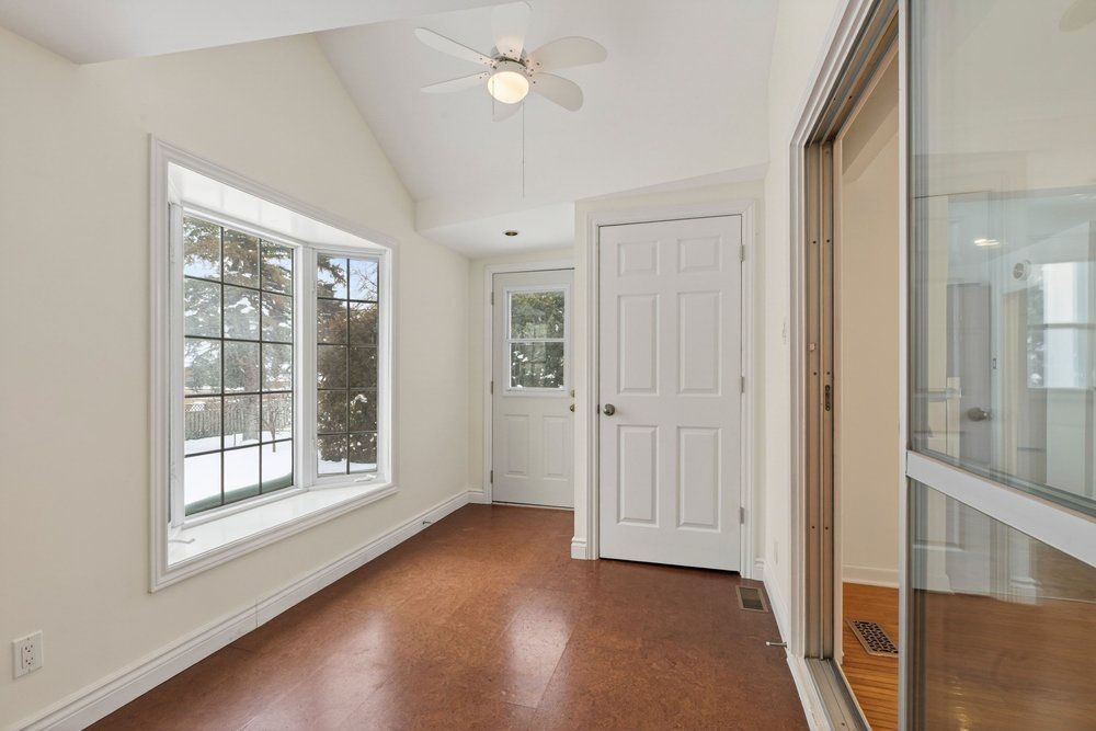 • Bright sunroom with vaulted ceiling and bay window seating.