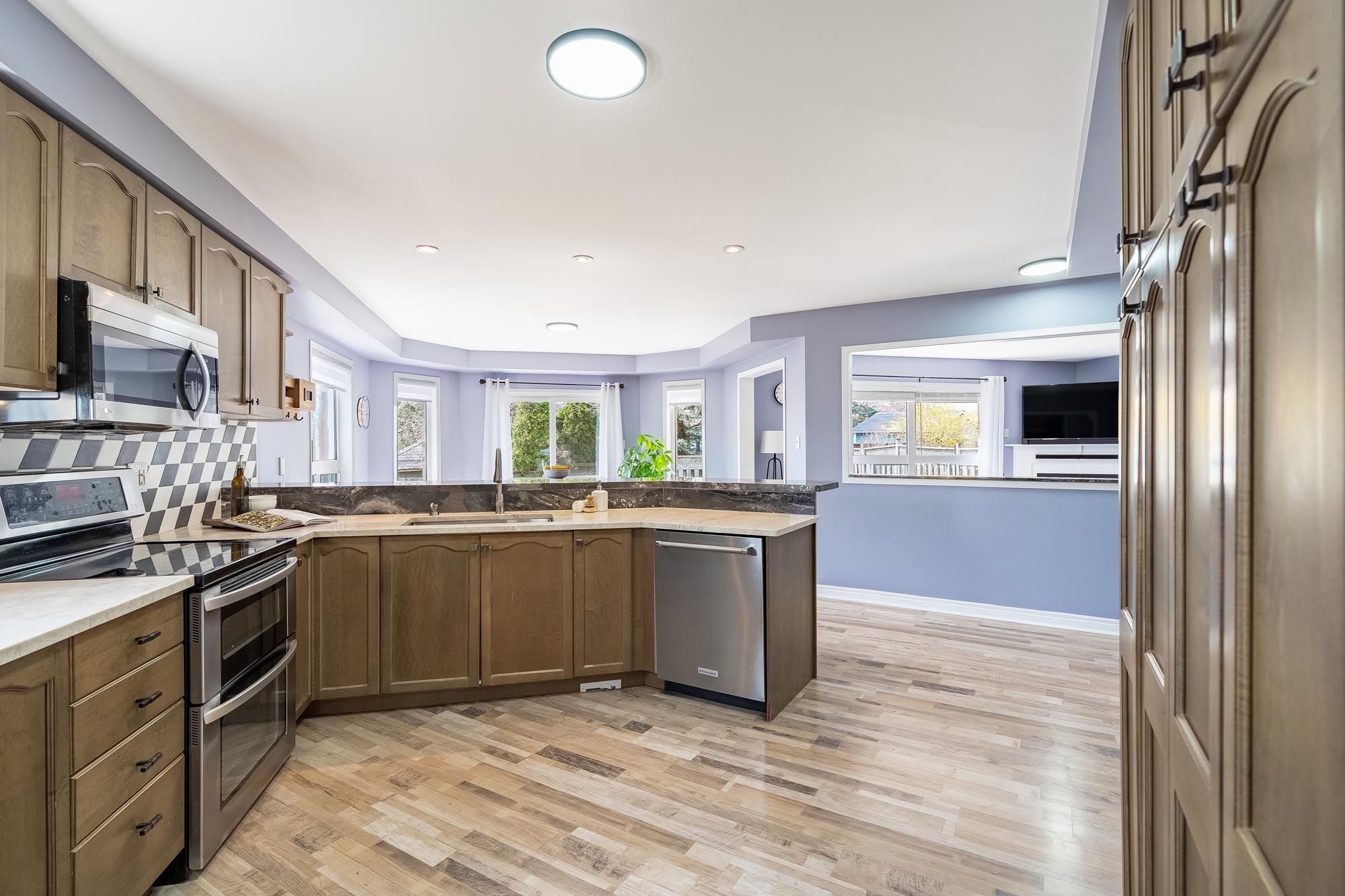 • Custom kitchen with granite countertops, porcelain backsplash, and a butler's pantry.