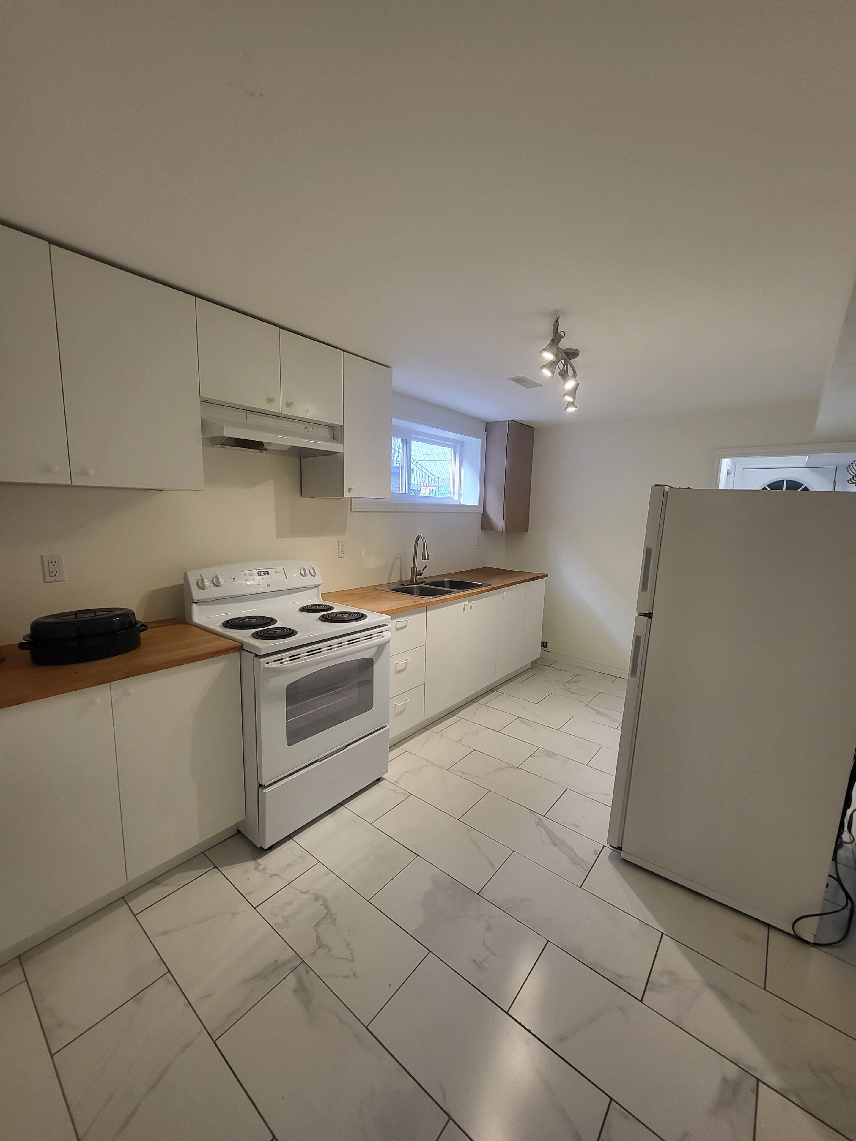 Welcome to your basement apartment, on a quiet street, with parking and ensuite laundry in a perfect residential neighbourhood. Your new home comes comes with spacious living/dining area,brand new 3 pc bath and large bedroom with big above-grade windows creating a bright and welcoming atmosphere in every room. The fully equipped kitchen features a fridge, stove, ensuring you have everything you need to prepare meals with ease. Perfectly situated home for city living, you'll have excellent access to transit options, making your daily commute a breeze. Connect easily to 401 for convenient travel, and explore nearby shopping malls for all your shopping needs. The humber river recreational trail is just minutes away, offering a scenic escape for walking, jogging, or simply enjoying nature. Experience the perfect blend of comfort, convenience, and serenity in your brand new basement apartment your ideal home awaits!