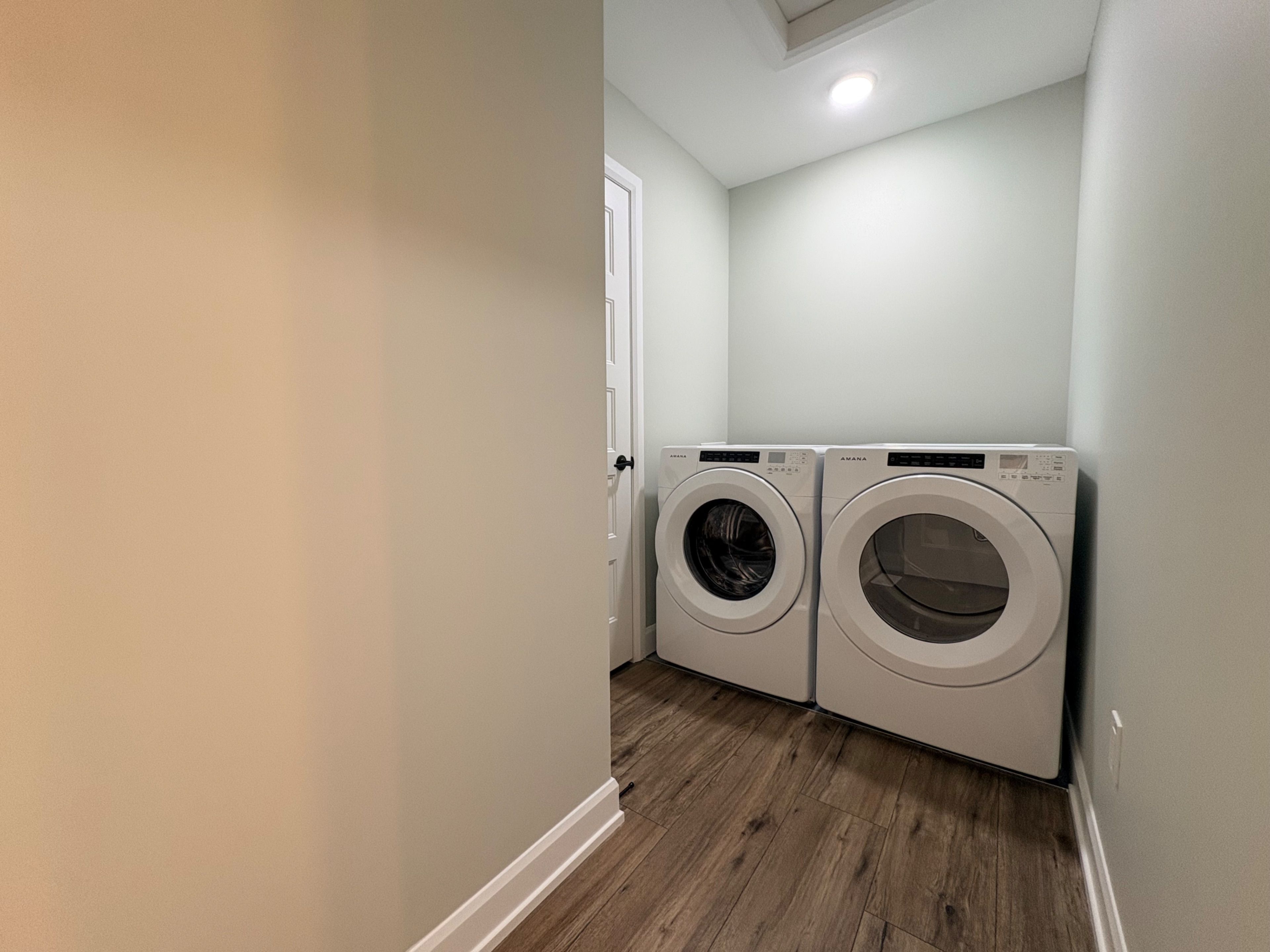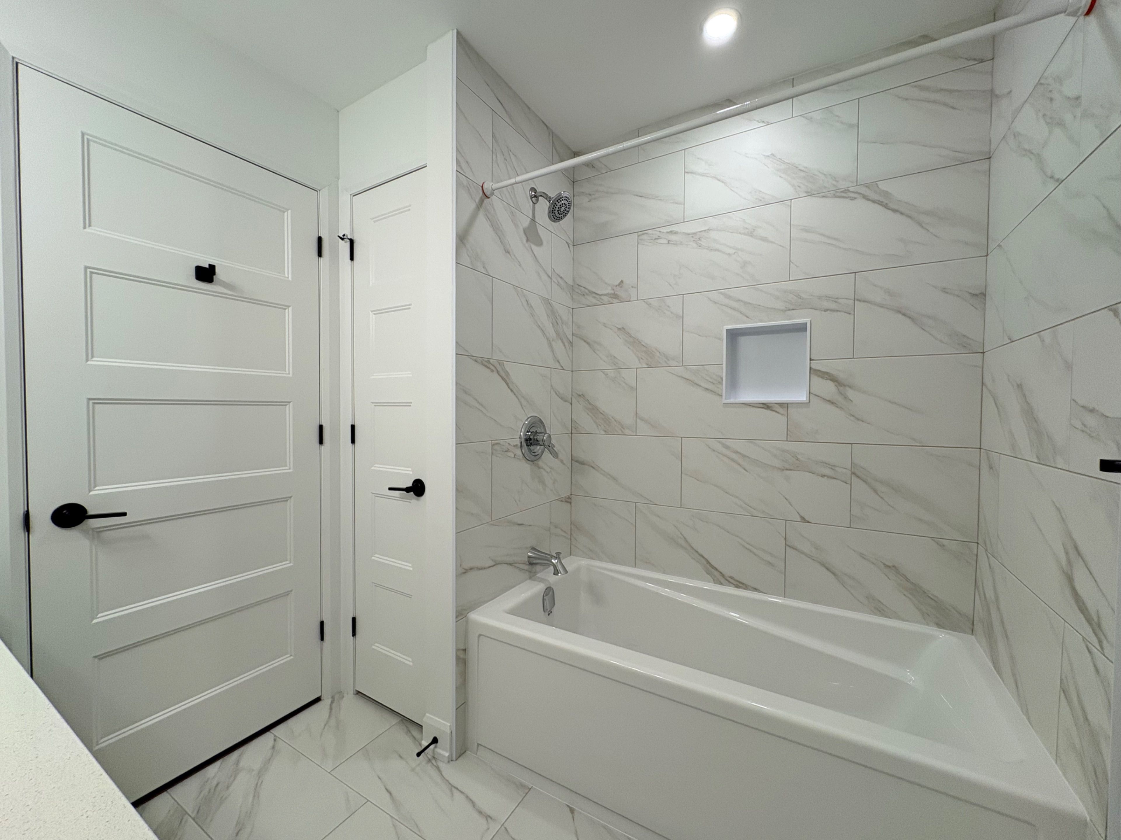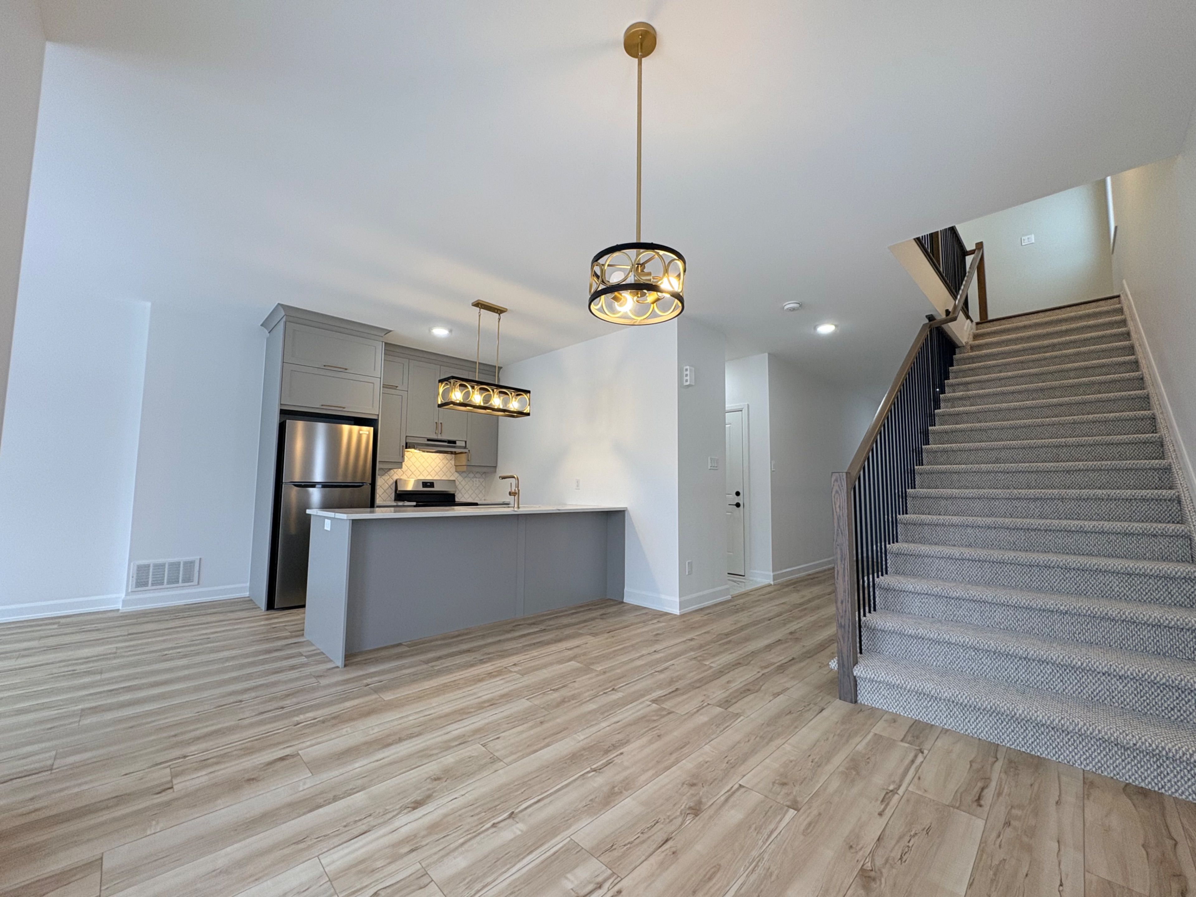 • Gourmet kitchen features quartz surfaces and stainless steel appliances.
