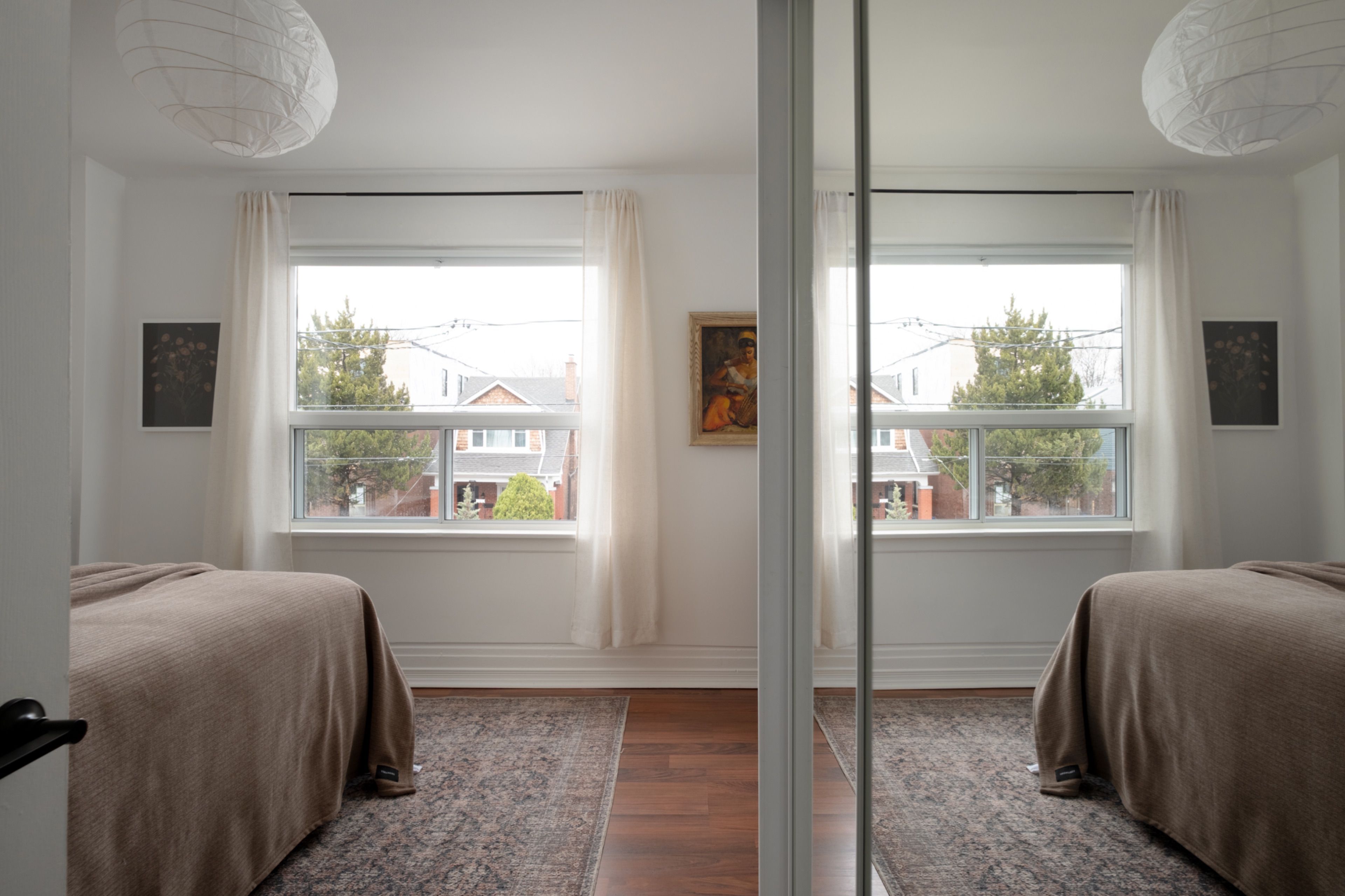 • Charming front porch with a welcoming red door and park views.