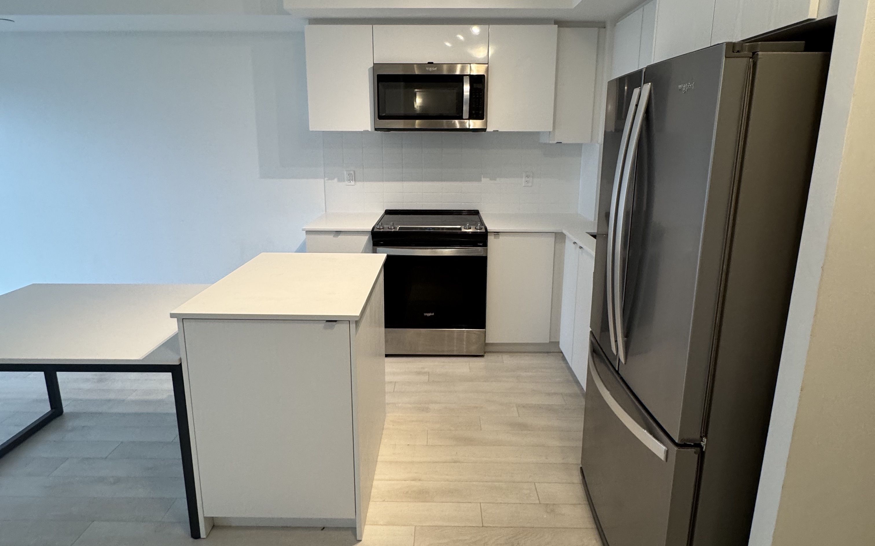 • Contemporary kitchen with premium cabinetry, quartz countertops, and stainless steel appliances.