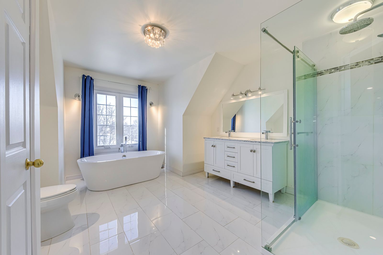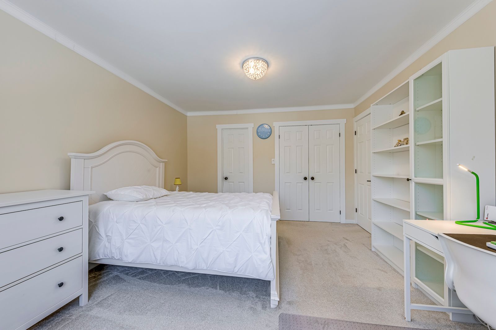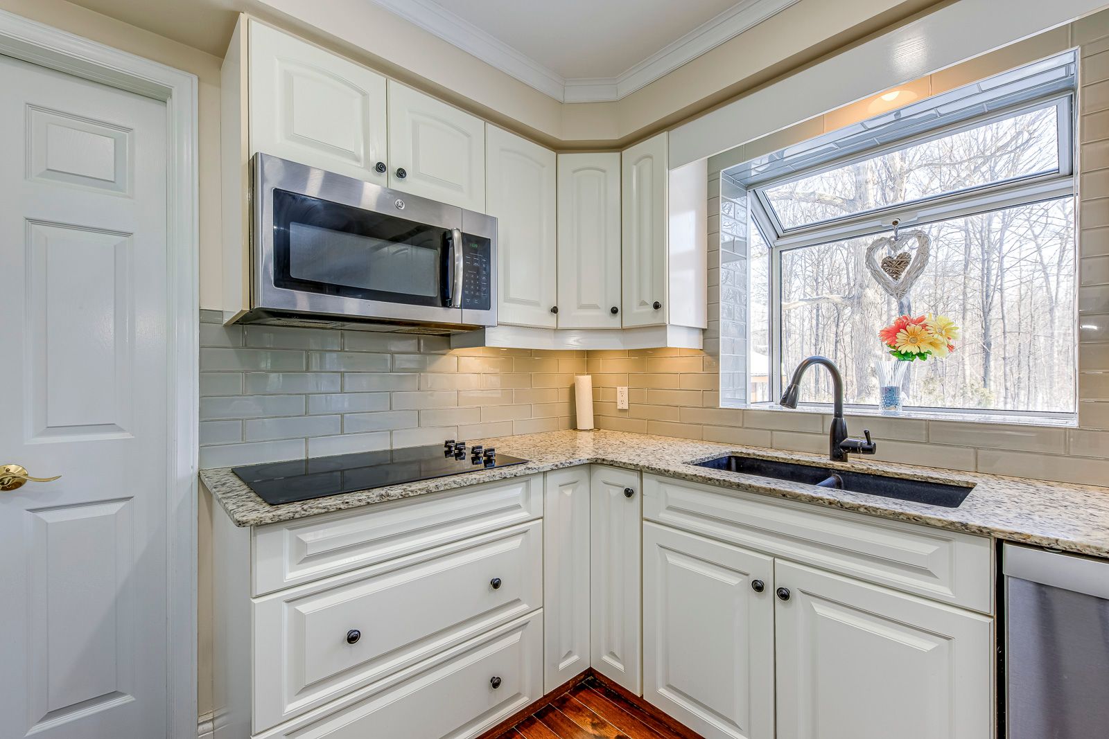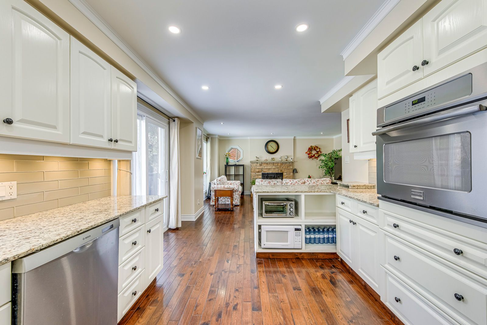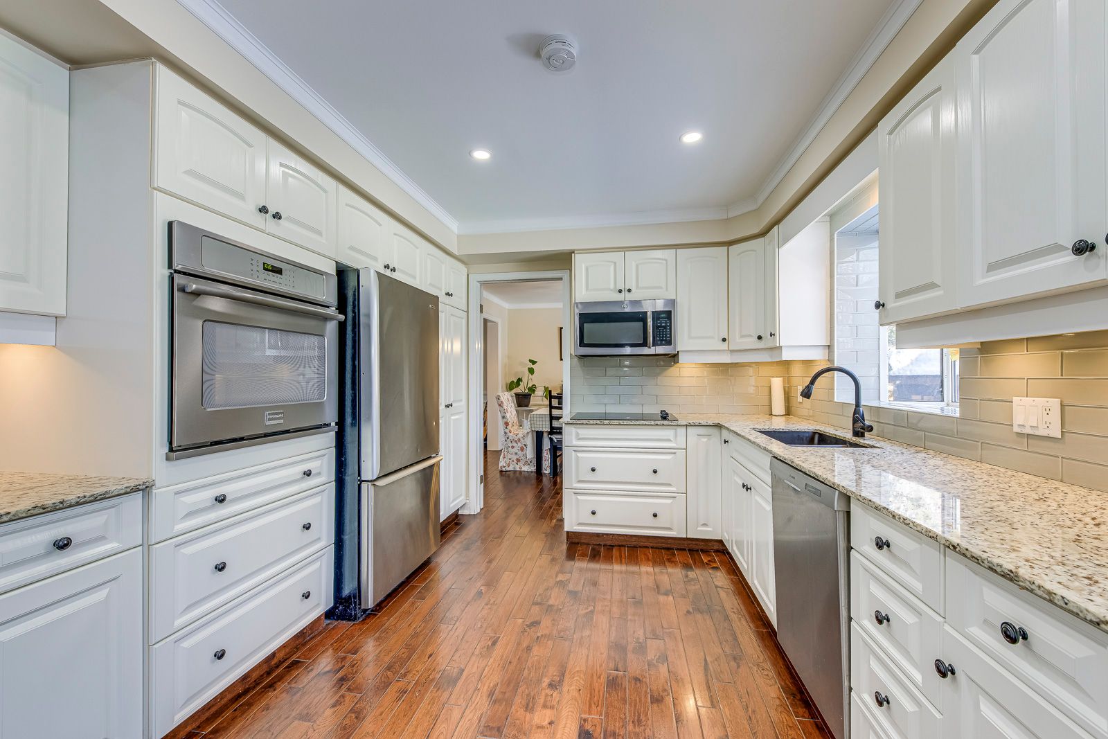• Bright white kitchen with built-in appliances and elegant living spaces.