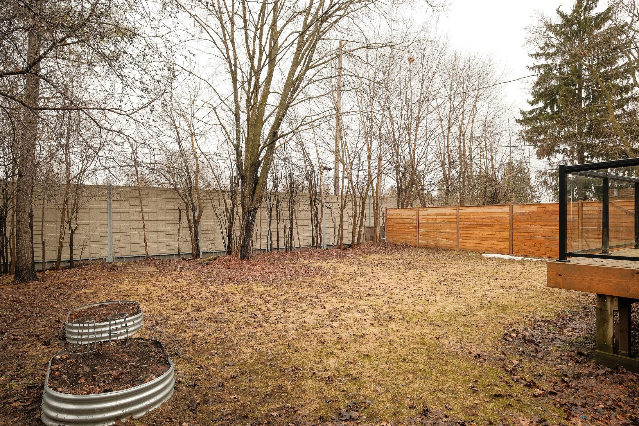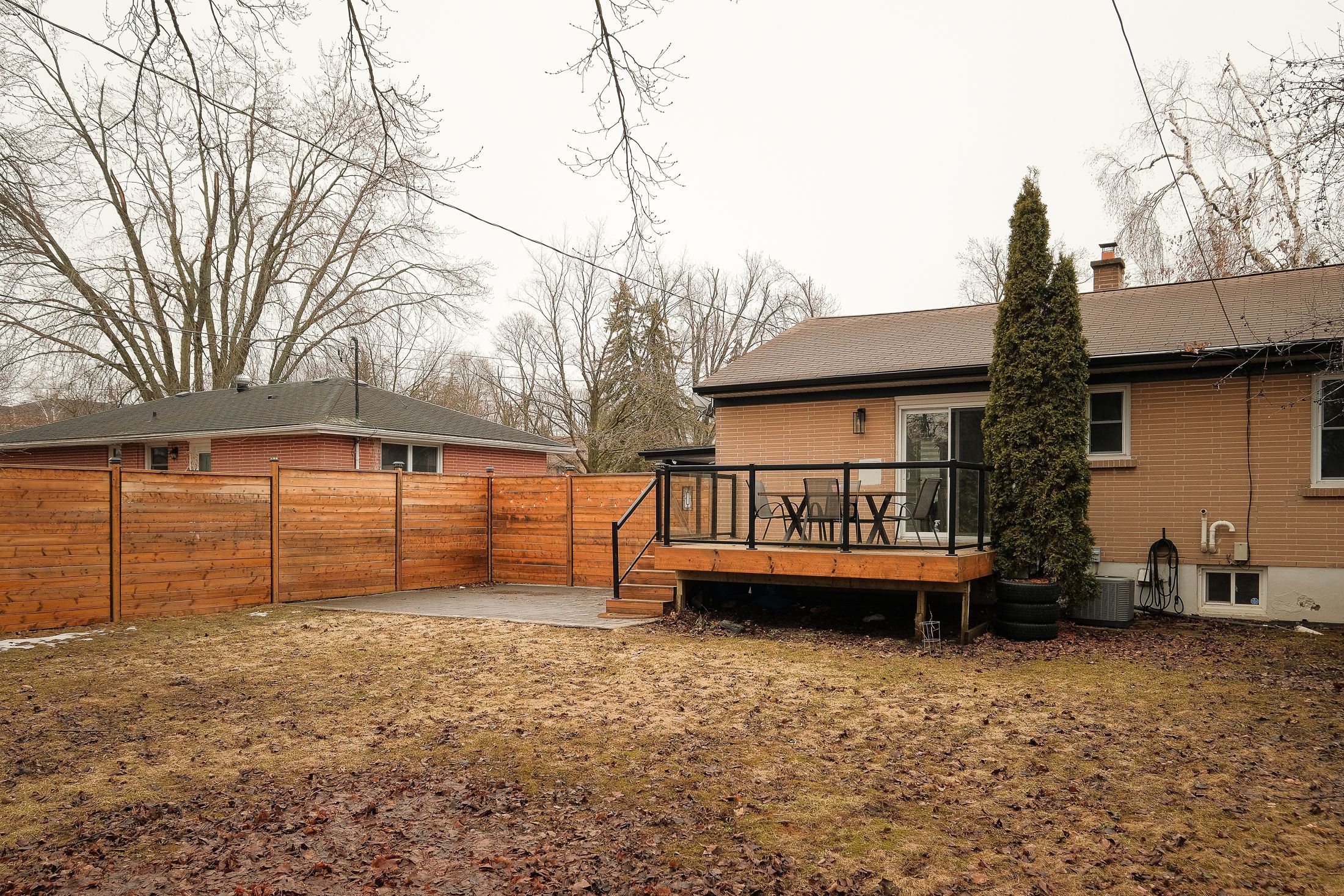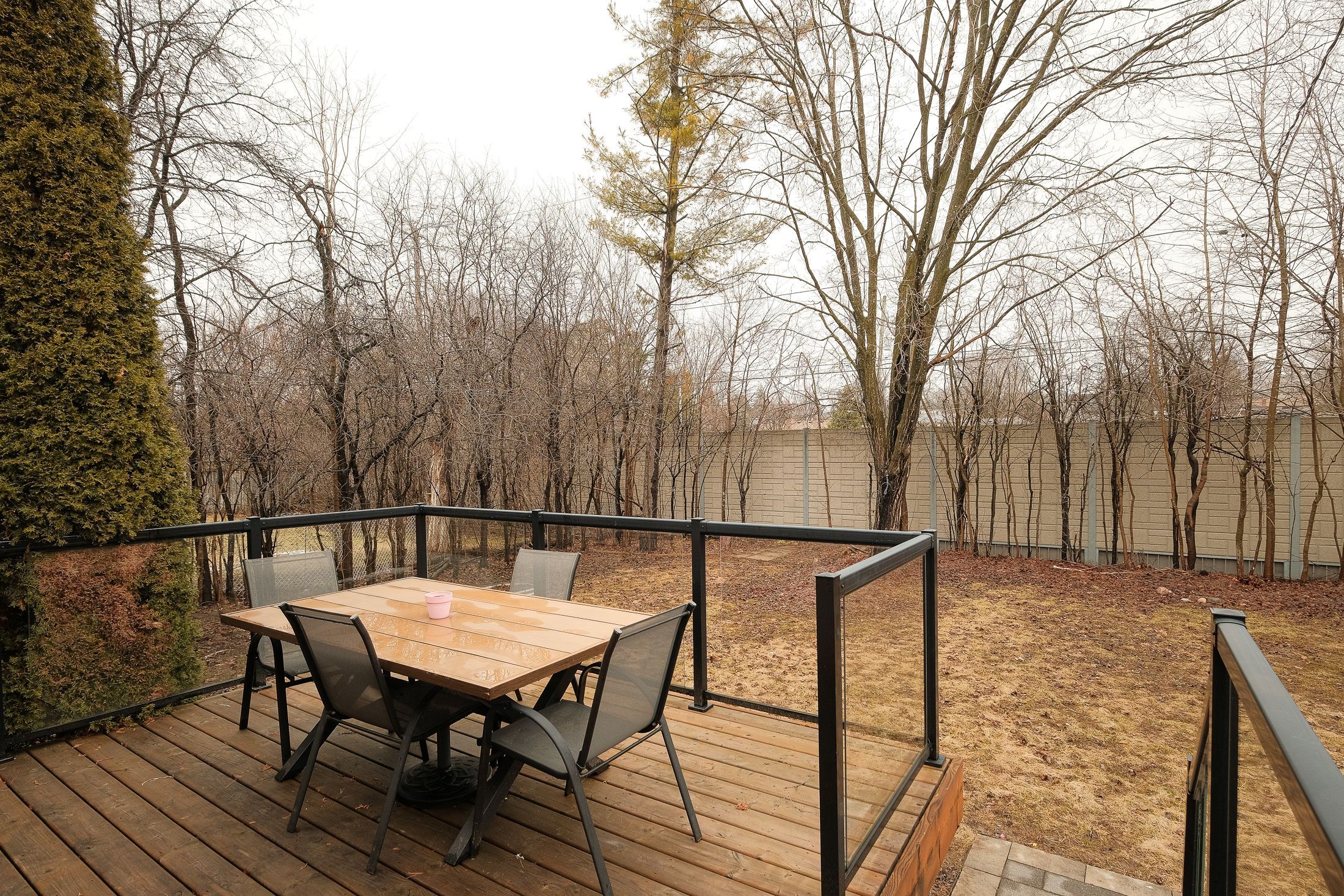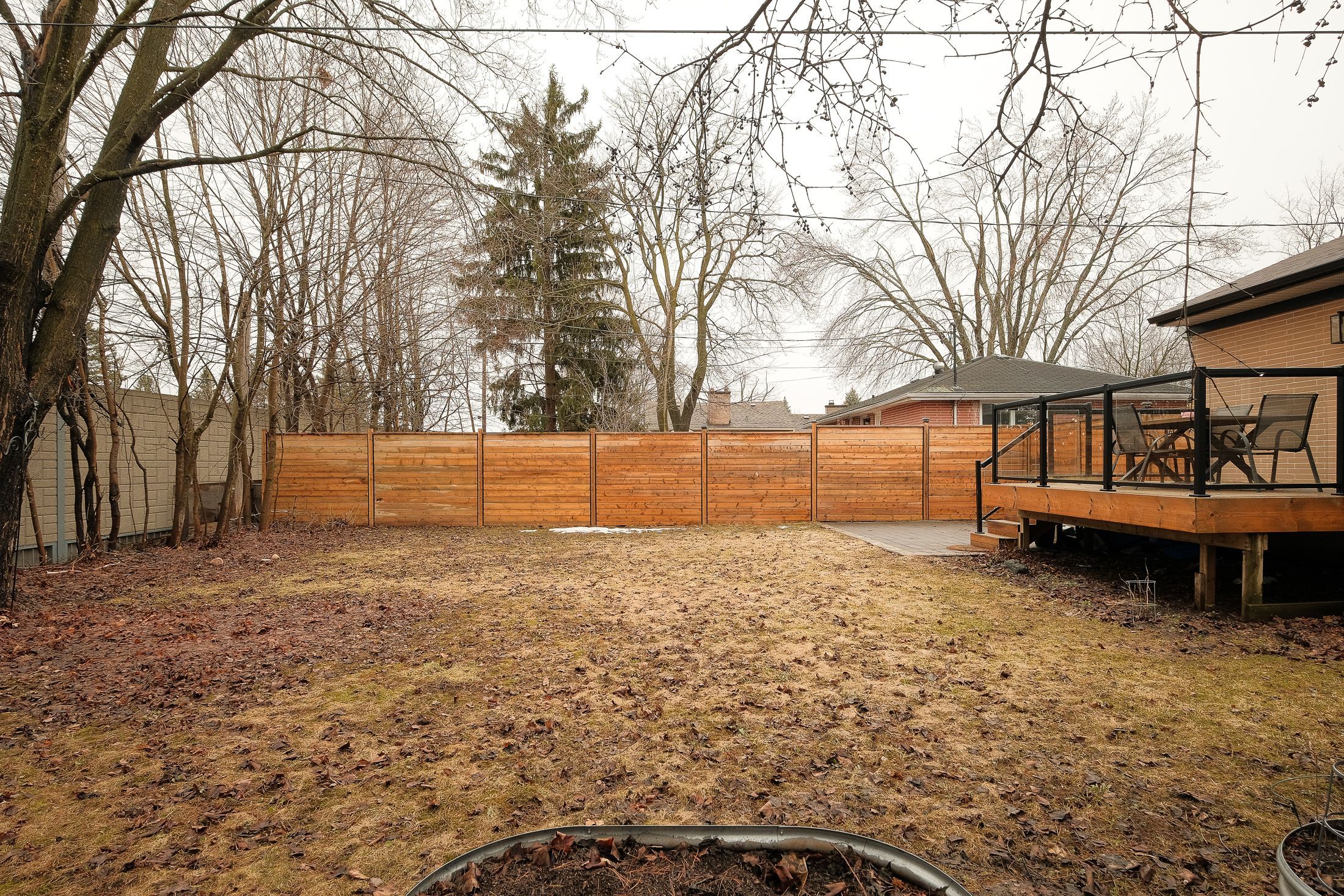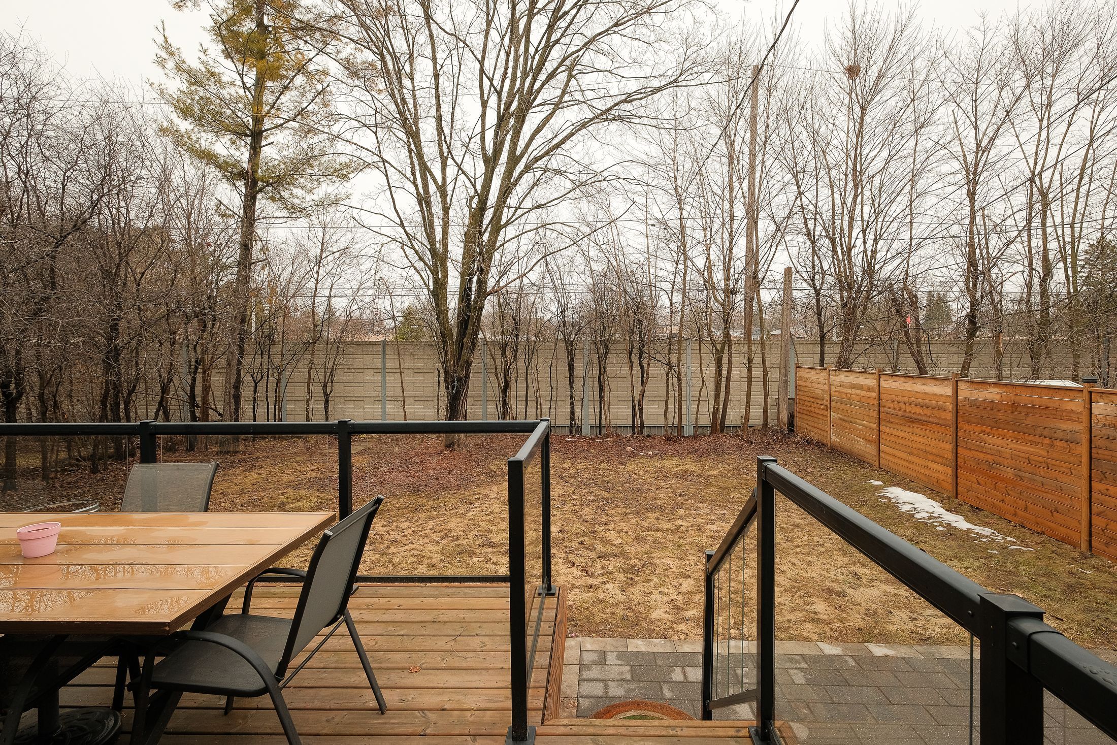 • Private backyard featuring a glass-railed deck and stone patio.