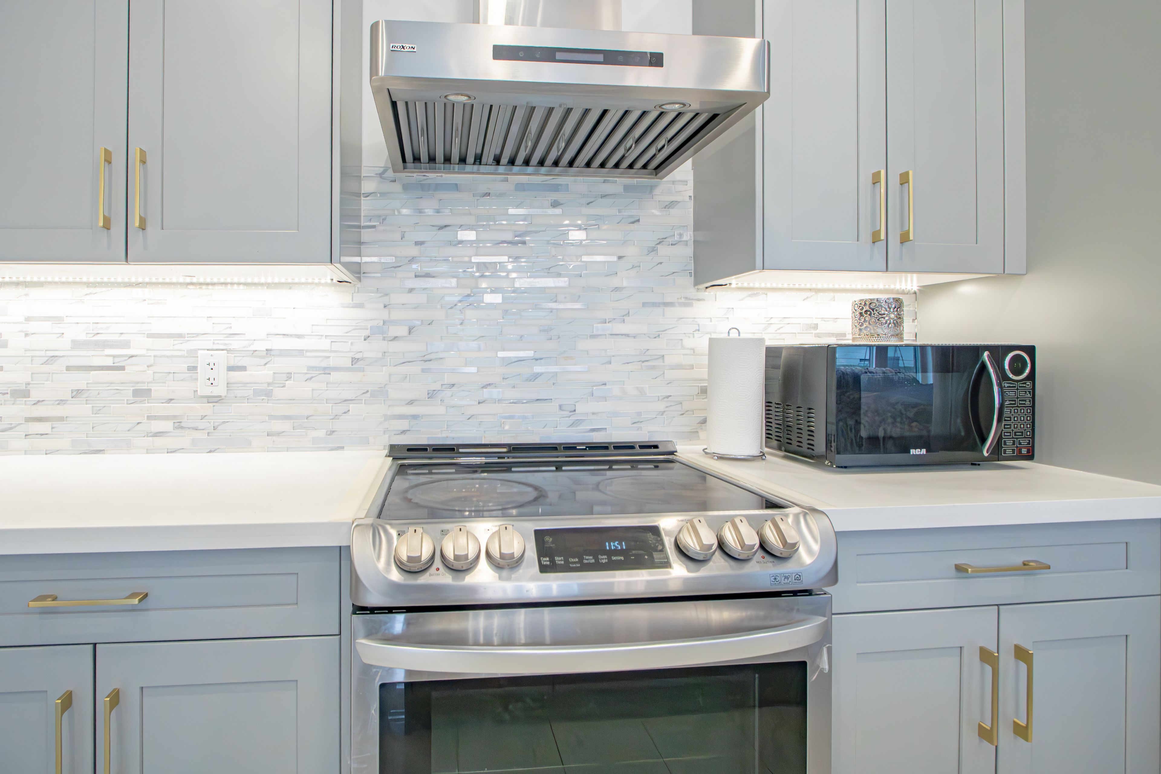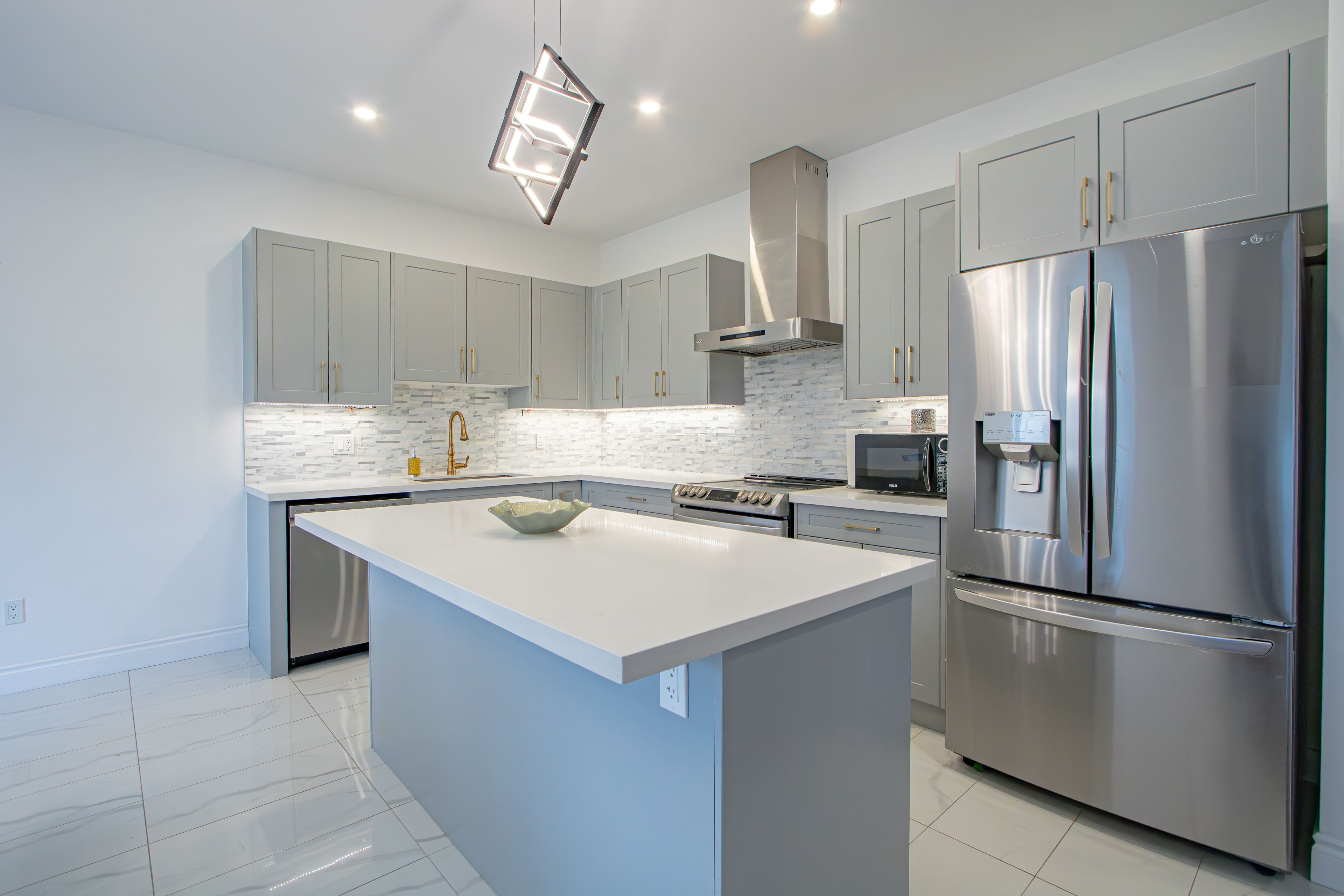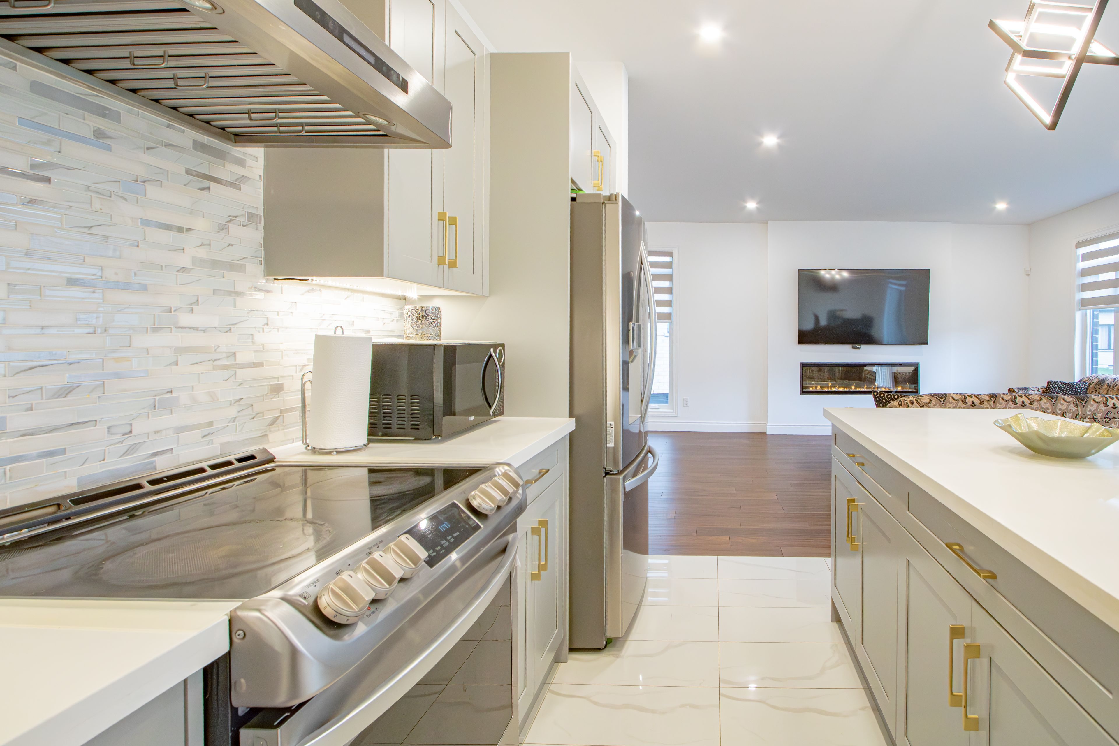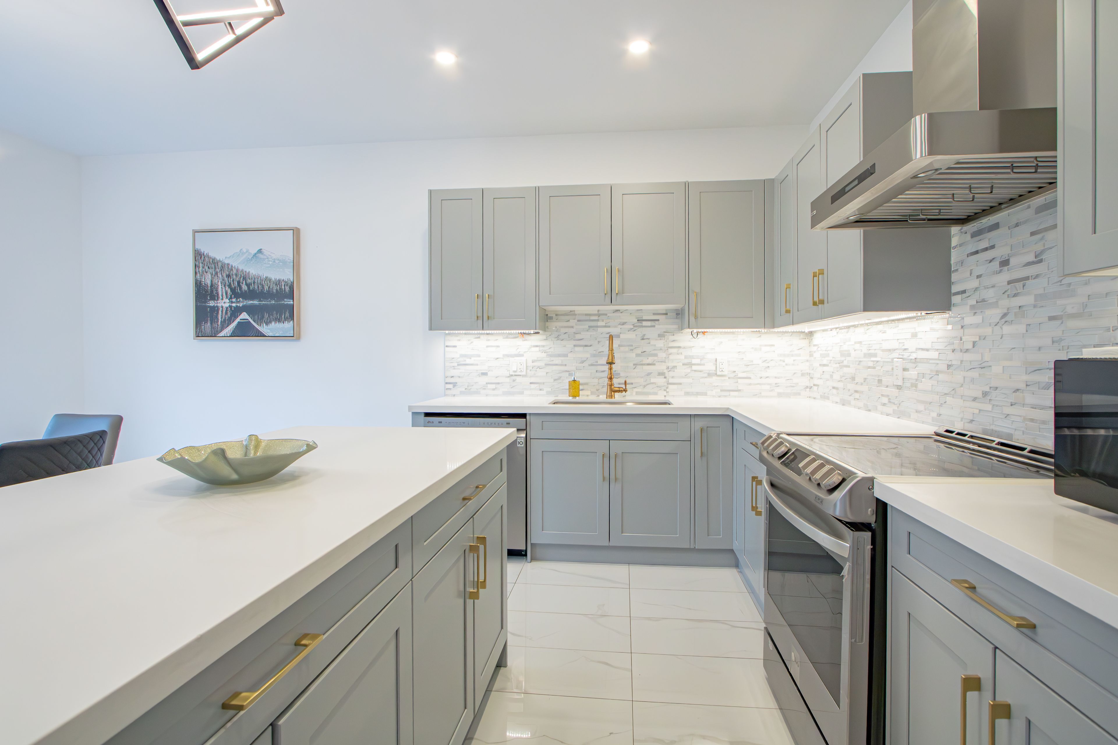 • Modern kitchen equipped with stainless steel appliances and ample storage.