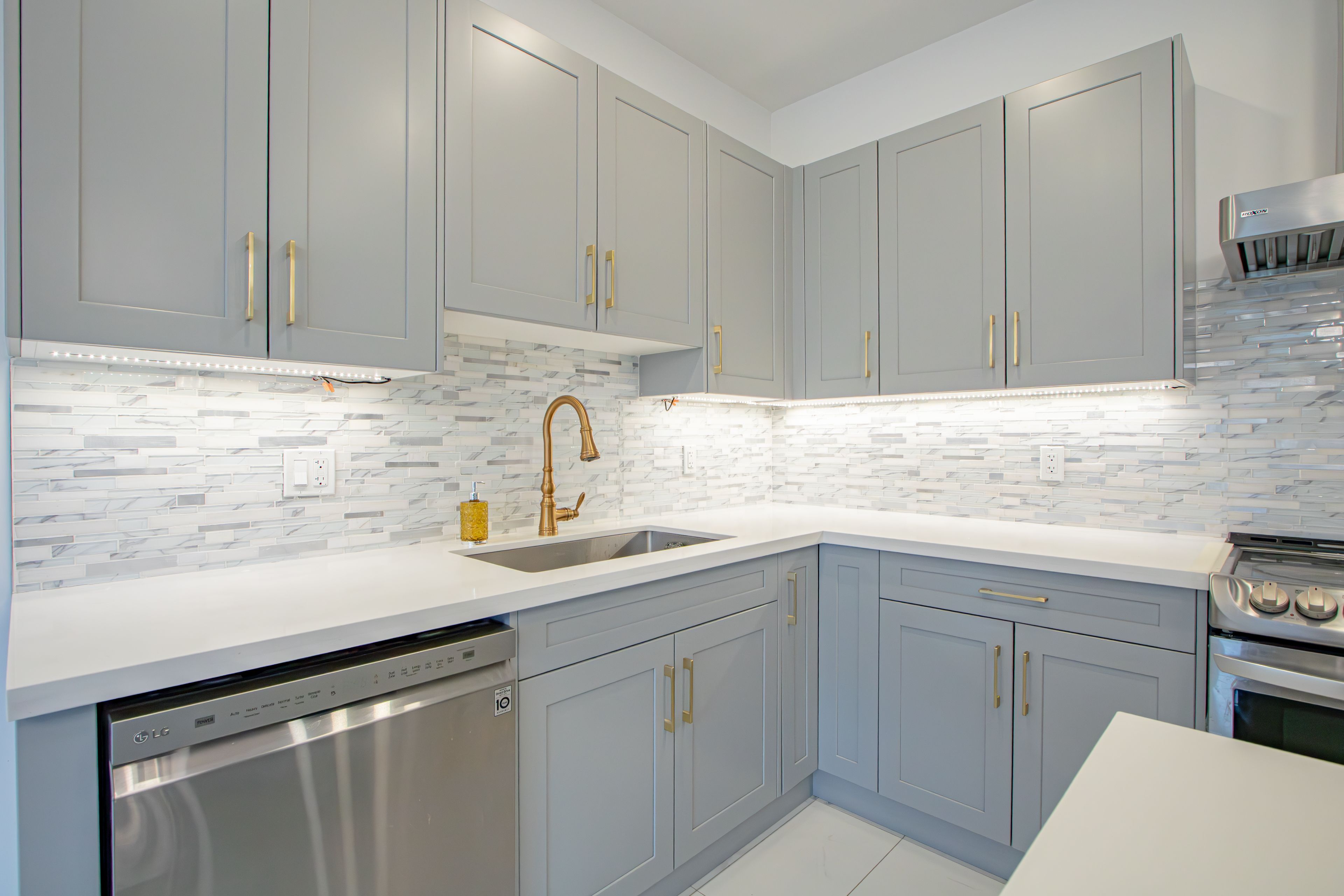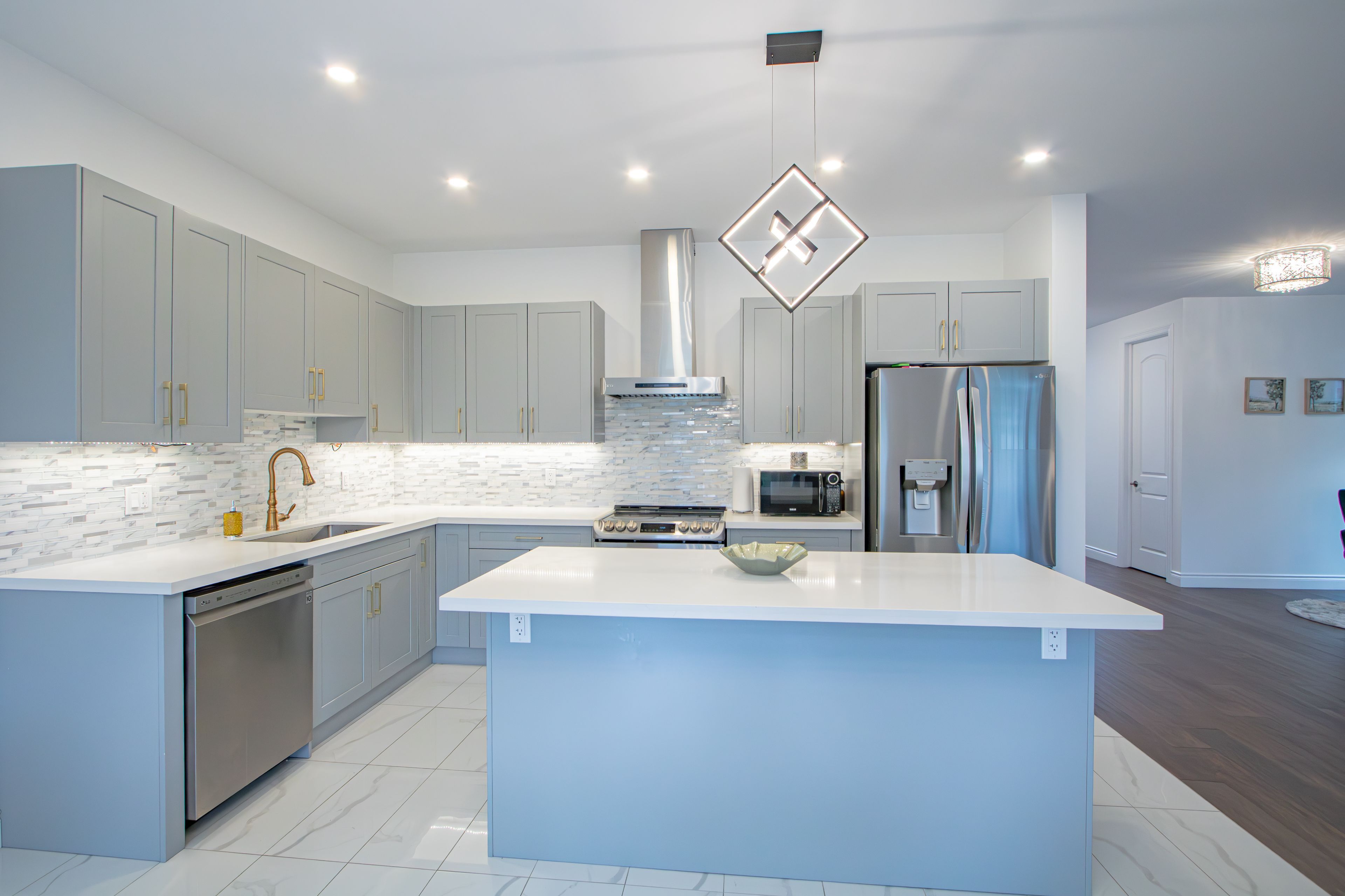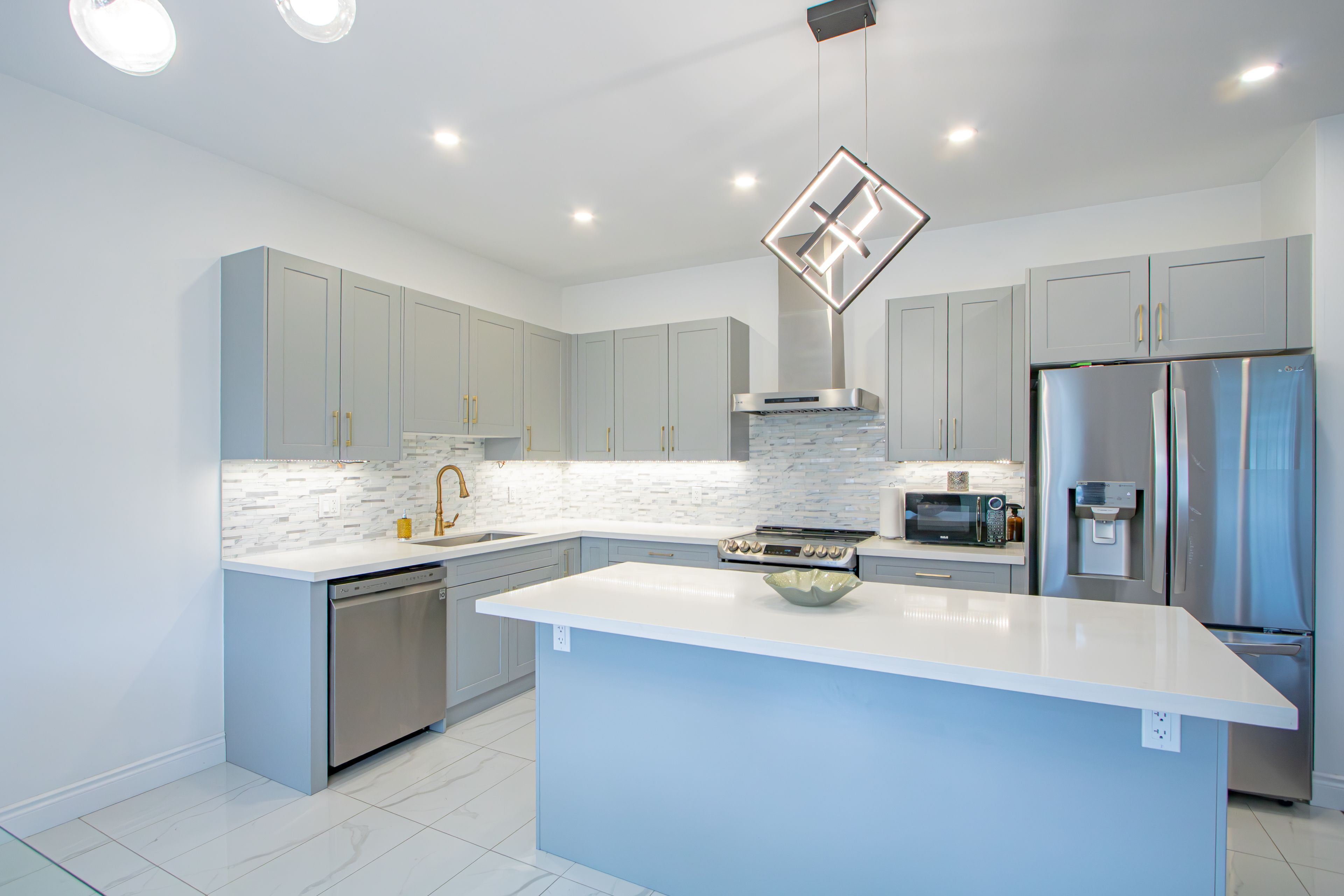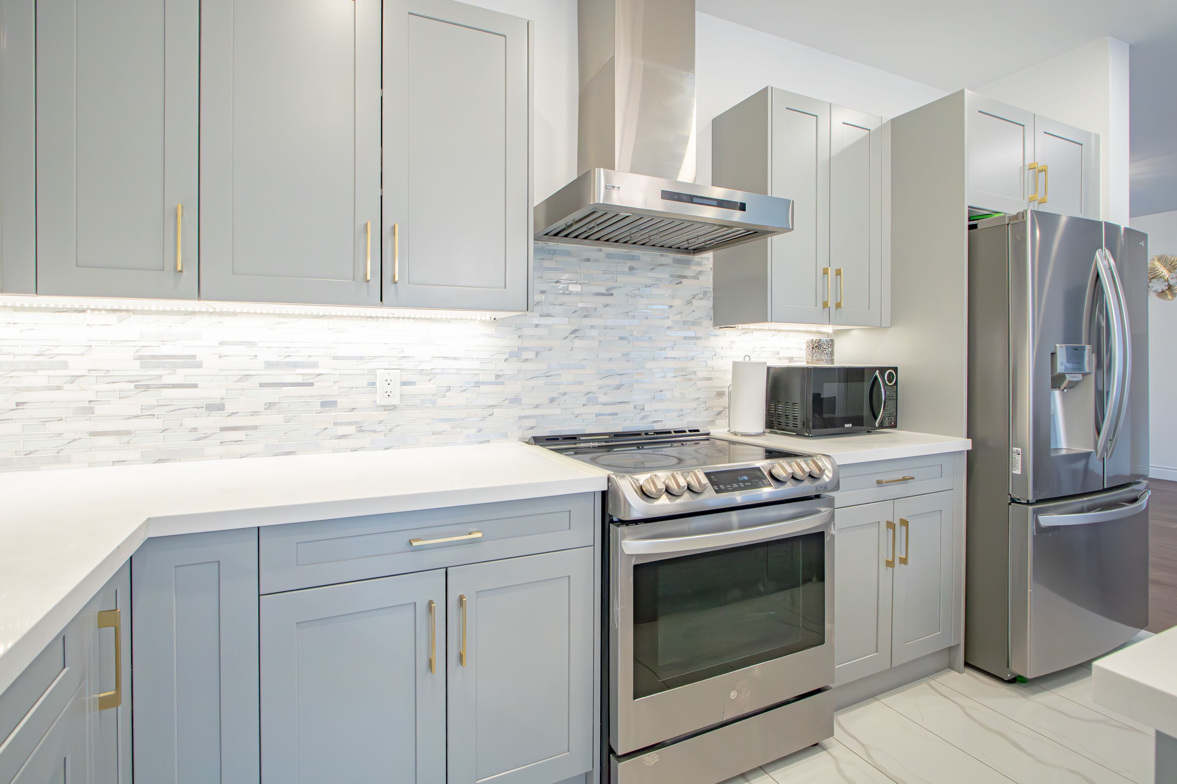 • Modern kitchen equipped with stainless steel appliances and ample storage.