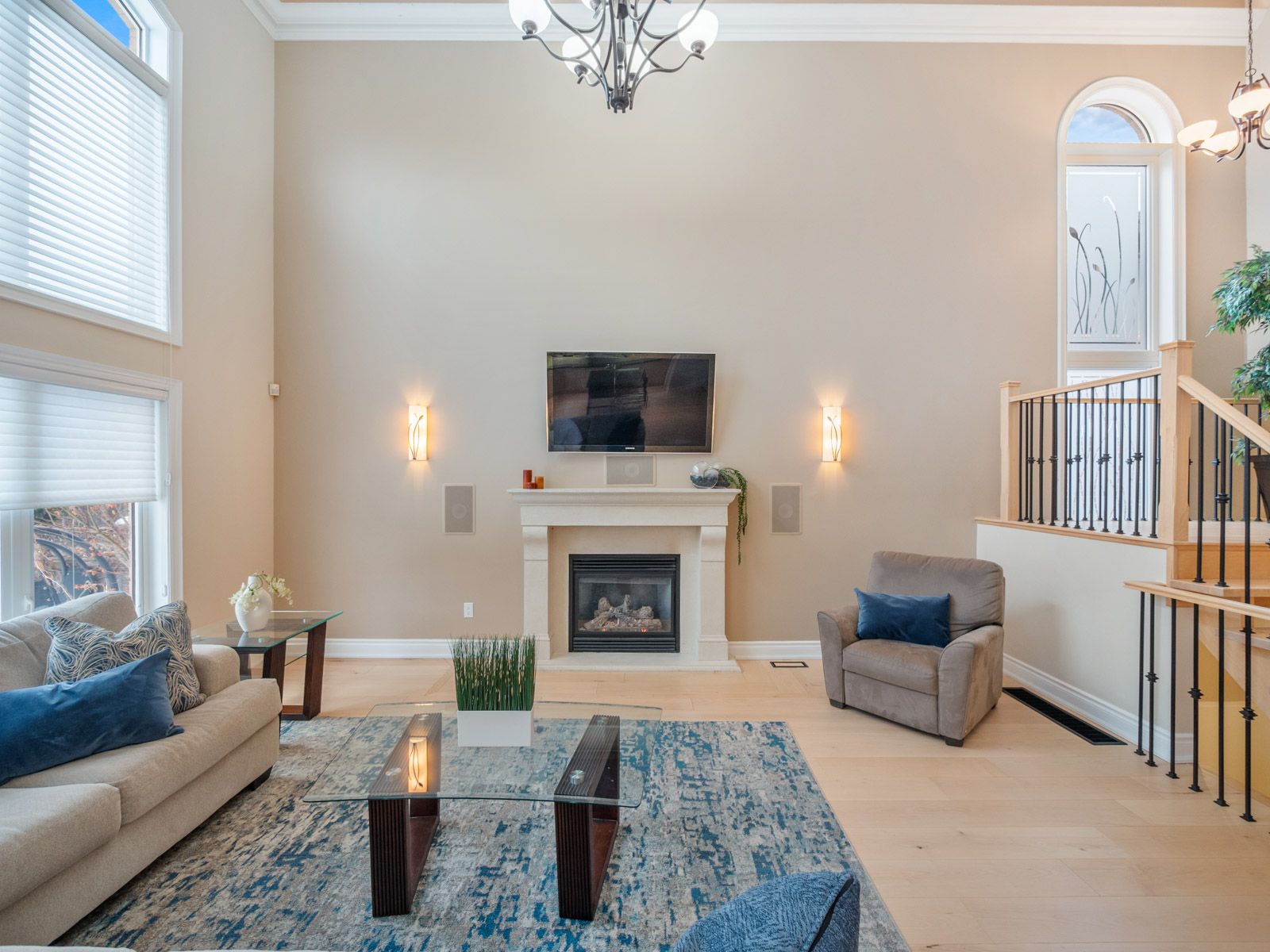 • Open plan main floor features 10-foot ceilings and a cozy gas fireplace.