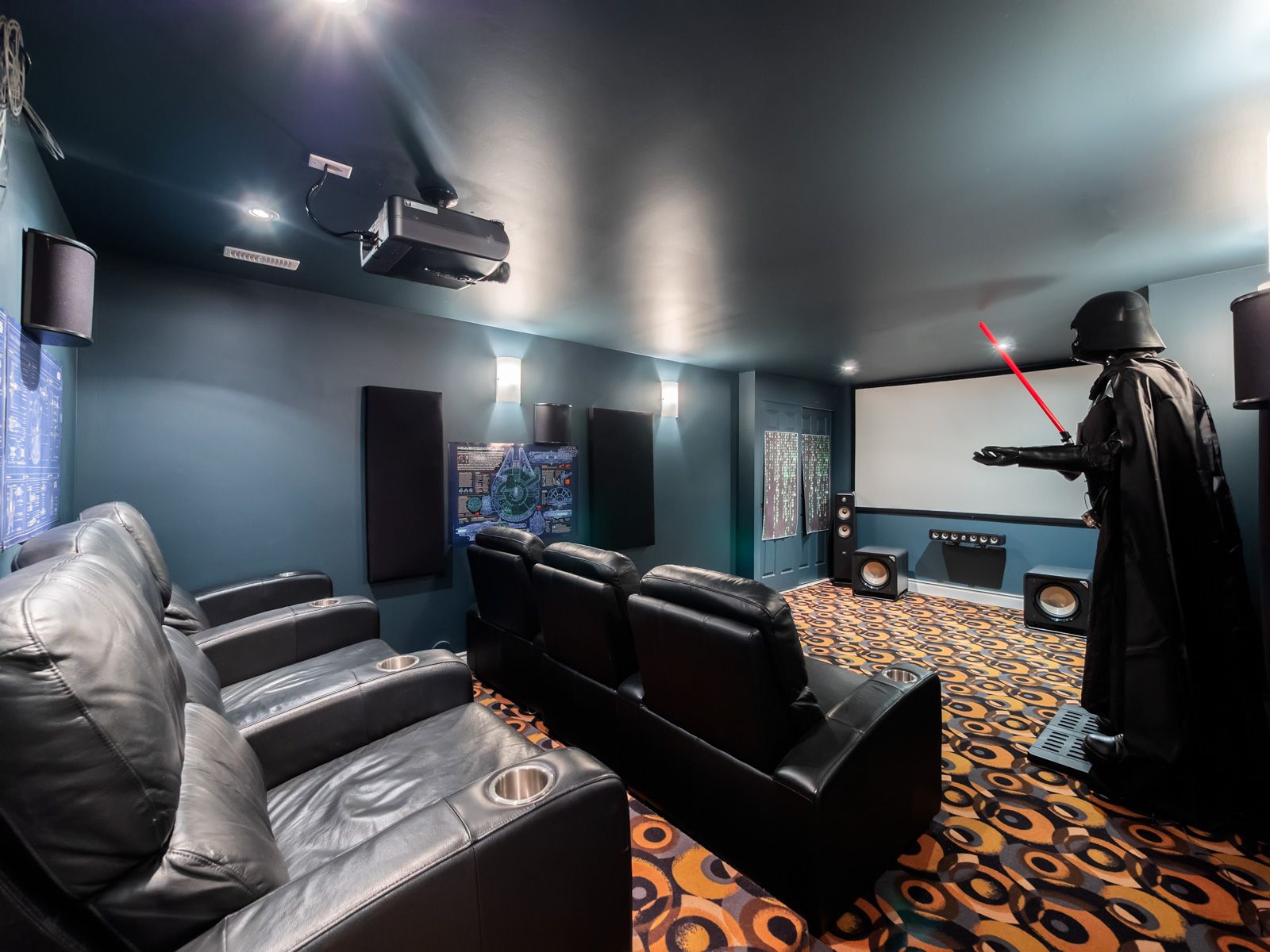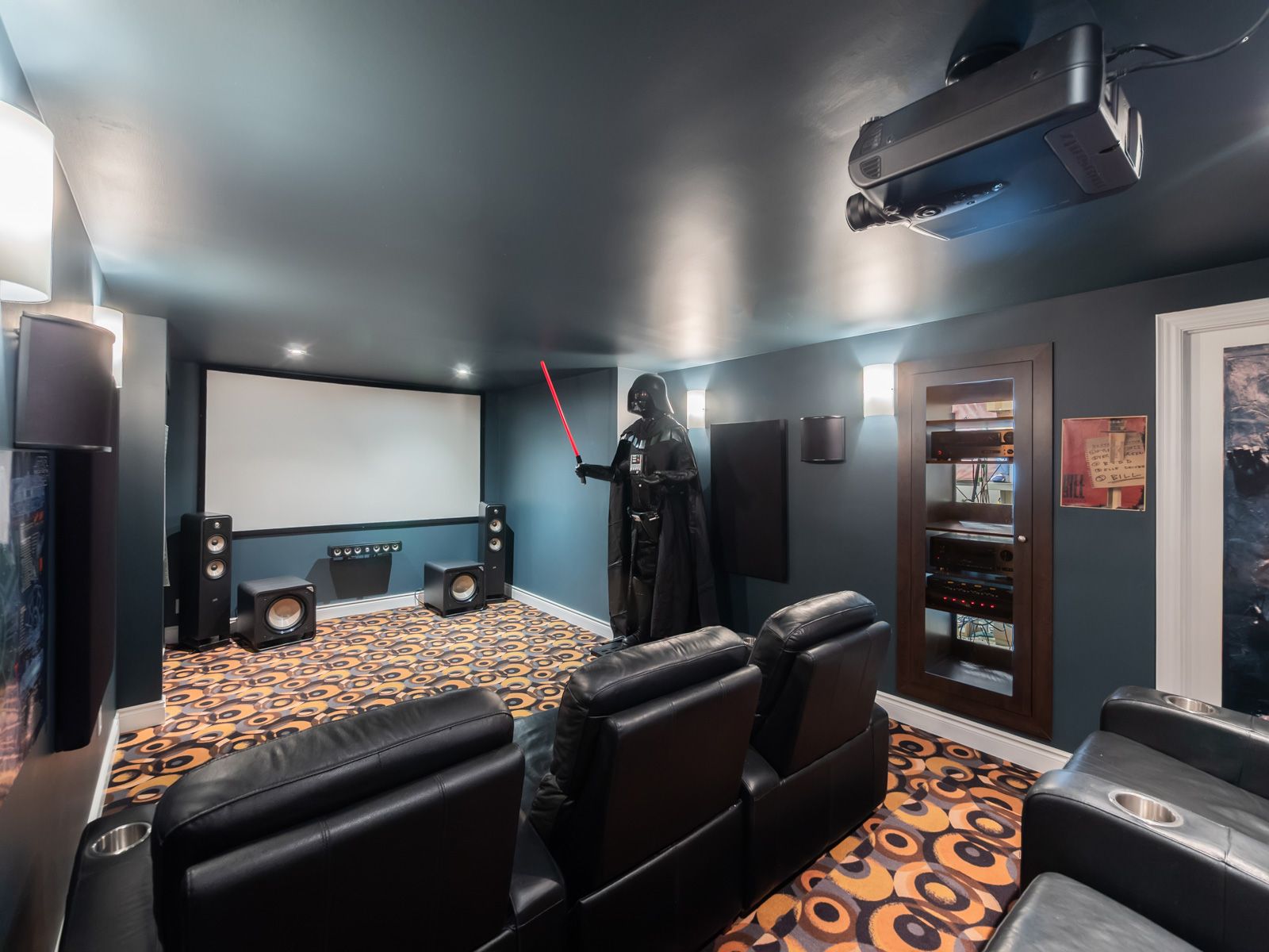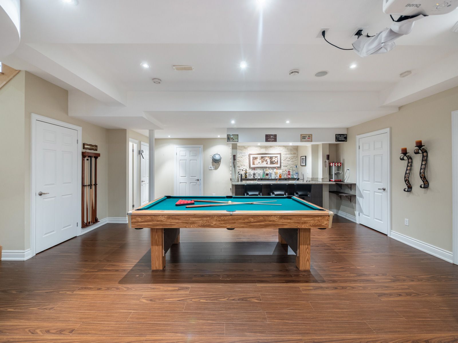 • Lower level has a family room, gym, billiards room, and theatre room.