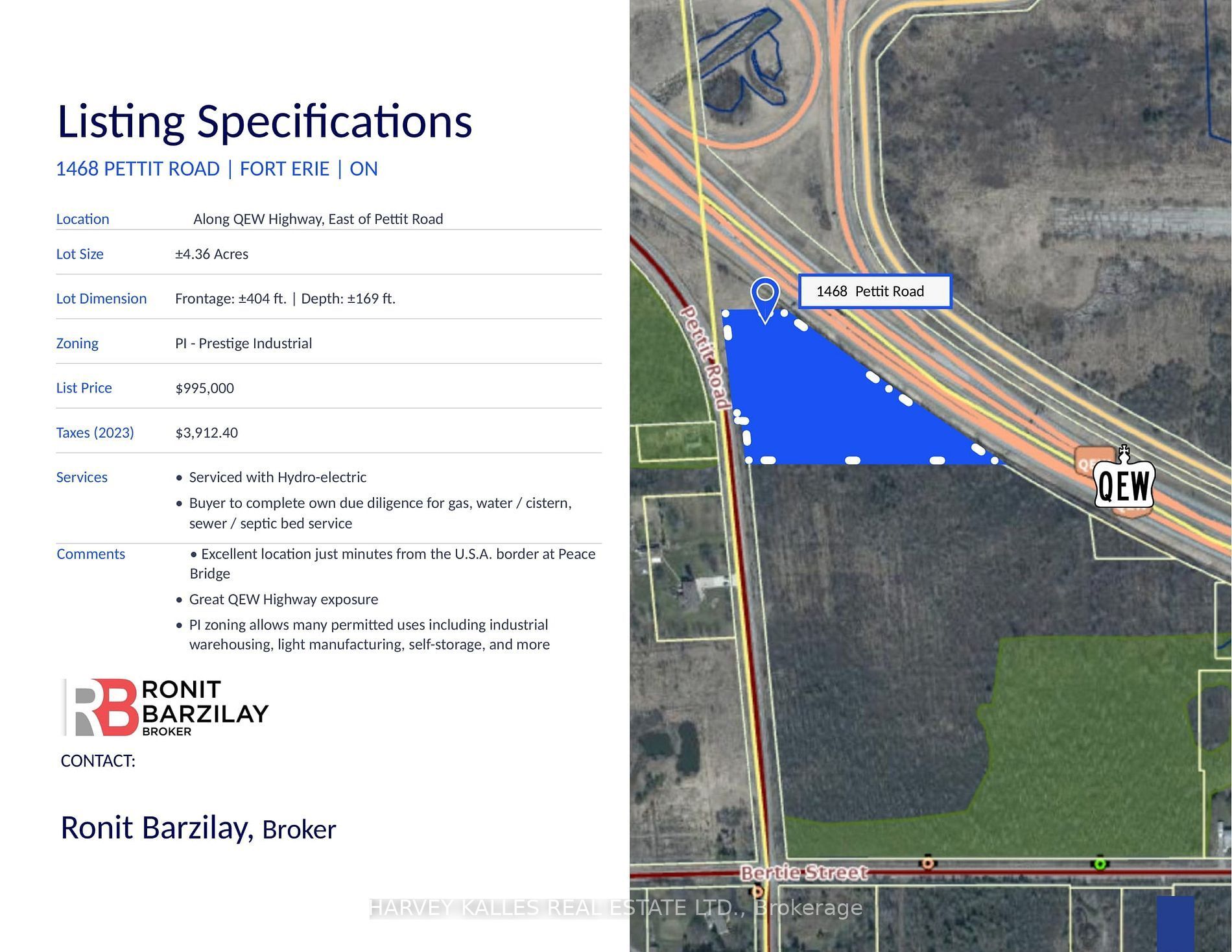 4. 36 acres vacant industrial land available. Zoned prestige industrial and located along the qew highway at pettit road with excellent qew highway exposure in fort erie, on. Great location just minutes from the usa border at peace bridge. Pi zoning allows many permitted uses including industrial warehousing, light manufacturing, self-storage, and more. The property is serviced with hydro-electric. Buyer to complete own due diligence for gas, water/cistern & sewer/septic bed services. Incredible opportunity to build or hold for future development.
