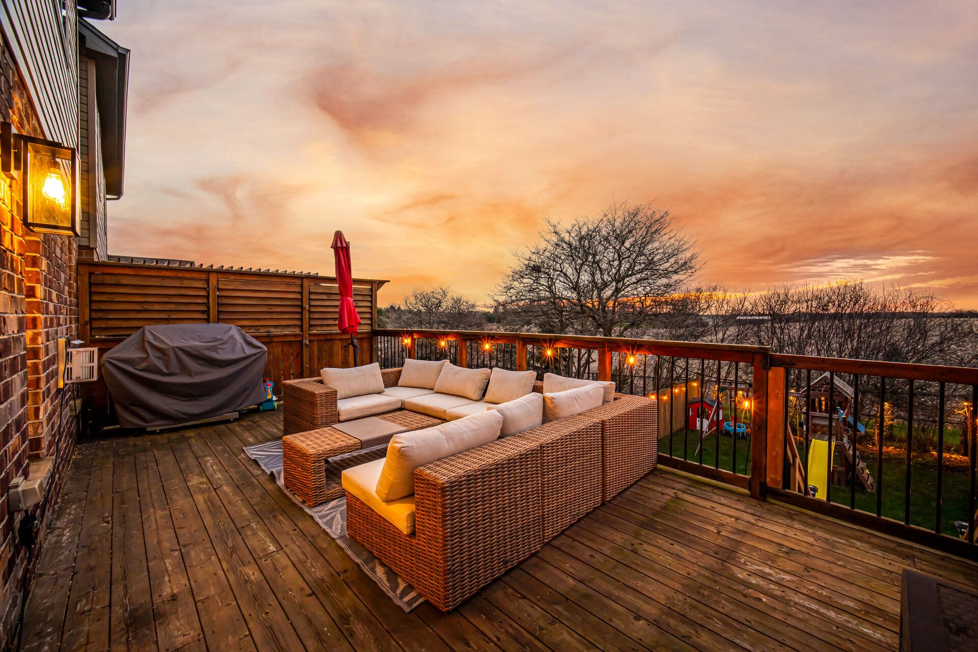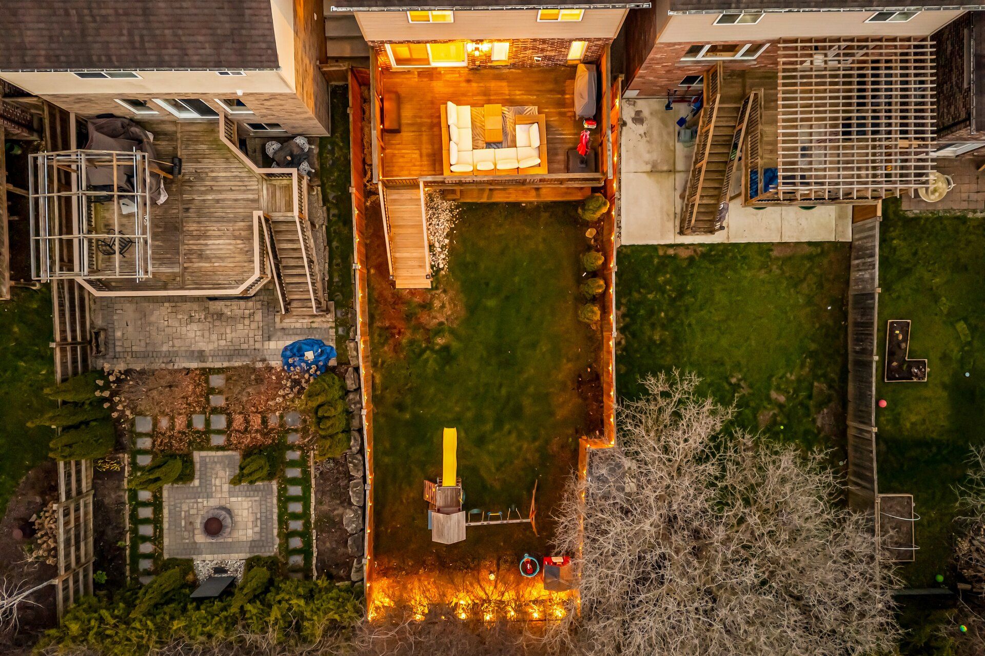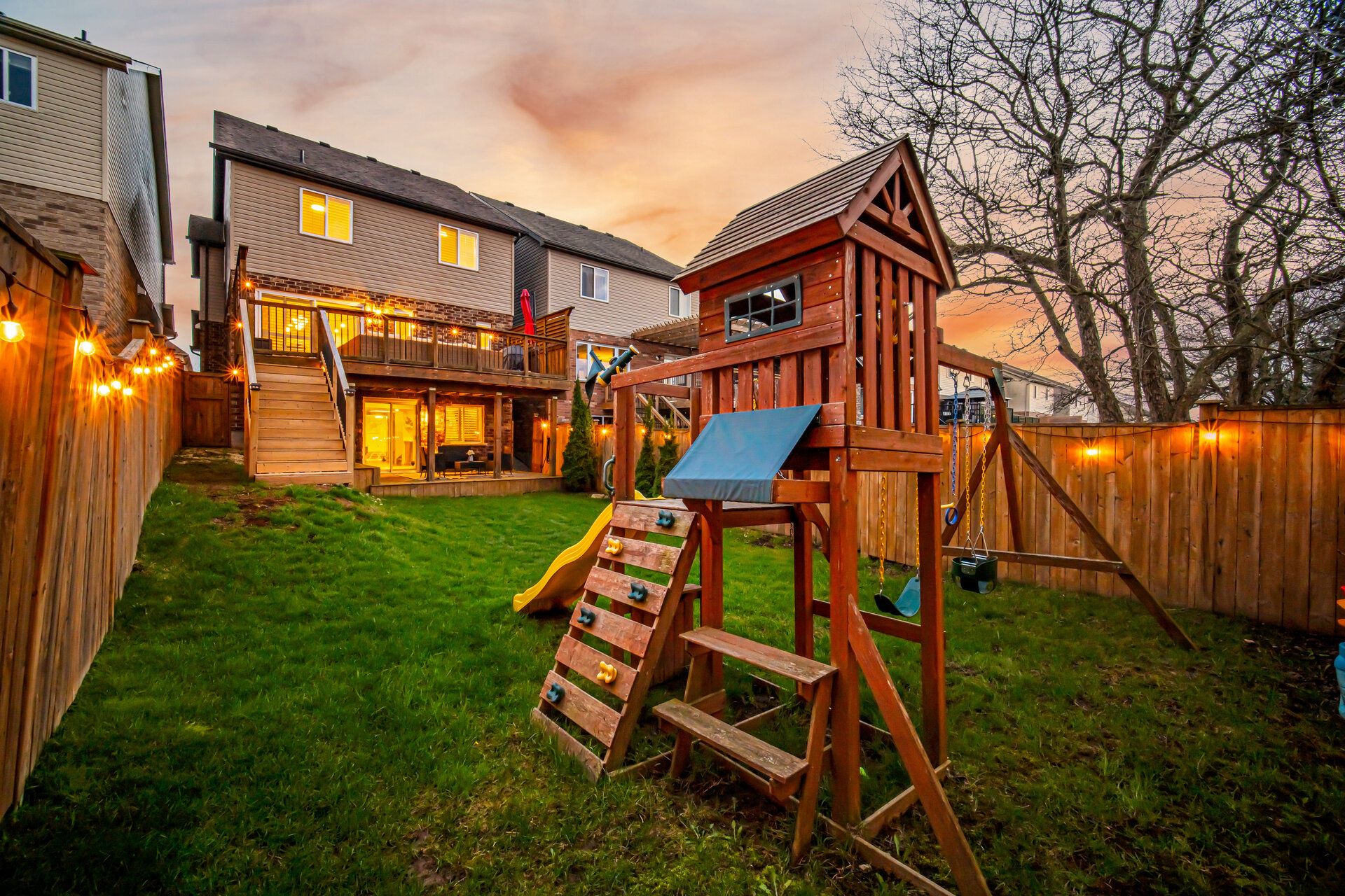 • Private backyard retreat with mature trees and expansive decks for relaxation.