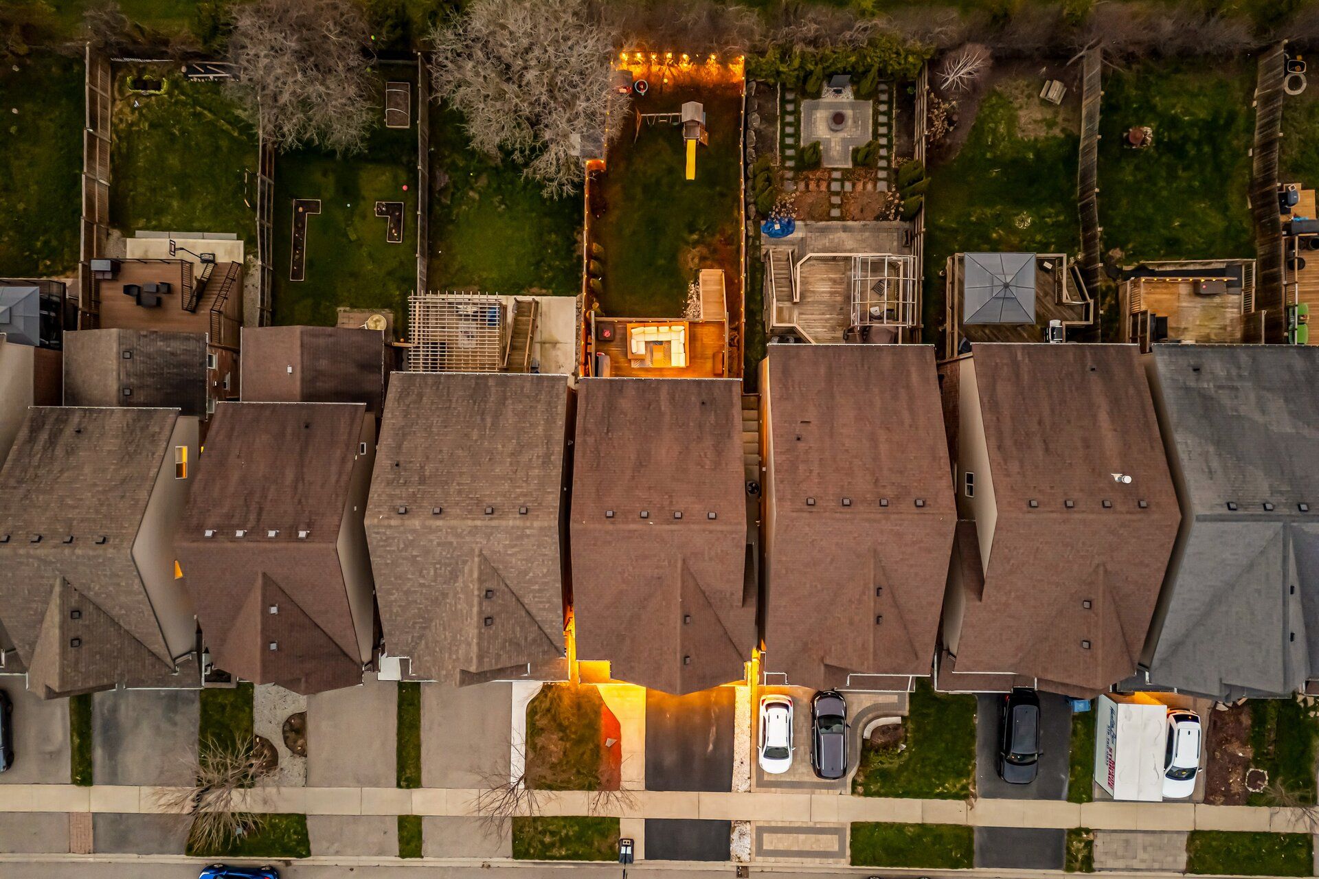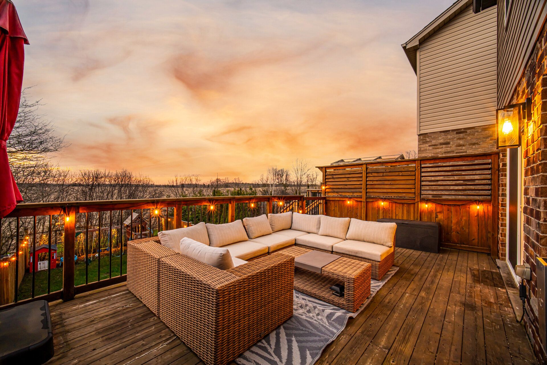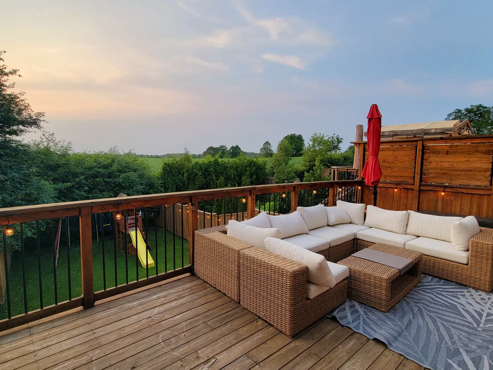 • Private backyard retreat with mature trees and expansive decks for relaxation.