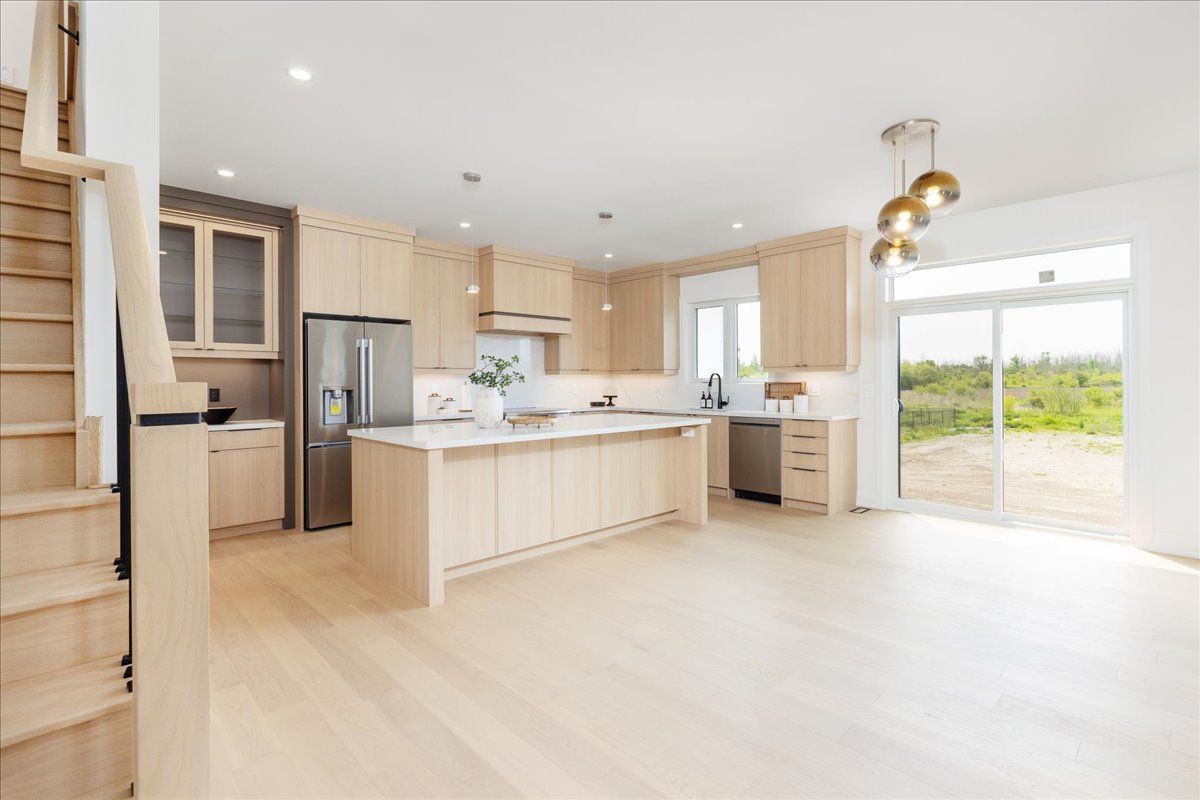 This brand new lakeside home is move in ready! Situated on a 1/2 acre lot in a community of fine lakefront residences this gorgeous 2500sq' bungaloft design backs onto a 40 acre countryside setting bringing nature to your doorstep. Built by the highly rated builder, a & t homes the layout features 2 main level bedrooms including a spectacular primary suite, a spacious den for those looking to work from home, and a sun drenched great room design with kitchen island , smooth 9' ceilings and hardwood floors throughout. In addition the oak staircase to the second floor loft features 2 additional bedrooms. There are 3 full baths and a walk-in from the extra-large 750sq' double car garage to the conveniently located main level laundry. The walkup basement features a separate entry ideal for in-law access, 9' ceilings and a large open space making way for plenty of options for your future finishes. 6 brand new stainless steel appliances: fridge, stove, built in dishwasher, microwave, washer and dryer & tankless hot water heater. **bonus** buyer to receive a $1200 credit towards foyer and dining room light fixtures. All this by an excellent experienced builder with a reputation for fine quality homes. Seller would consider finishing the basement.