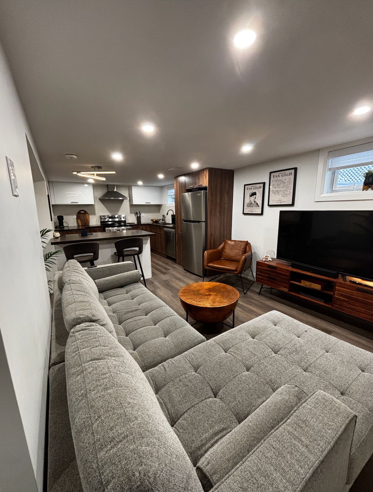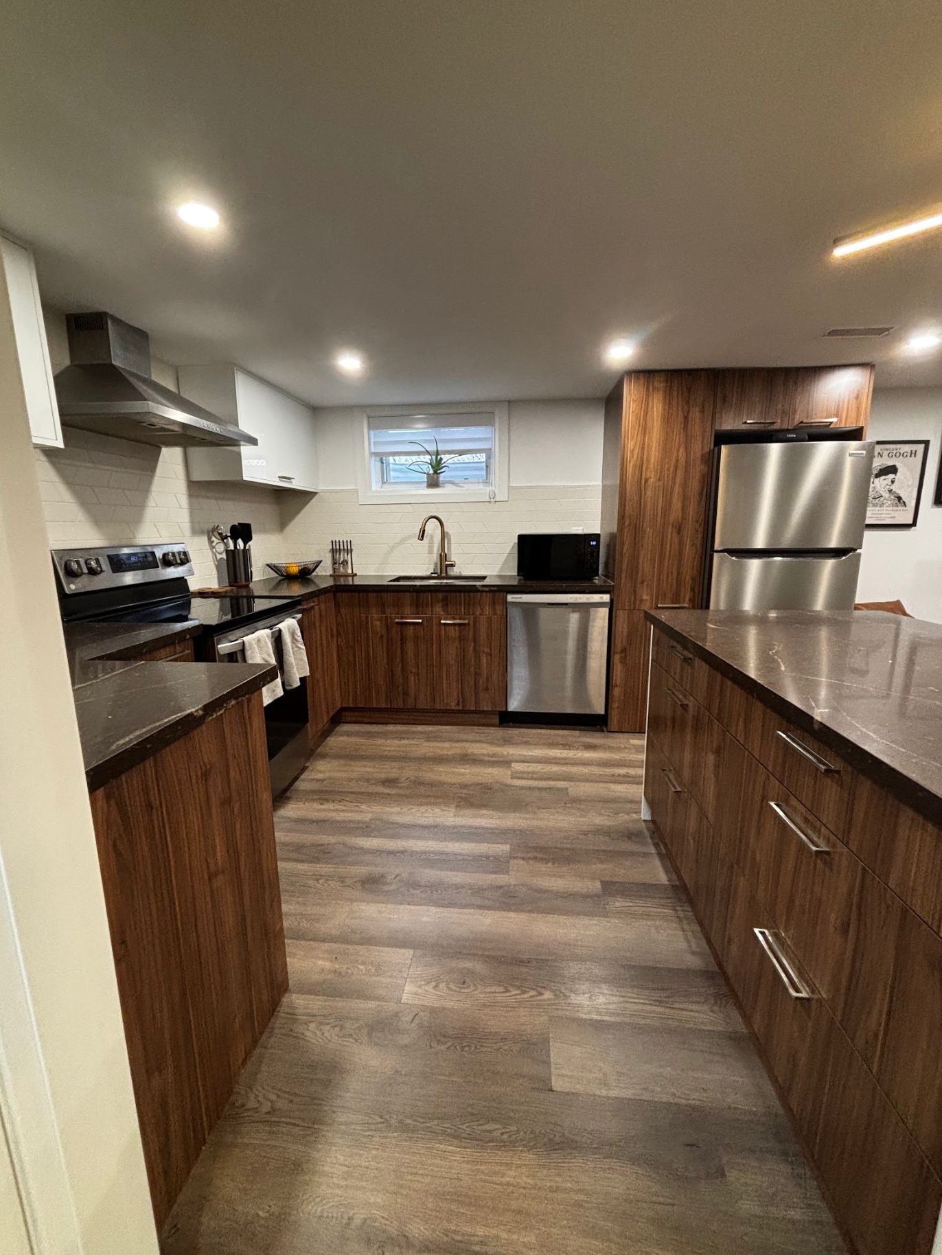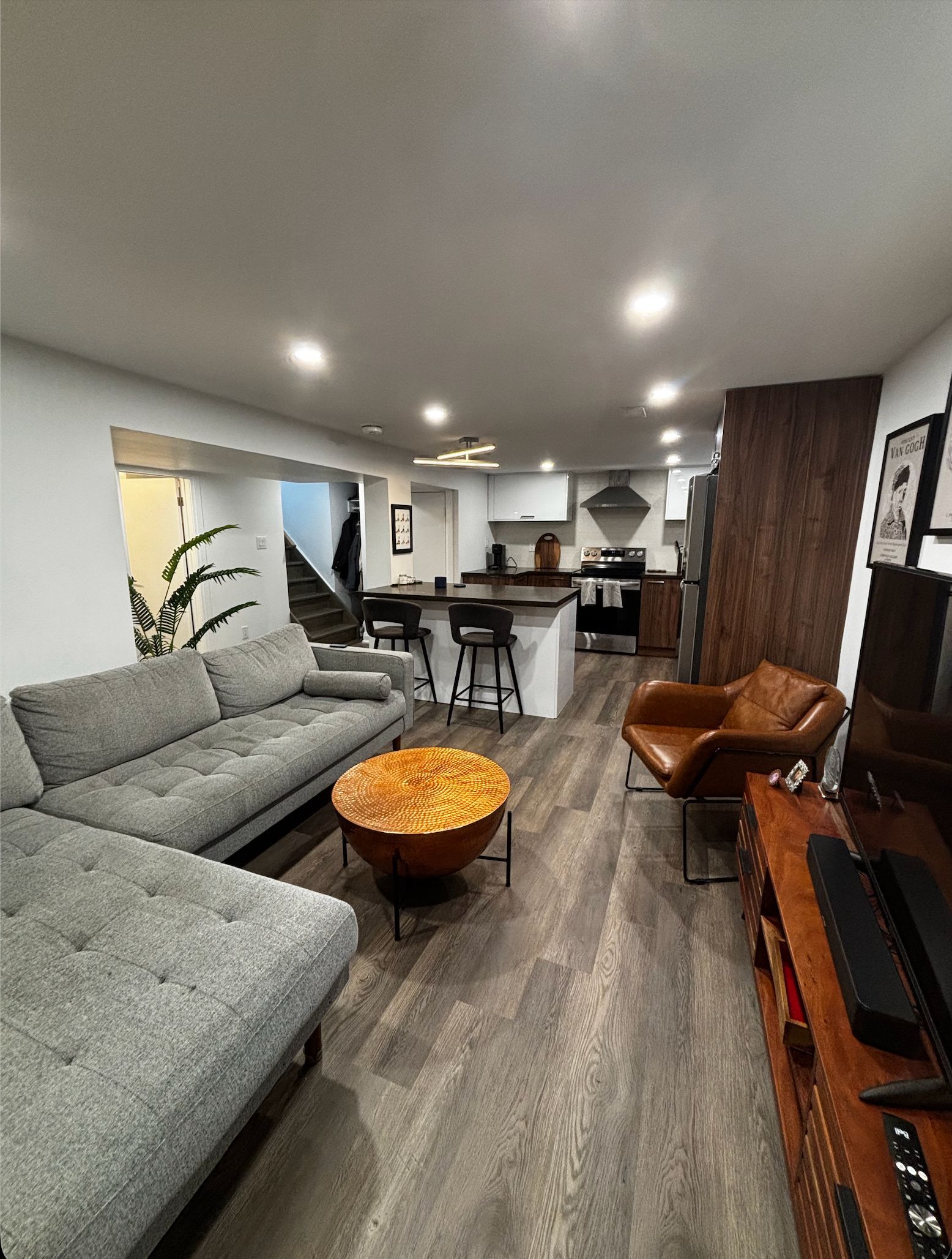 Beautifully updated and recently renovated two-bedroom legal lower unit featuring a private, separate entrance and a bright, modern interior. Ideally located close to local amenities, transit, and with quick access to highway 401, this unit offers comfortable and convenient living. The open-concept kitchen and living area provides a functional layout for everyday living. The kitchen is equipped with stainless steel appliances, quartz countertops, tile backsplash, pot lighting, and a convenient breakfast bar. The living room is bright and welcoming, highlighted by a large window and modern pot lighting. This unit also offers the convenience of an in-suite laundry closet, two well-sized bedrooms, and a stylish 3-piece bathroom featuring a tiled walk-in shower. Enjoy access to the shared backyard, perfect for relaxing outdoors, and one dedicated parking space is included. Lower unit tenant pays 40% of utilties.