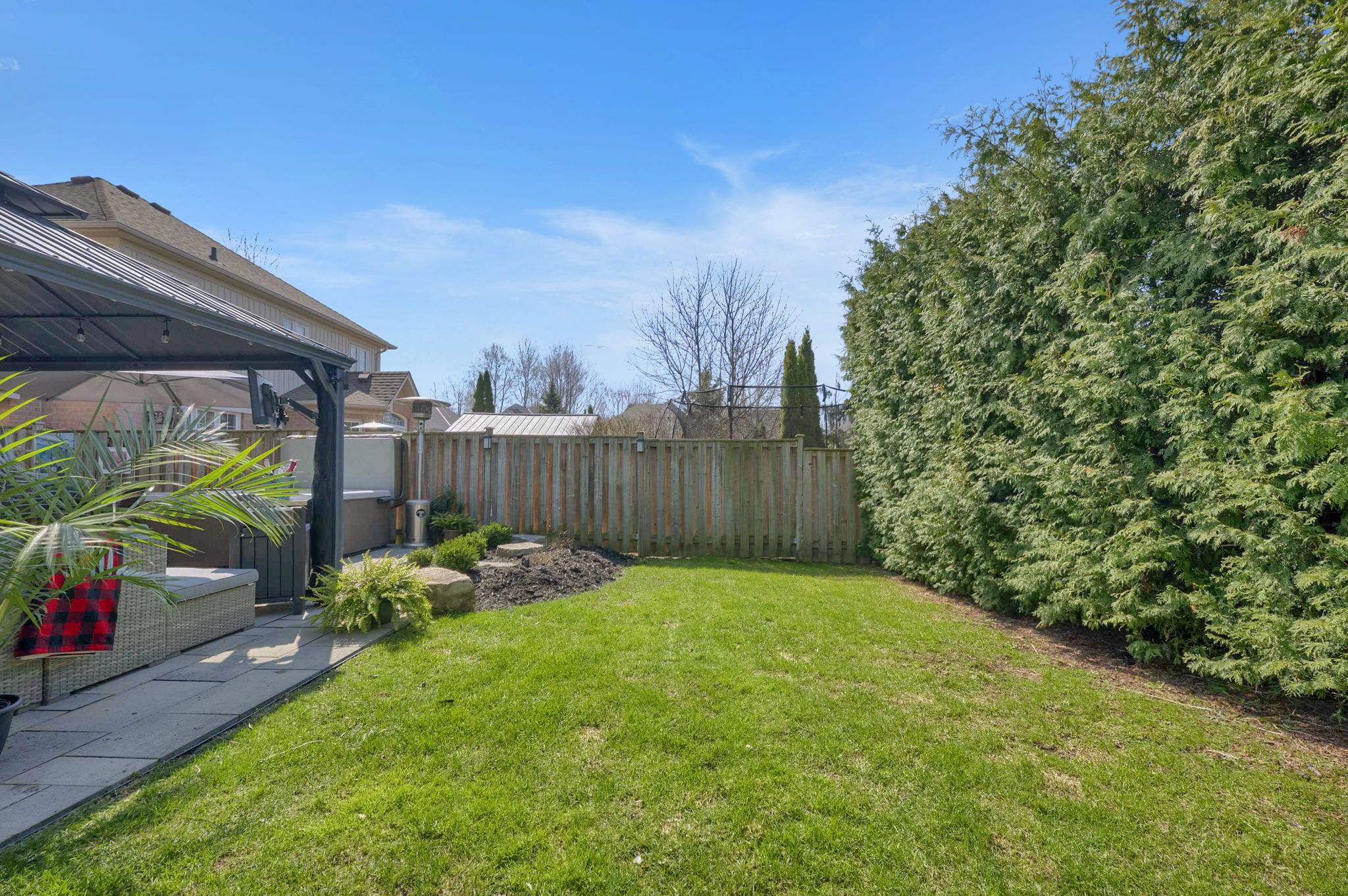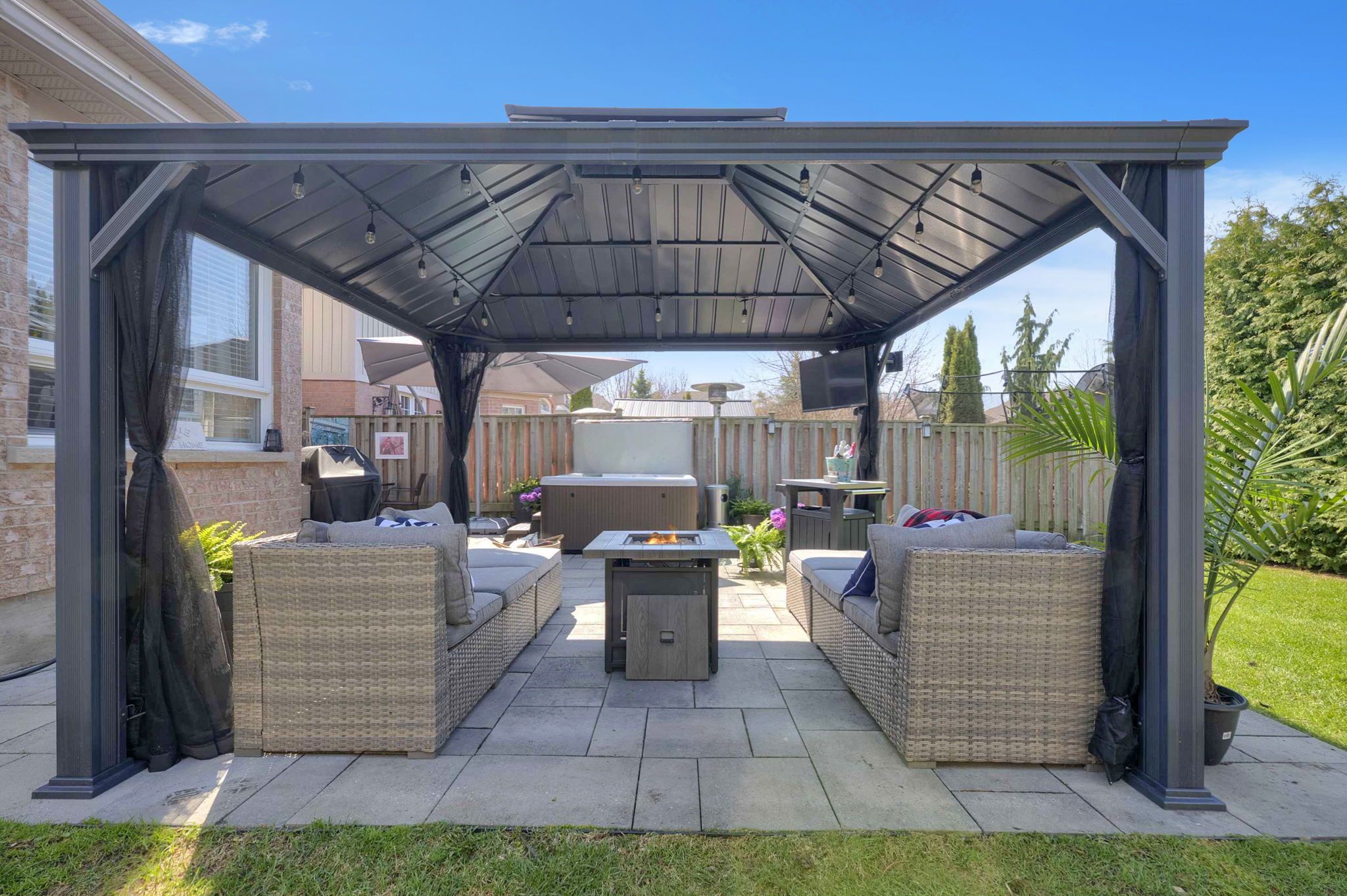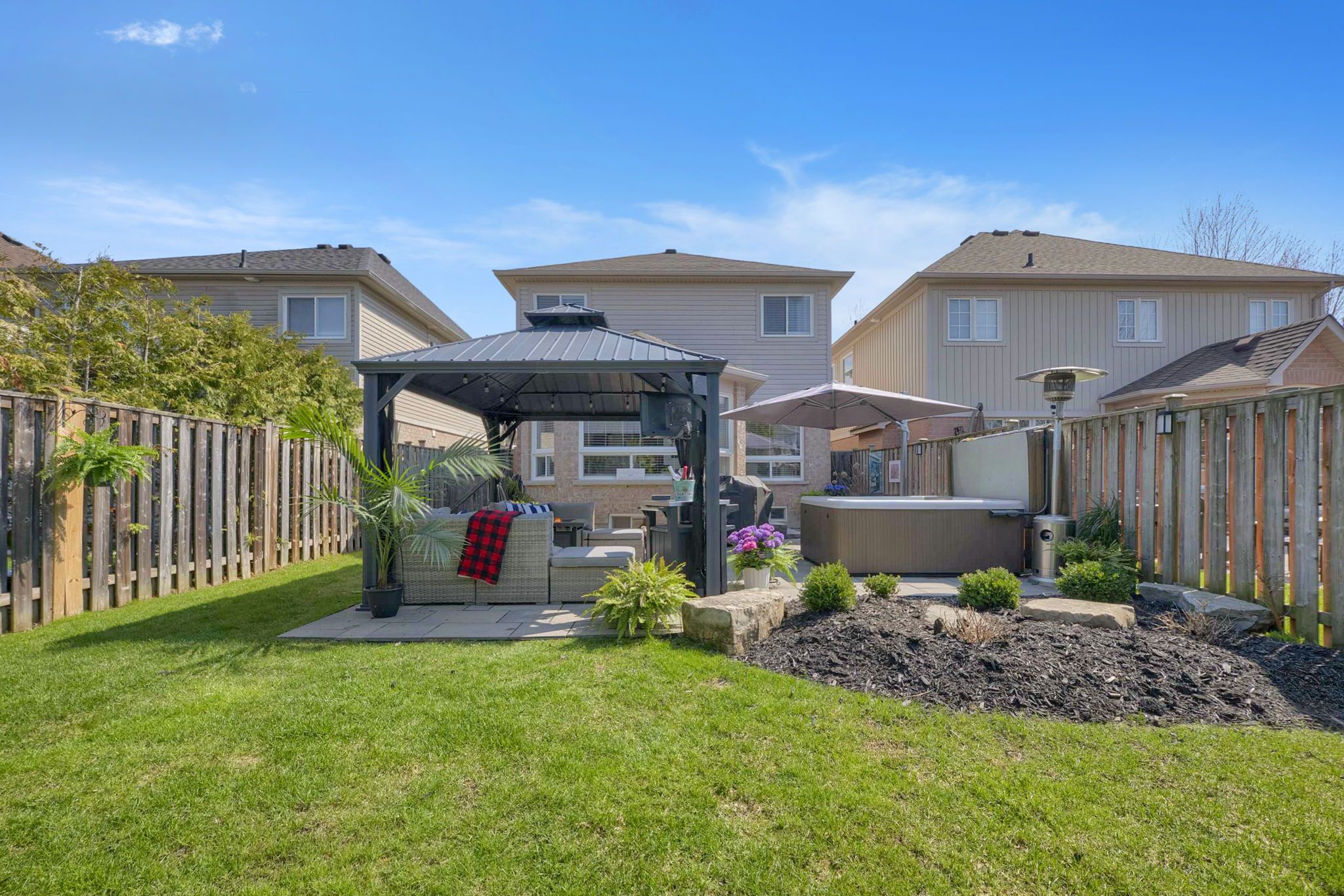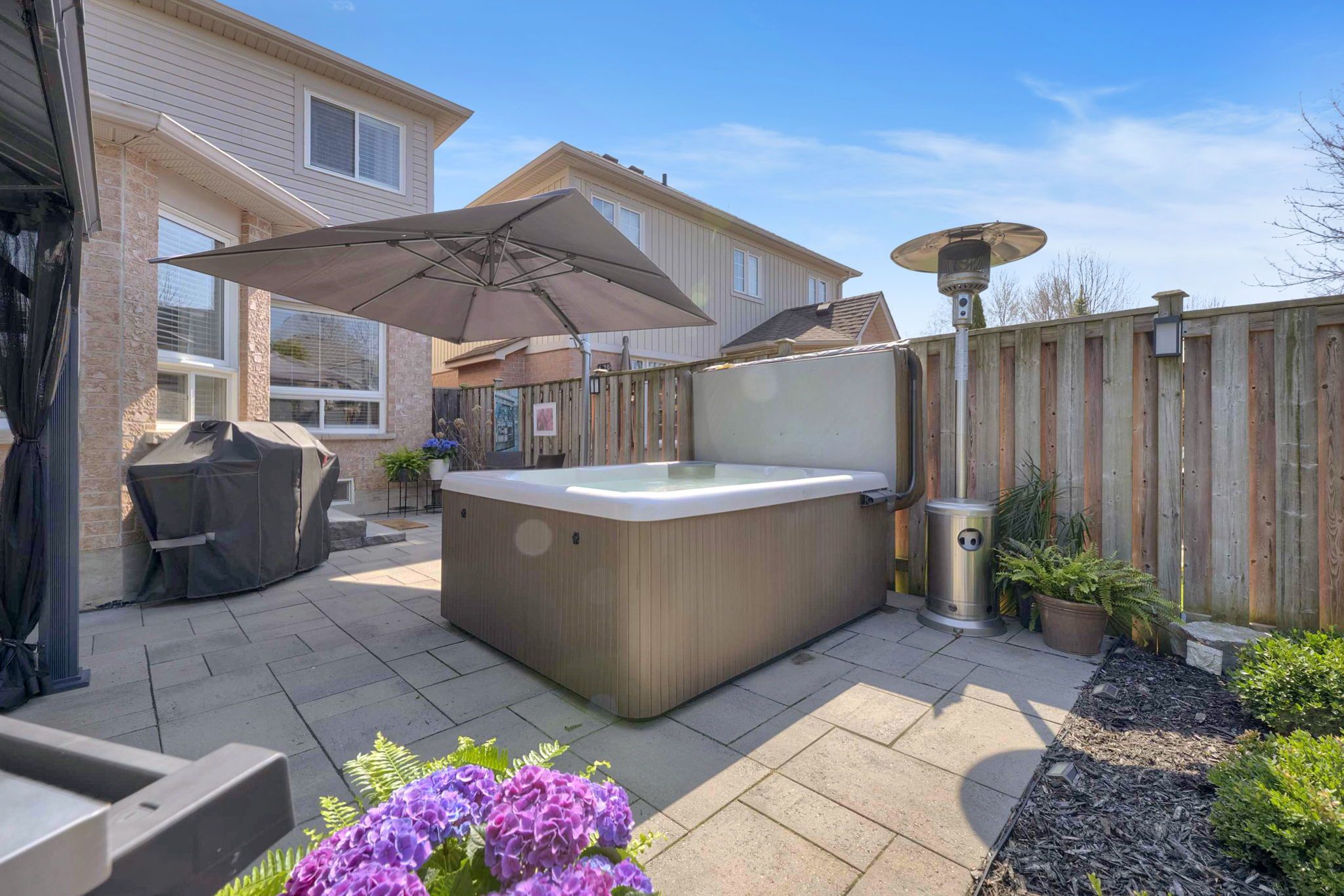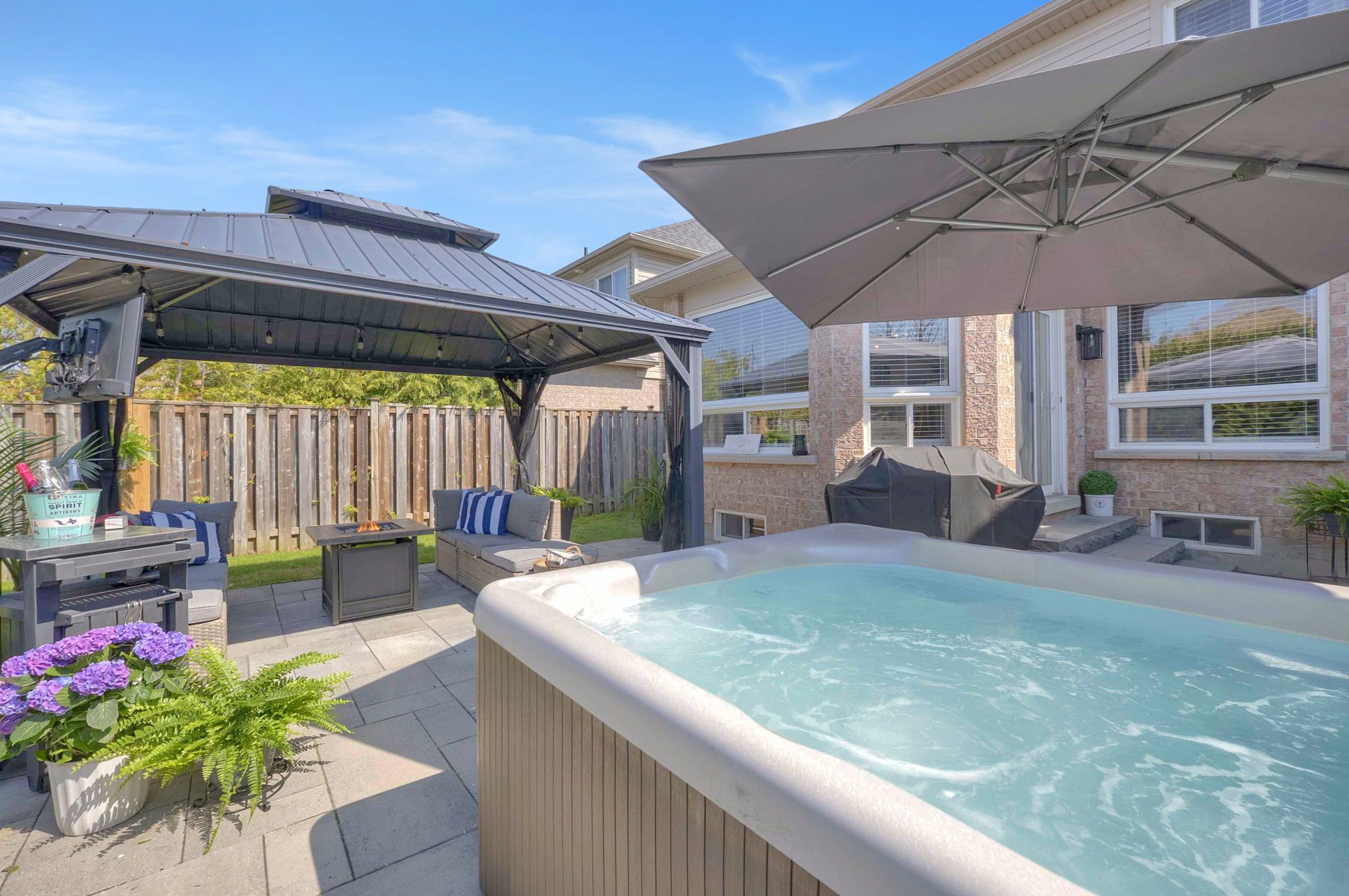• Private backyard retreat featuring professional landscaping and a hot tub.