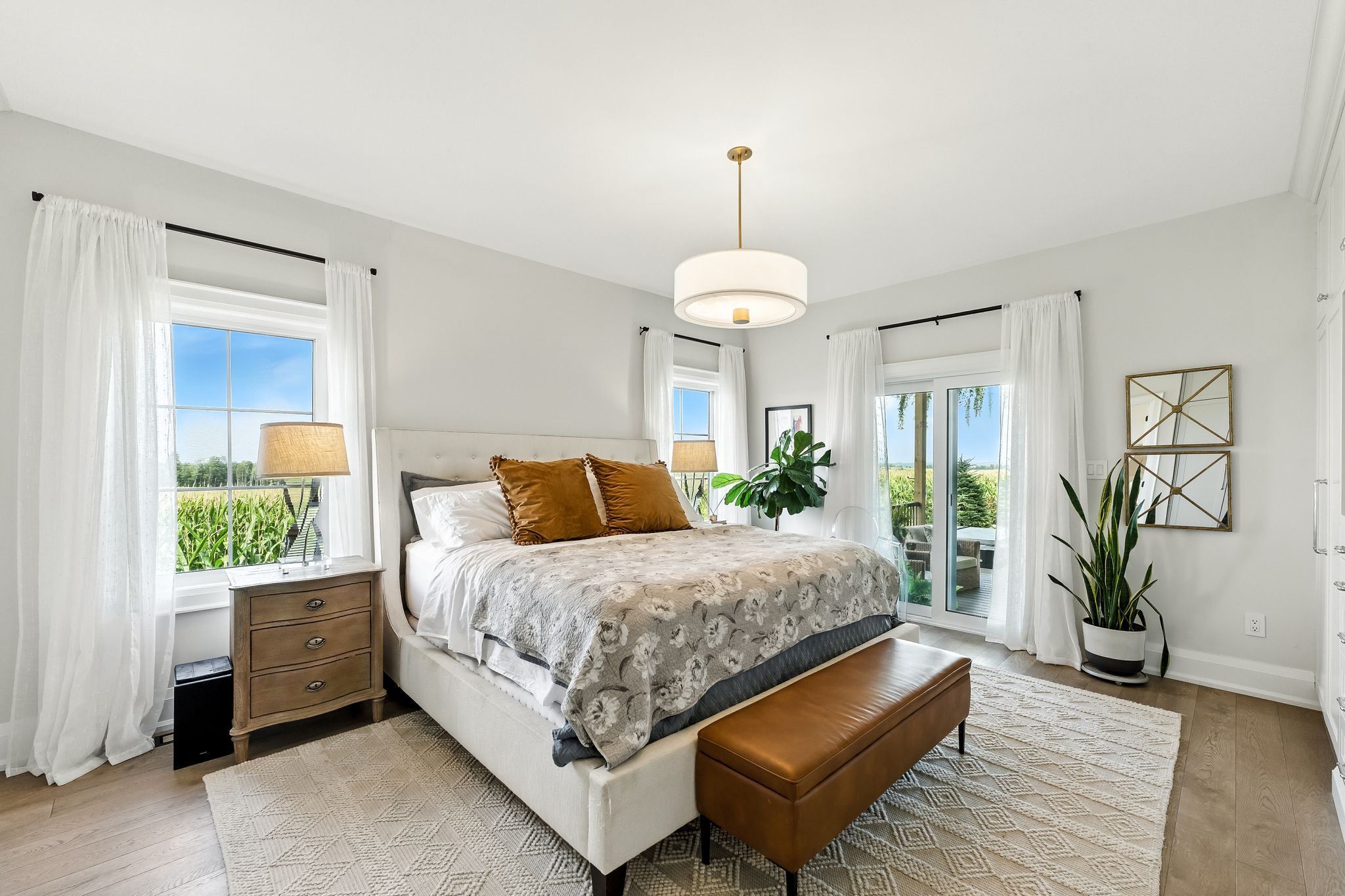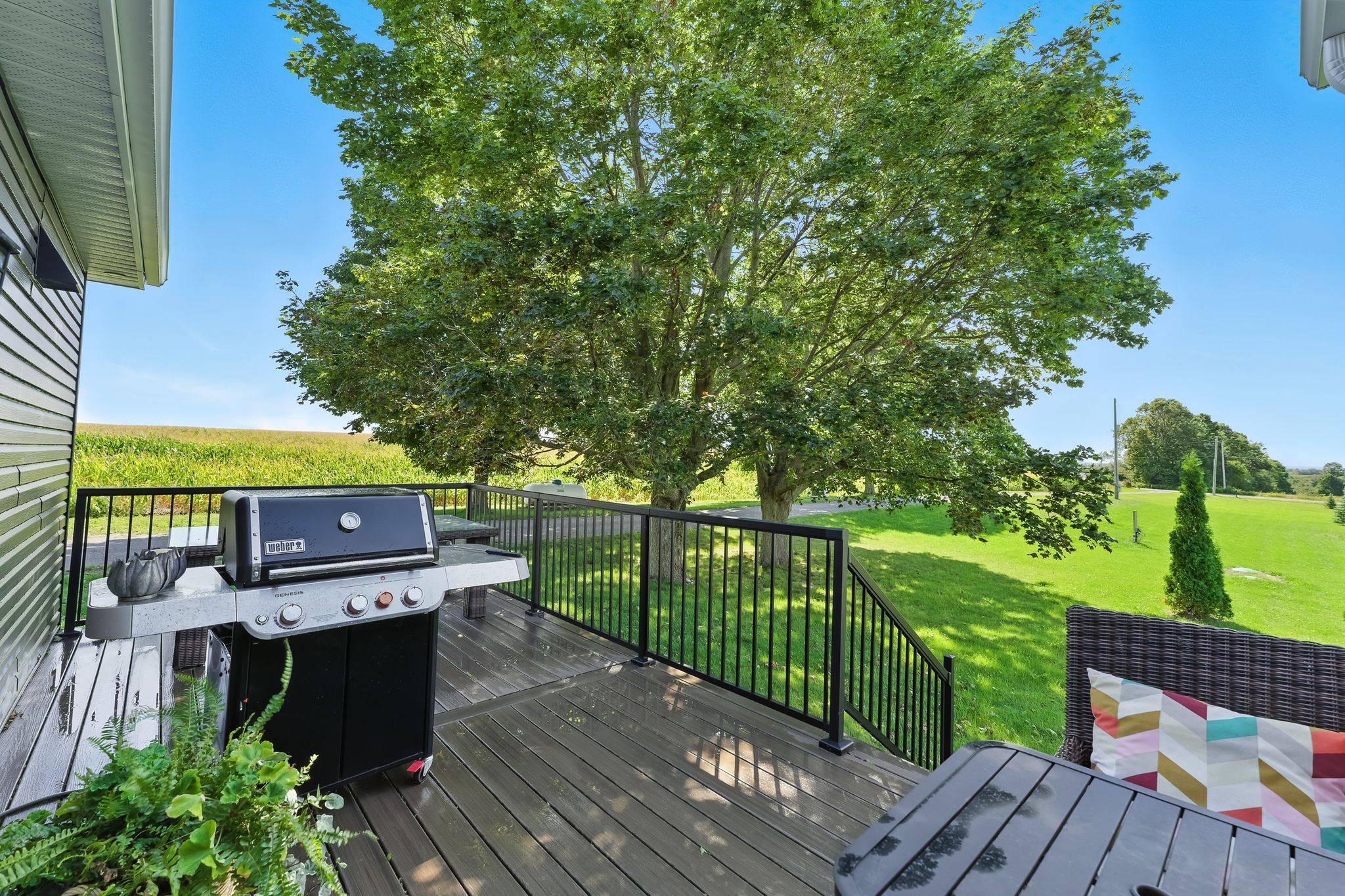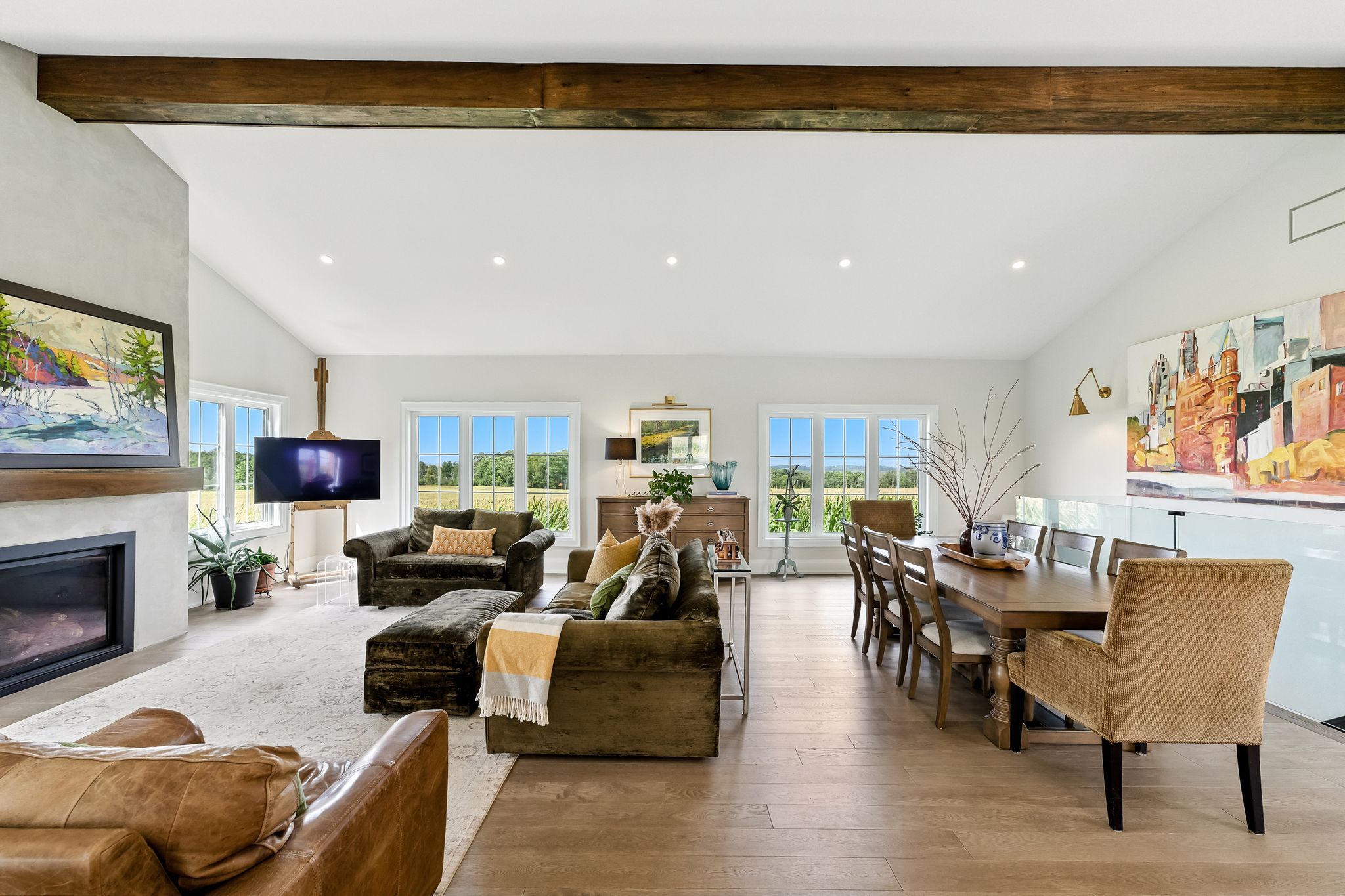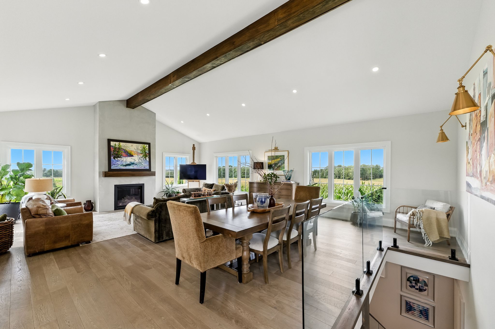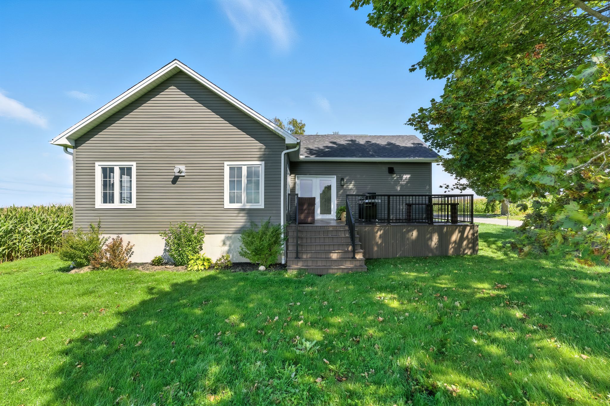 Welcome to this custom-built luxury bungalow on 1. 54 acres of private countryside, offering modern comfort with timeless rural charm. A tree-lined driveway leads to beautifully landscaped grounds, a welcoming front porch, & multiple outdoor living spaces, including a raised deck & spacious patio for entertaining. The main level of this home is thoughtfully designed to combine everyday functionality with elegant style. A welcoming foyer with a double closet leads into the open-concept living spaces, where soaring ceilings with wood beams, expansive windows, & a striking fireplace create a bright & inviting atmosphere. The chefs kitchen is a true highlight, featuring high-end appliances, custom cabinetry, a large centre island, & a walkout to the deck. Seamlessly connected, the dining area & living room provide an ideal setting for gatherings, with natural light flooding the space from every angle. The primary retreat offers built-in cabinetry, a luxurious 5-piece ensuite with soaker tub & glass shower, & private access to the deck. A second bedroom, currently staged as a home office, adds convenience for guests. Completing the main floor is a well-equipped laundry & mudroom with direct access to the attached garage. The fully finished lower level extends the living space beautifully. A wide staircase with glass railing opens to the rec room, complete with a sleek wet bar, custom built-in shelving, & a cozy fireplace. A glass-enclosed gym provides a dedicated space for fitness while maintaining an open, modern feel. Two generously sized bedrooms, each with large above-grade windows, are complemented by a stylish 4-piece bathroom. The lower level offers the ideal blend of relaxation, recreation, & practicality, while also housing a utility room for added convenience. With an attached garage plus a detached workshop, this property is ideal for both relaxation & practicality, all while surrounded by sweeping farmland views & just minutes from nearby amenities.