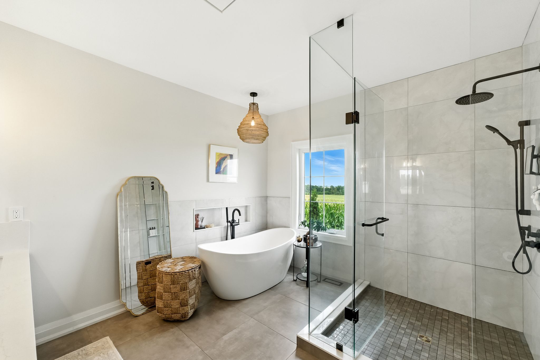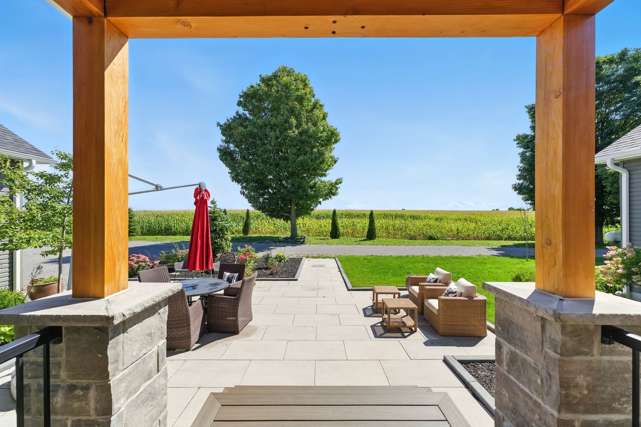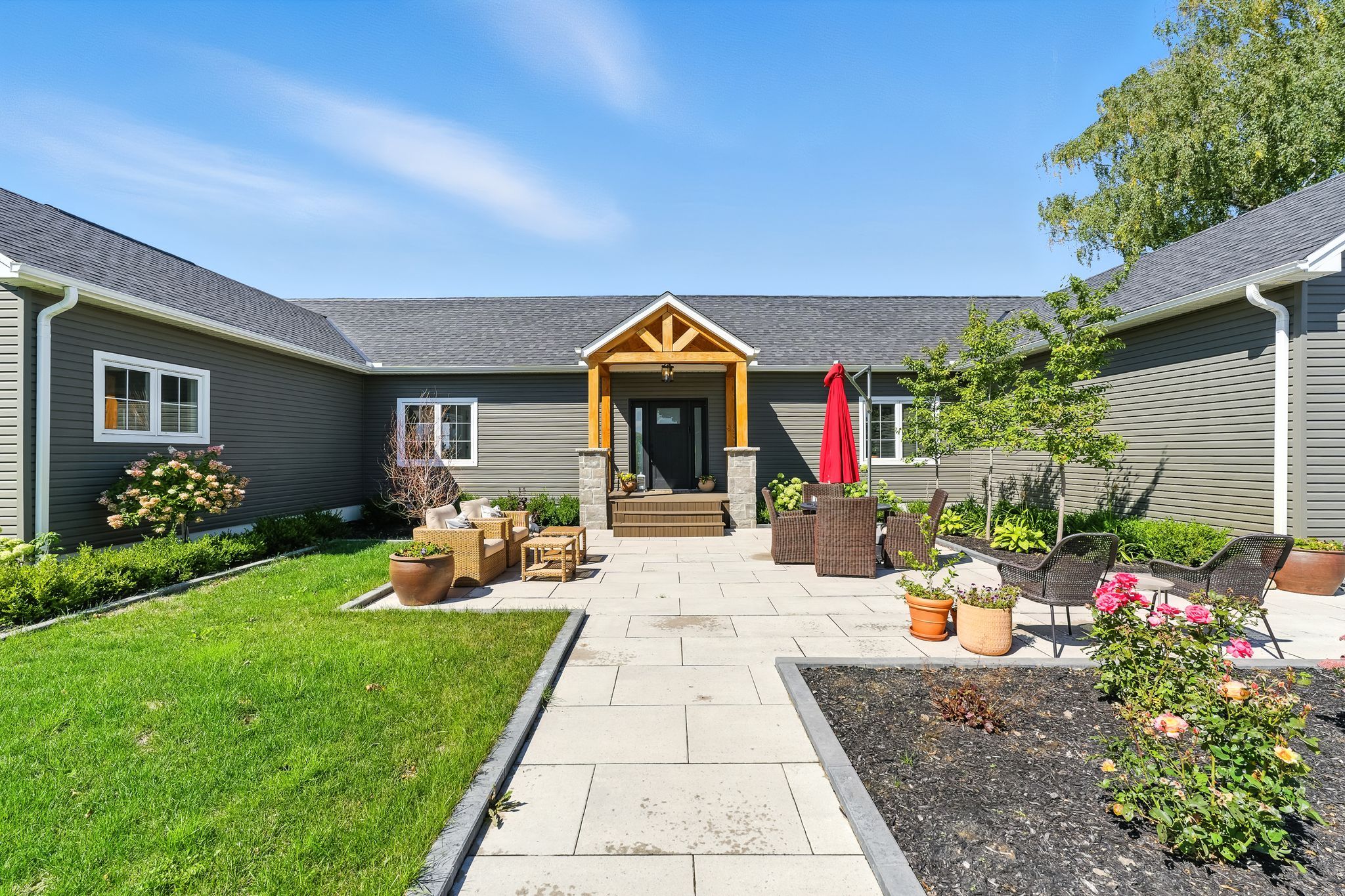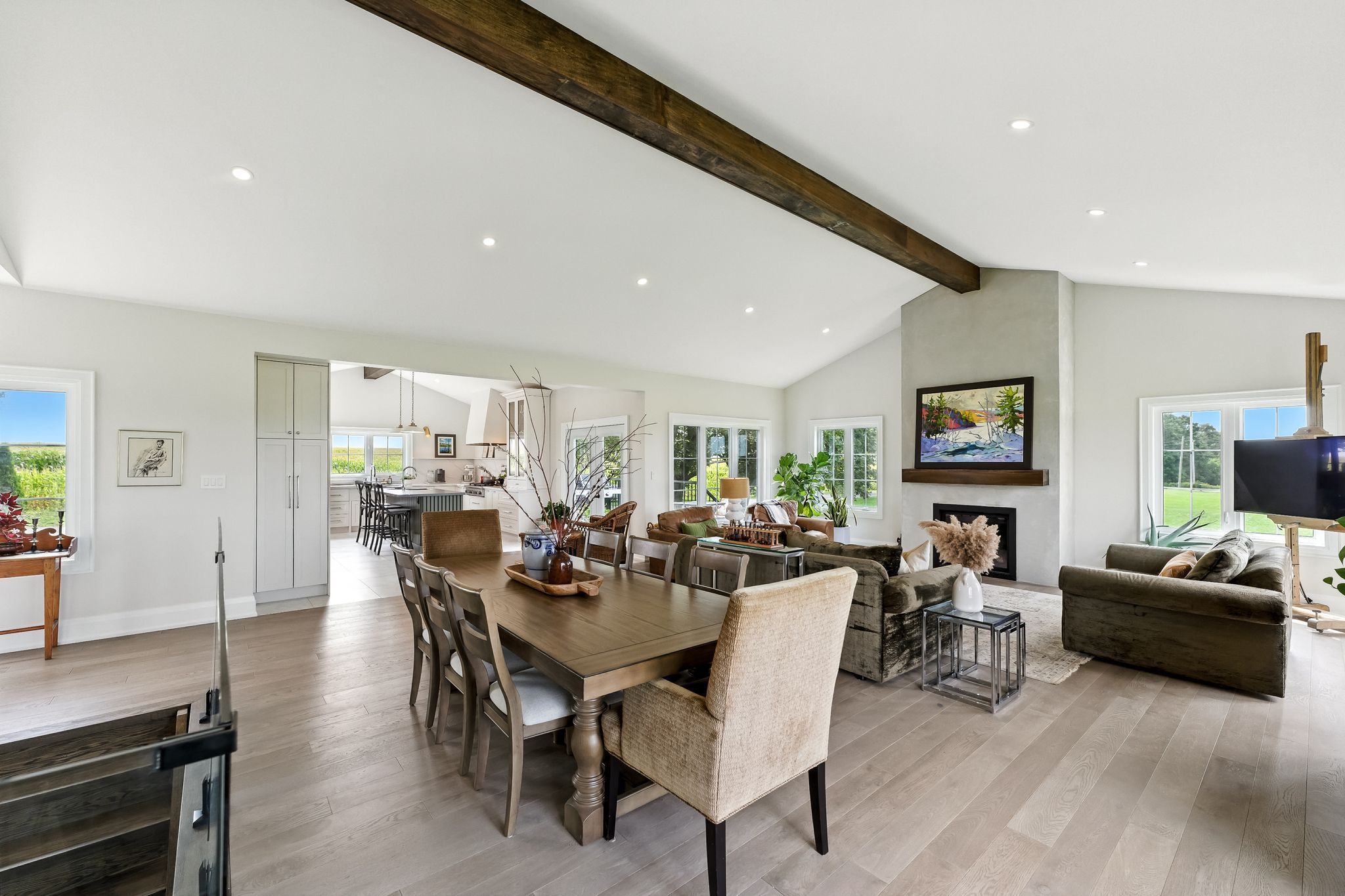 Welcome to this custom-built luxury bungalow on 1. 54 acres of private countryside, offering modern comfort with timeless rural charm. A tree-lined driveway leads to beautifully landscaped grounds, a welcoming front porch, & multiple outdoor living spaces, including a raised deck & spacious patio for entertaining. The main level of this home is thoughtfully designed to combine everyday functionality with elegant style. A welcoming foyer with a double closet leads into the open-concept living spaces, where soaring ceilings with wood beams, expansive windows, & a striking fireplace create a bright & inviting atmosphere. The chefs kitchen is a true highlight, featuring high-end appliances, custom cabinetry, a large centre island, & a walkout to the deck. Seamlessly connected, the dining area & living room provide an ideal setting for gatherings, with natural light flooding the space from every angle. The primary retreat offers built-in cabinetry, a luxurious 5-piece ensuite with soaker tub & glass shower, & private access to the deck. A second bedroom, currently staged as a home office, adds convenience for guests. Completing the main floor is a well-equipped laundry & mudroom with direct access to the attached garage. The fully finished lower level extends the living space beautifully. A wide staircase with glass railing opens to the rec room, complete with a sleek wet bar, custom built-in shelving, & a cozy fireplace. A glass-enclosed gym provides a dedicated space for fitness while maintaining an open, modern feel. Two generously sized bedrooms, each with large above-grade windows, are complemented by a stylish 4-piece bathroom. The lower level offers the ideal blend of relaxation, recreation, & practicality, while also housing a utility room for added convenience. With an attached garage plus a detached workshop, this property is ideal for both relaxation & practicality, all while surrounded by sweeping farmland views & just minutes from nearby amenities.