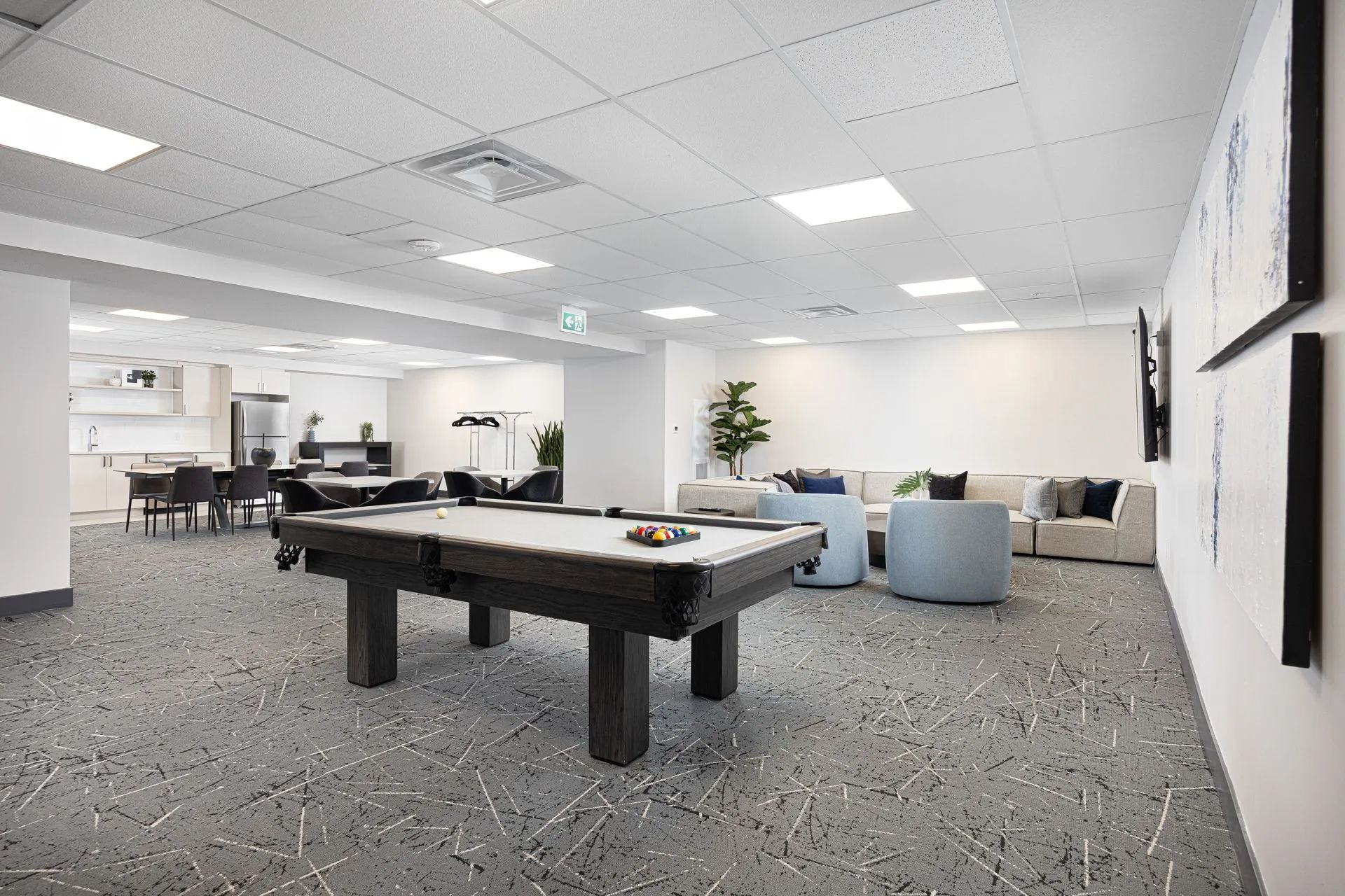 • Building amenities include a fully equipped fitness center and social room.