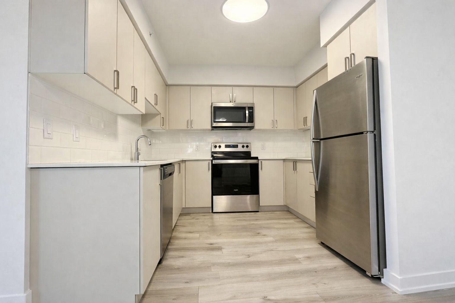 Modern living awaits at fourteen75 in this stylish 2 bedroom suite - 913 sq ft + 110 sq ft balcony. The open-concept layout showcases vinyl plank flooring, quartz countertops, stainless steel appliances, and expansive windows that flood the space with natural light. Step outside to a generously sized private balcony, perfect for relaxing or entertaining. Ideally located just five minutes from highway 401 and close to grocery stores, shopping, and everyday amenities. Building amenities include a fully equipped fitness centre and a social room. The unit is unfurnished, some photos are virtually staged.