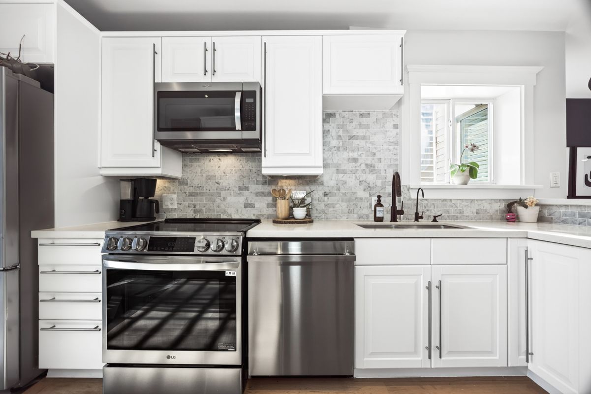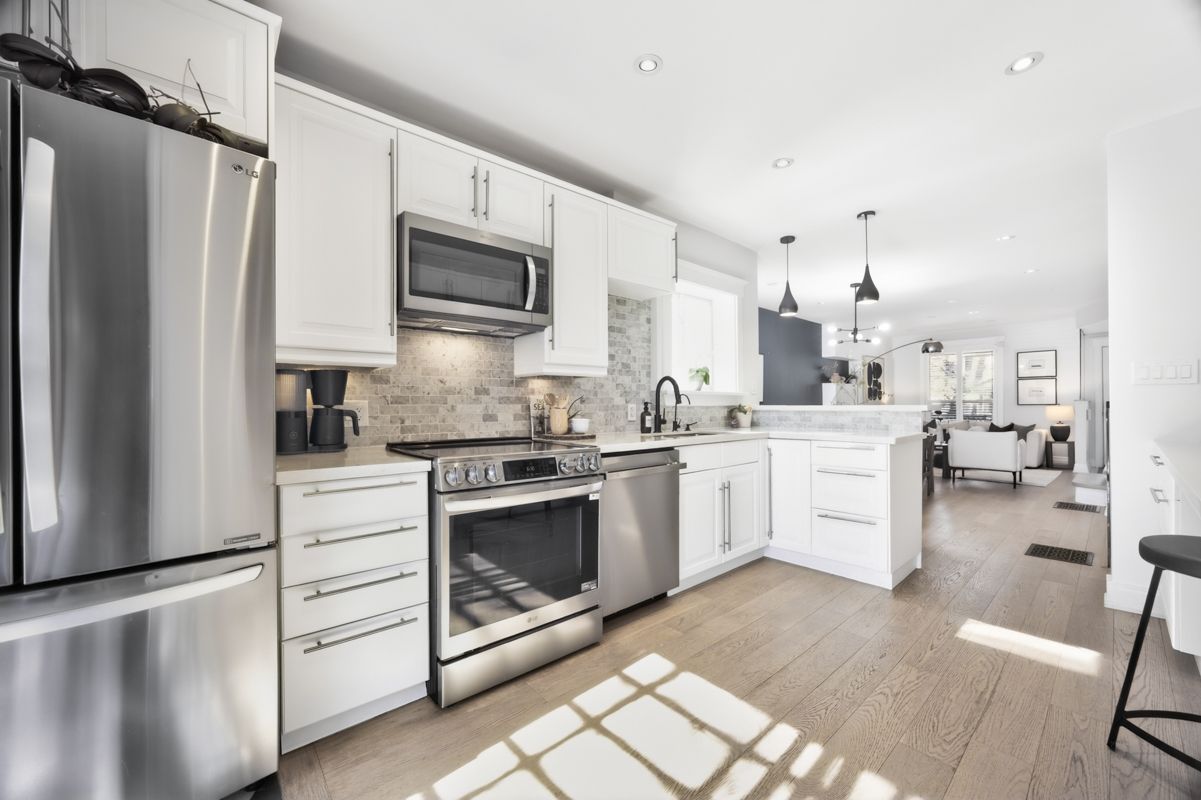 • Gourmet kitchen with quartz countertops and stainless steel appliances.