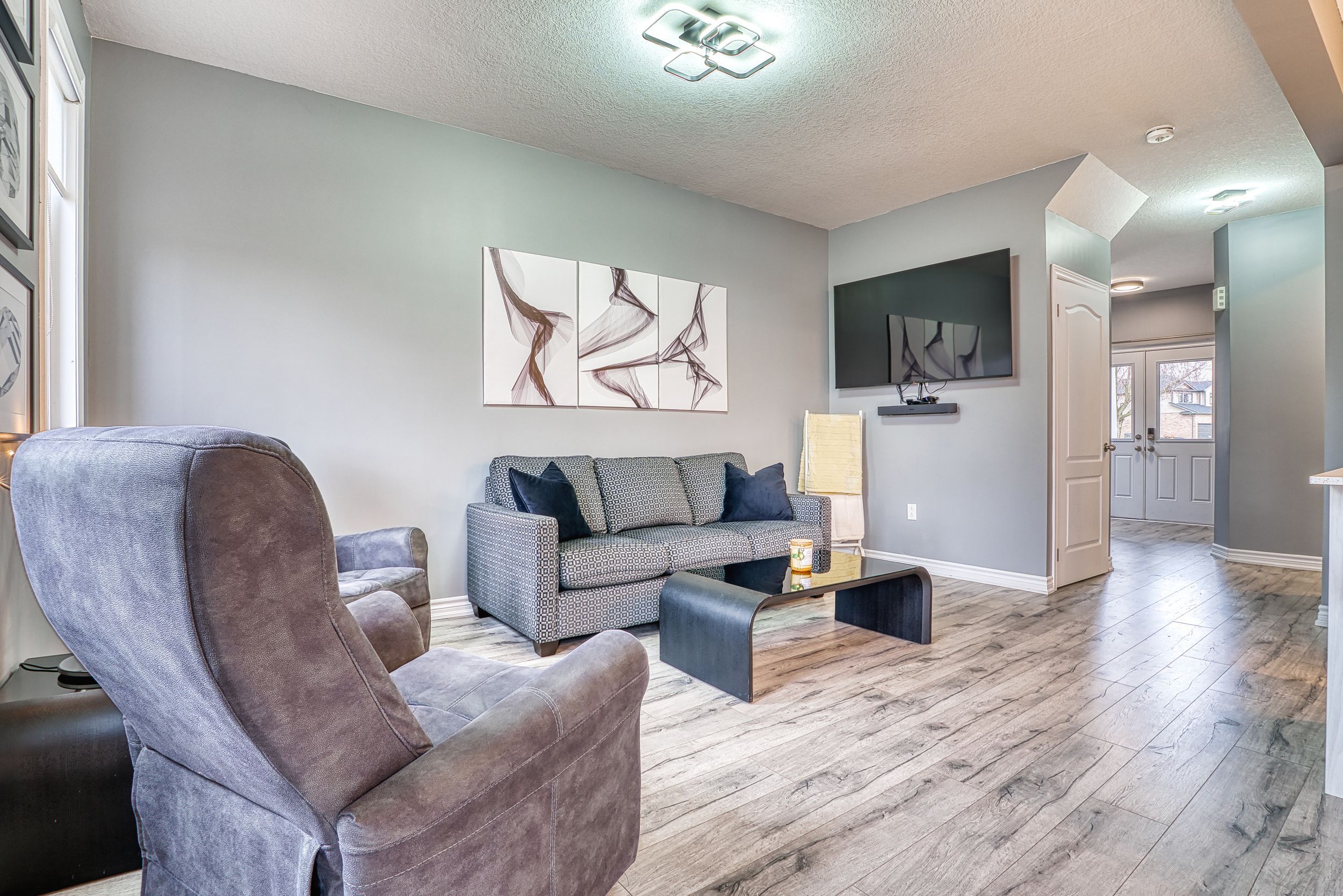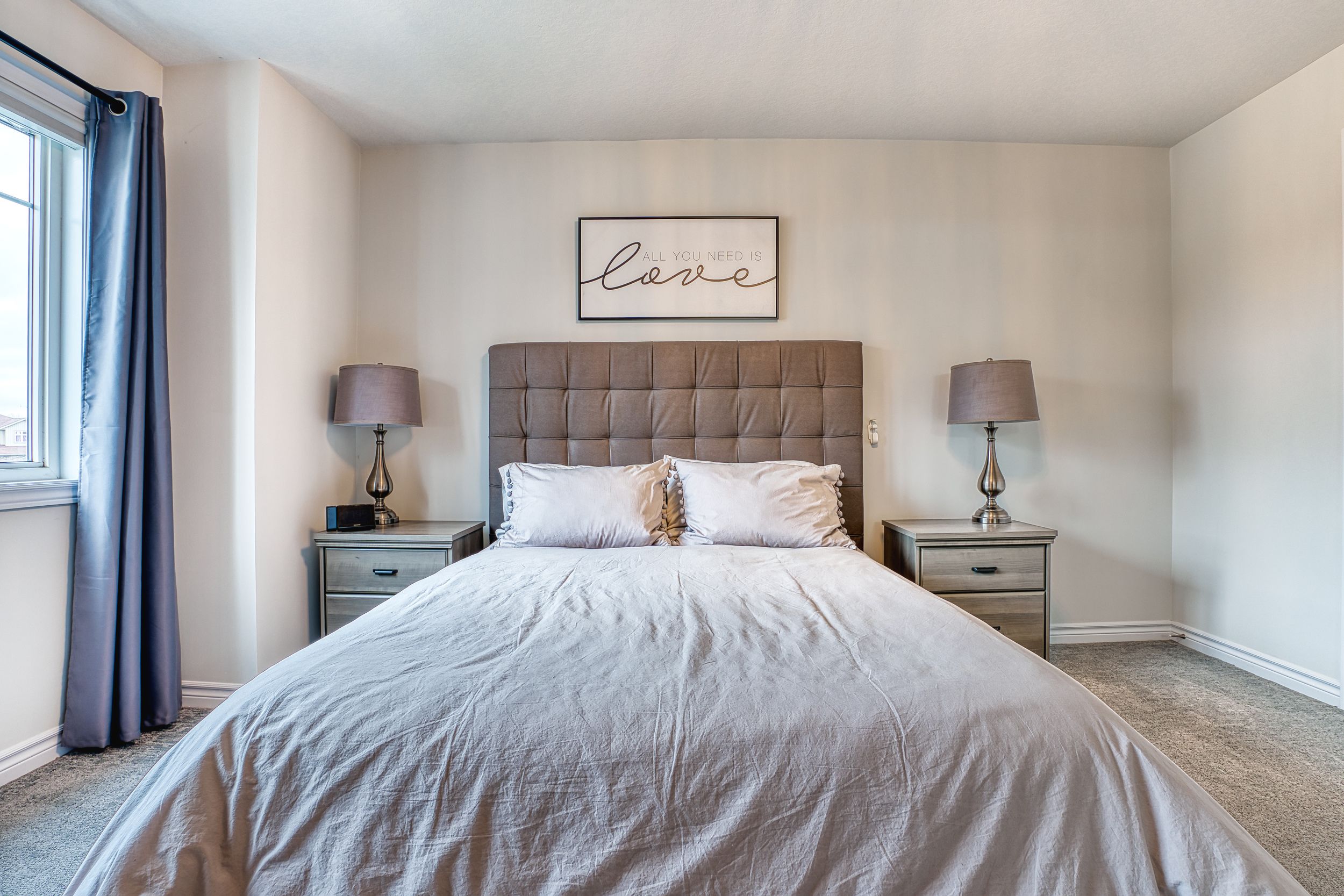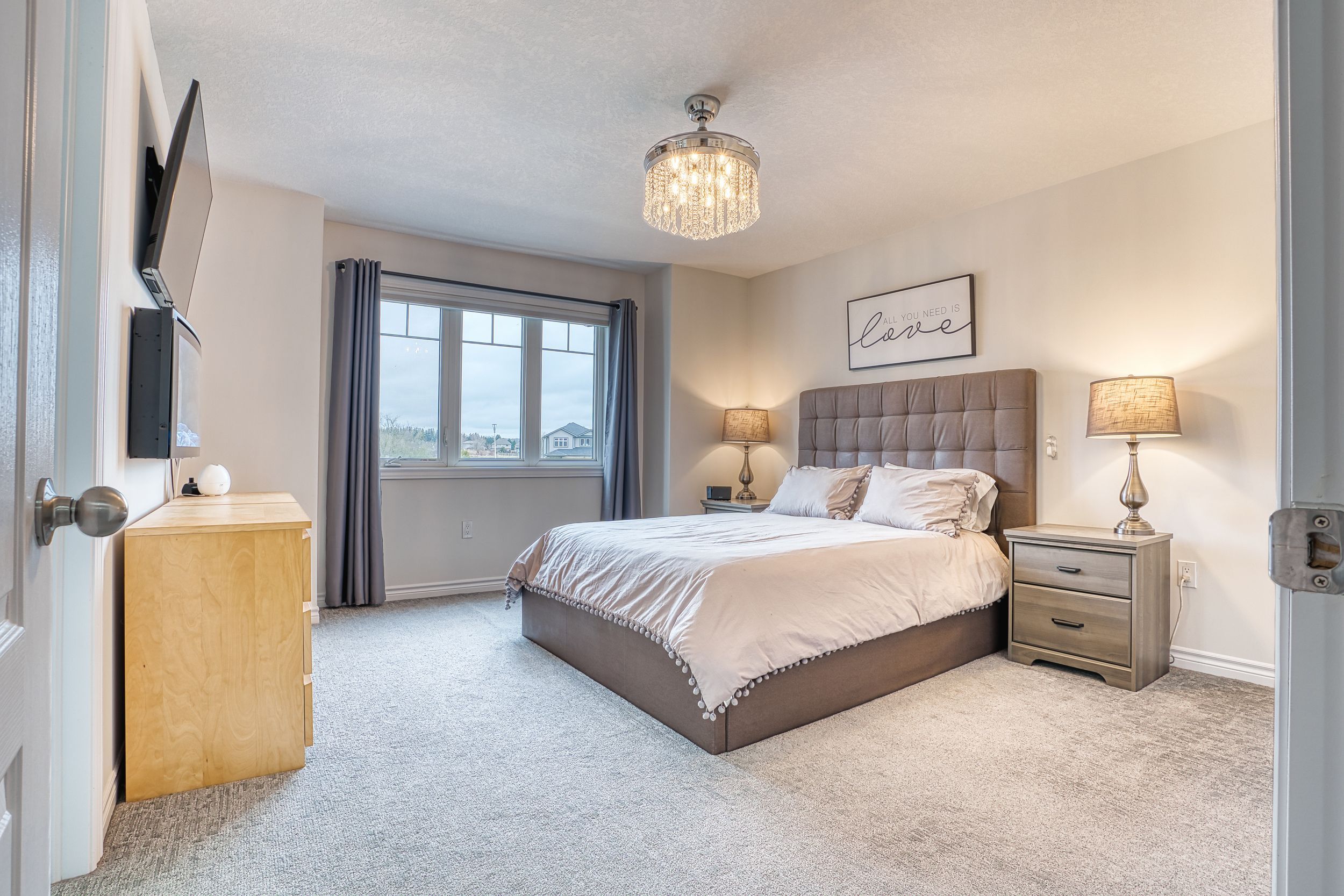 • Spacious primary bedroom features electric fireplace and luxurious ensuite bathroom.