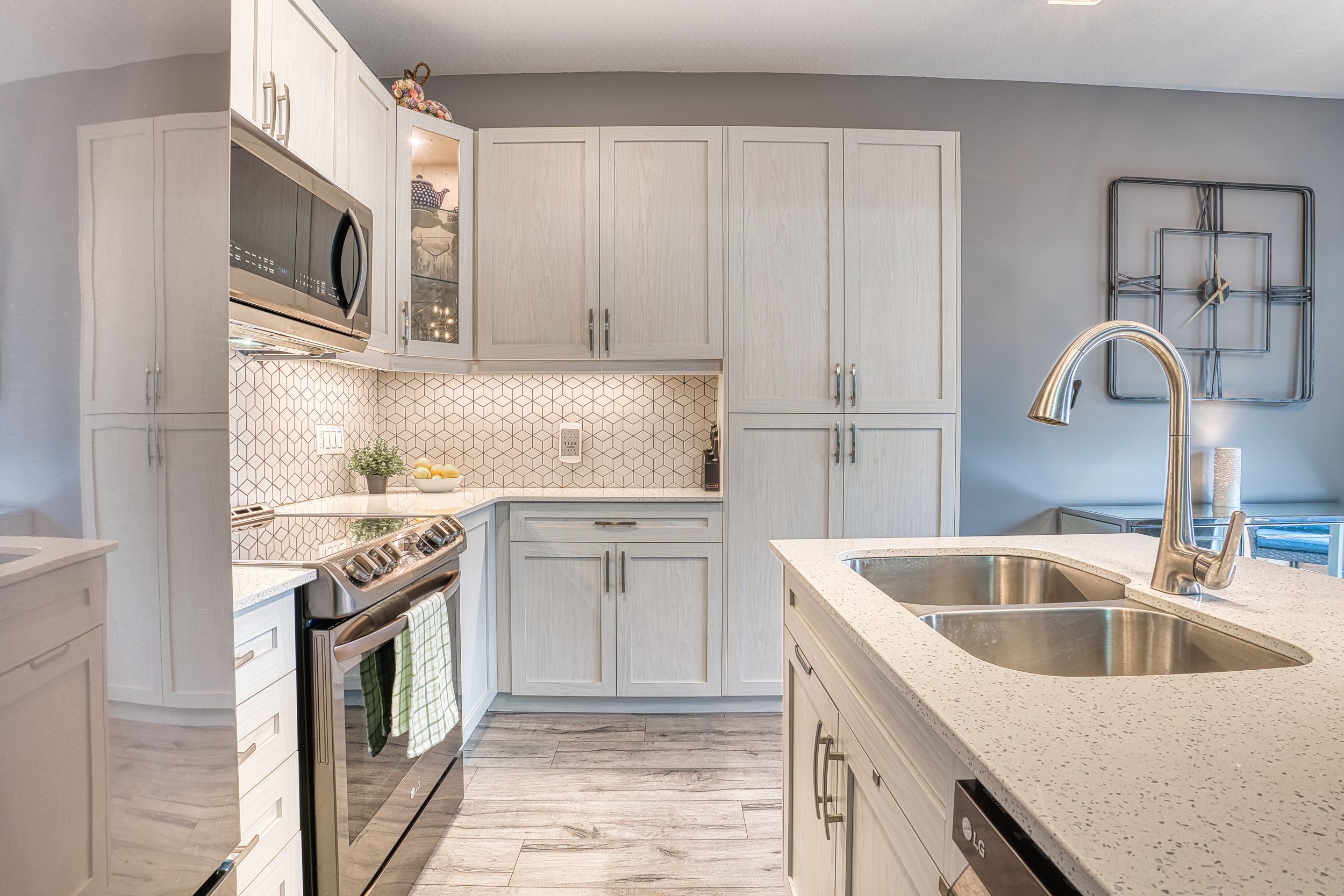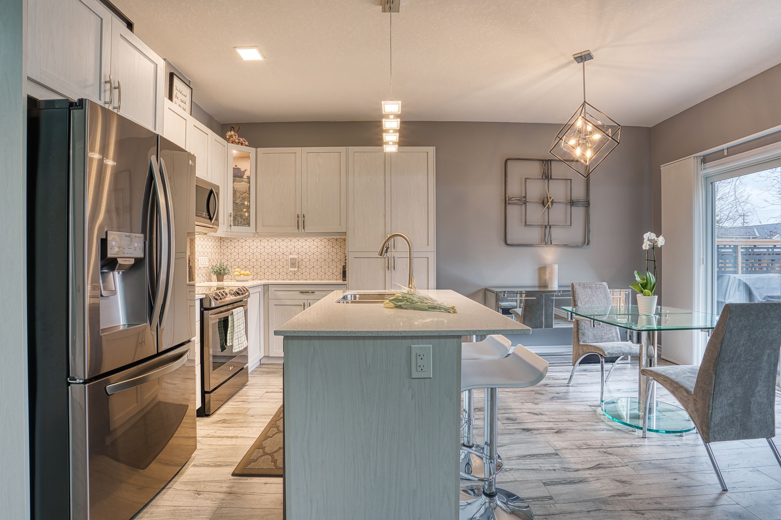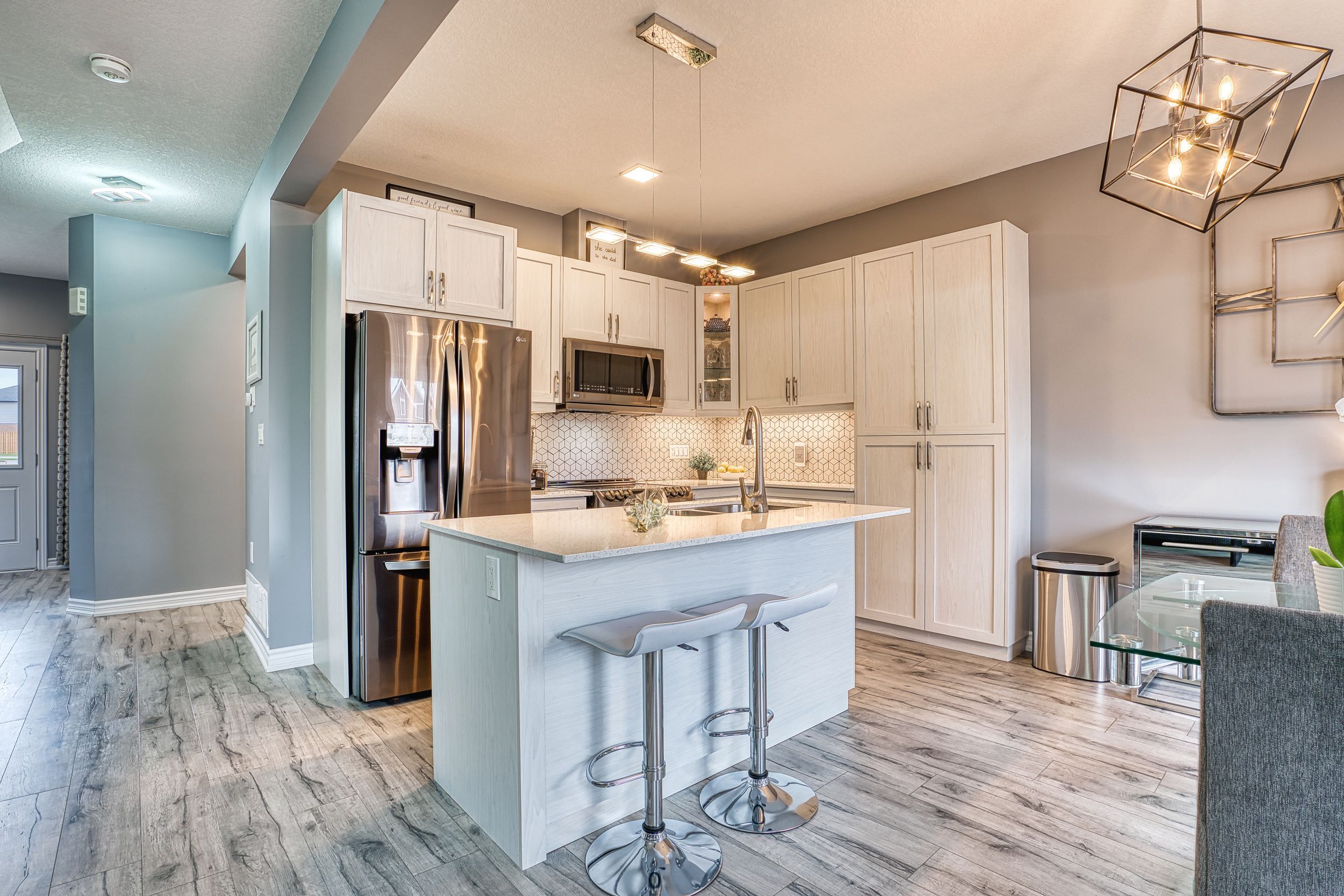 • Upgraded custom kitchen with quartz island and ample storage space.