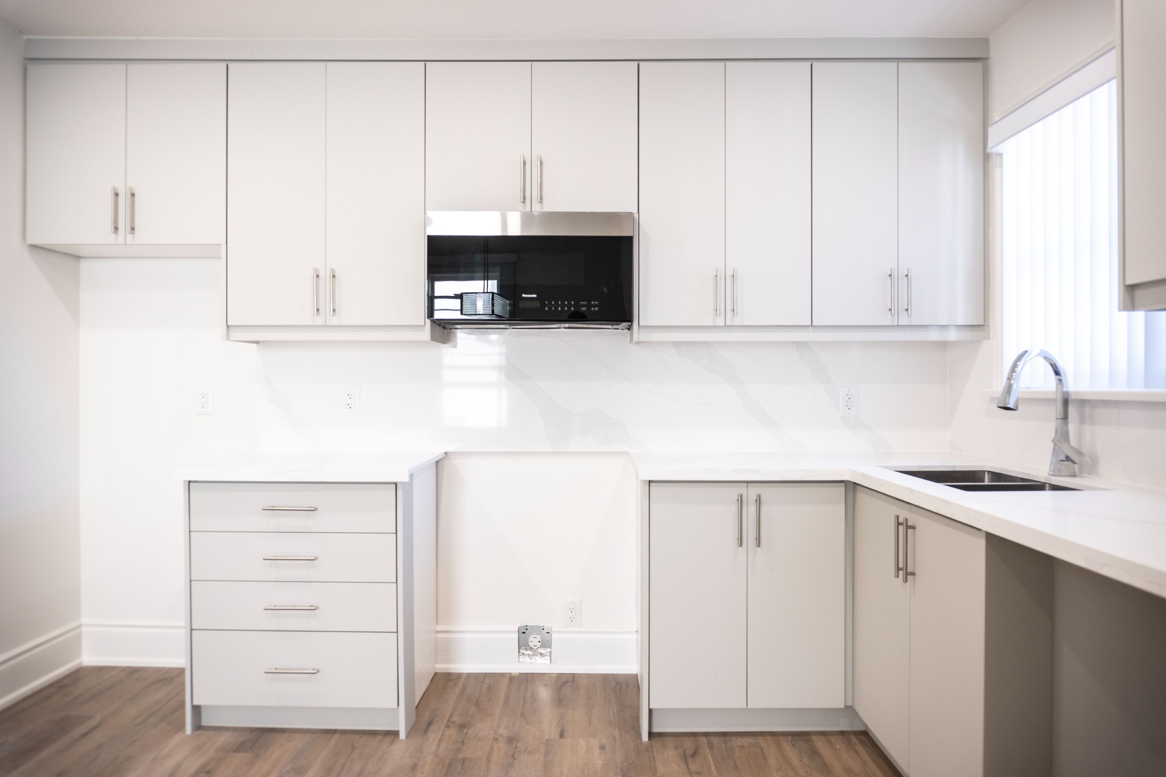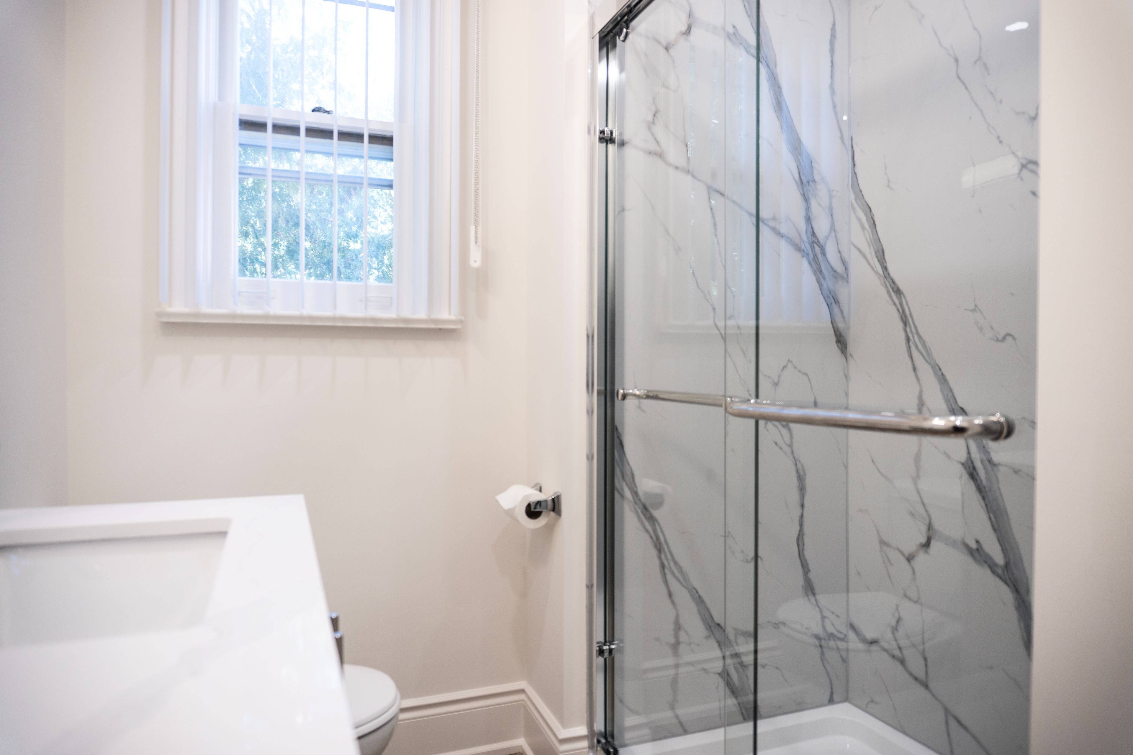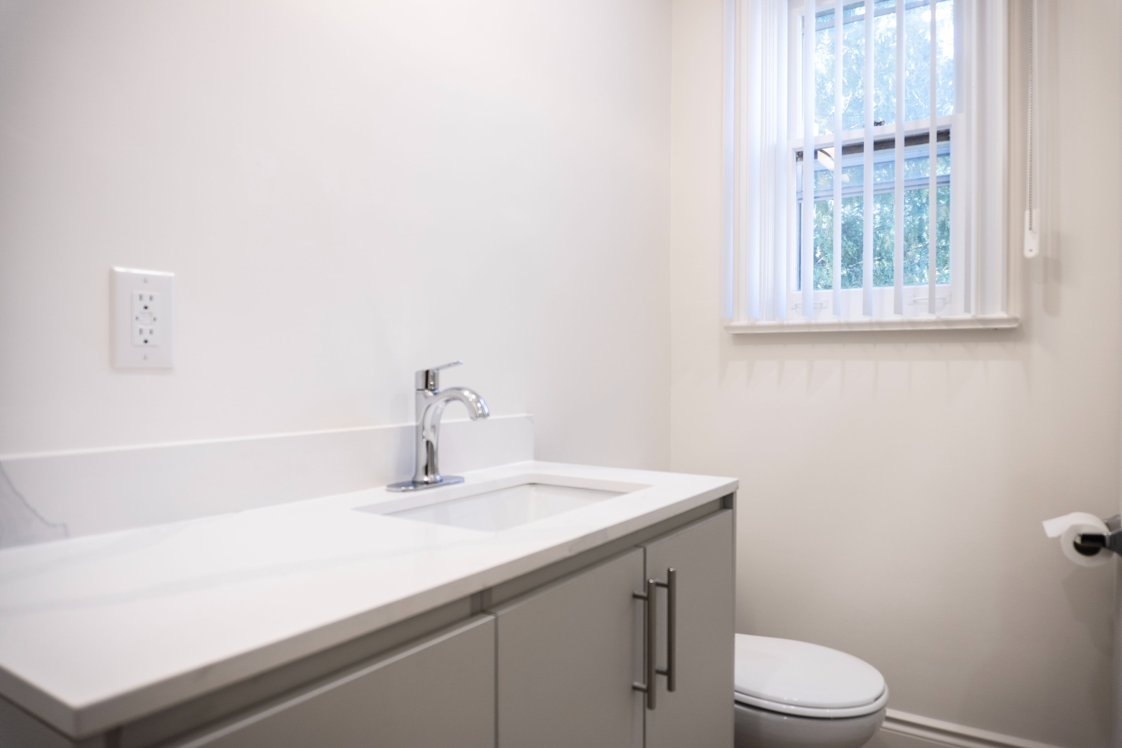 • Modern kitchen with quartz countertops and renovated bathrooms.