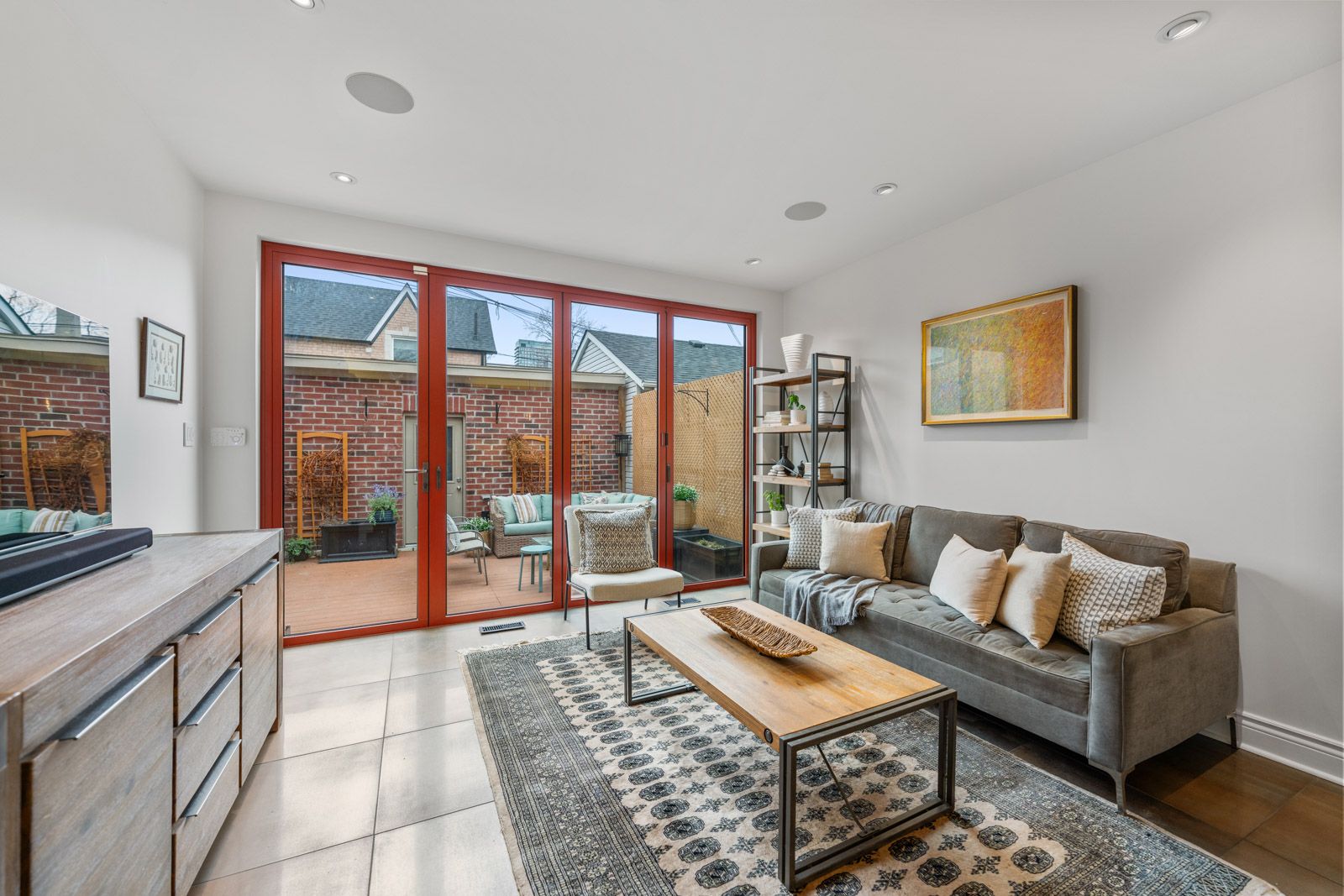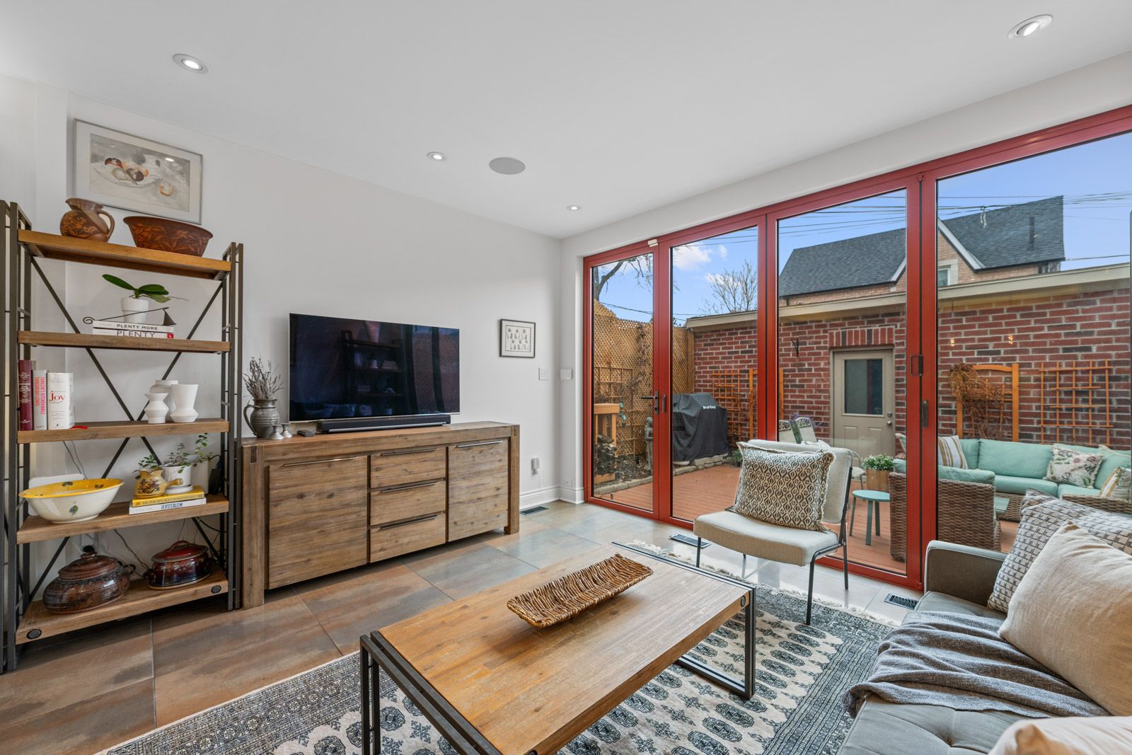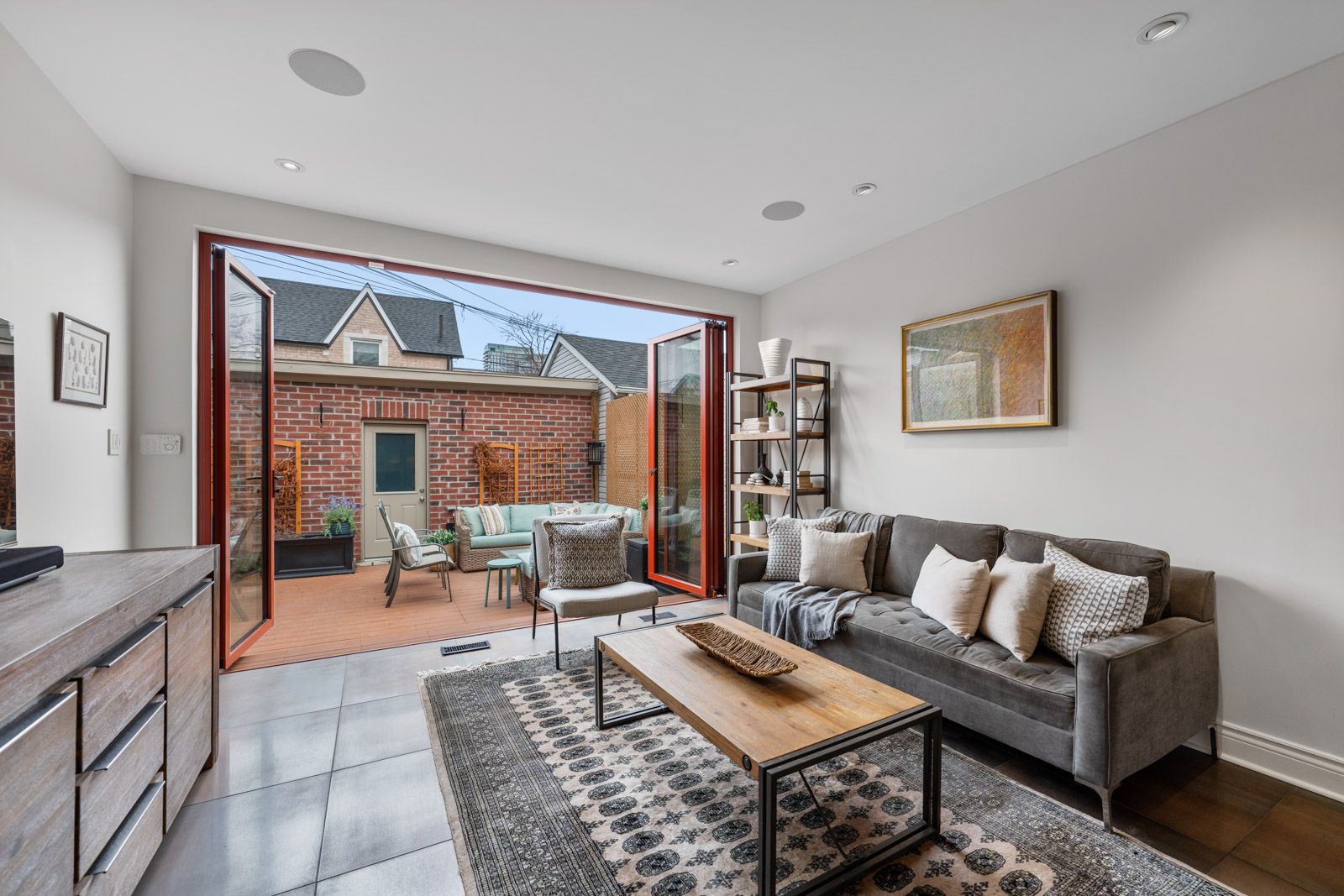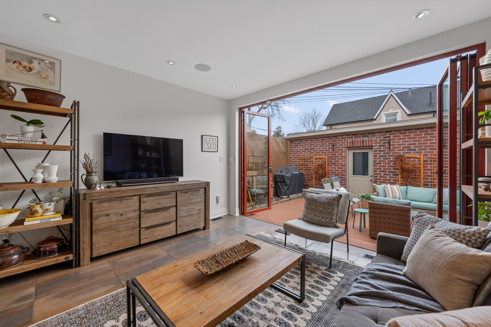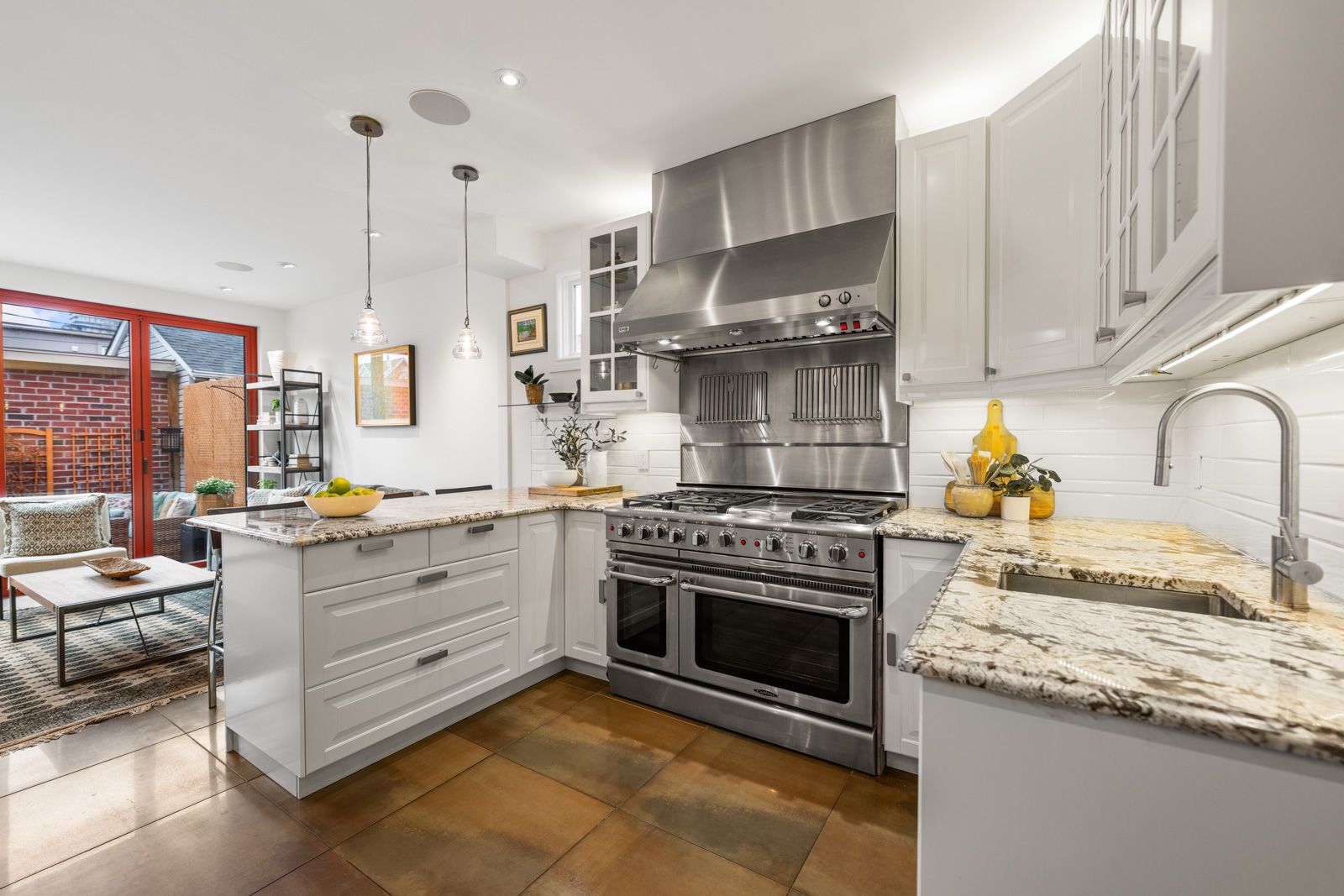 • Expansive kitchen flowing into a family room with floor-to-ceiling tri-fold doors.