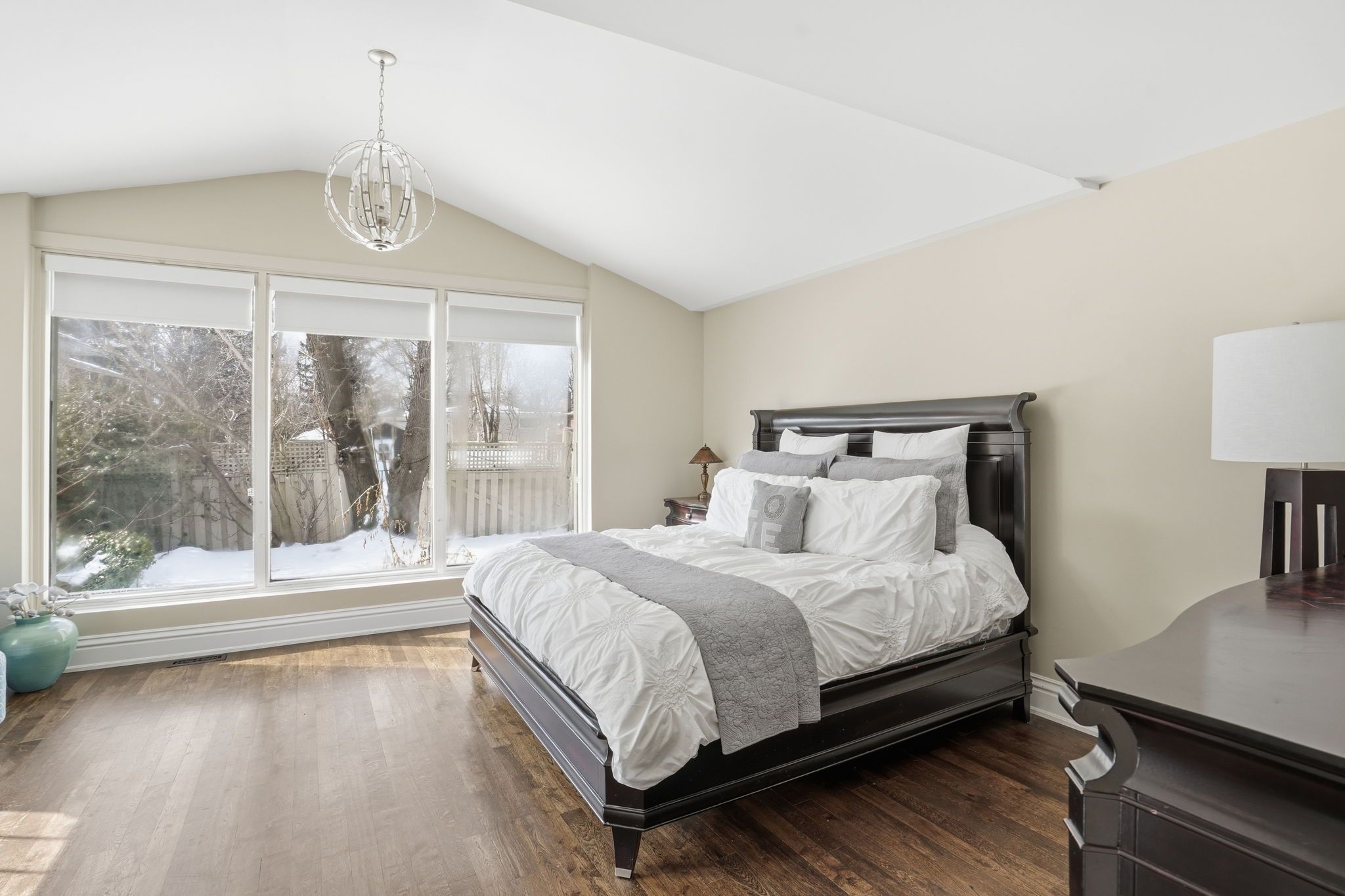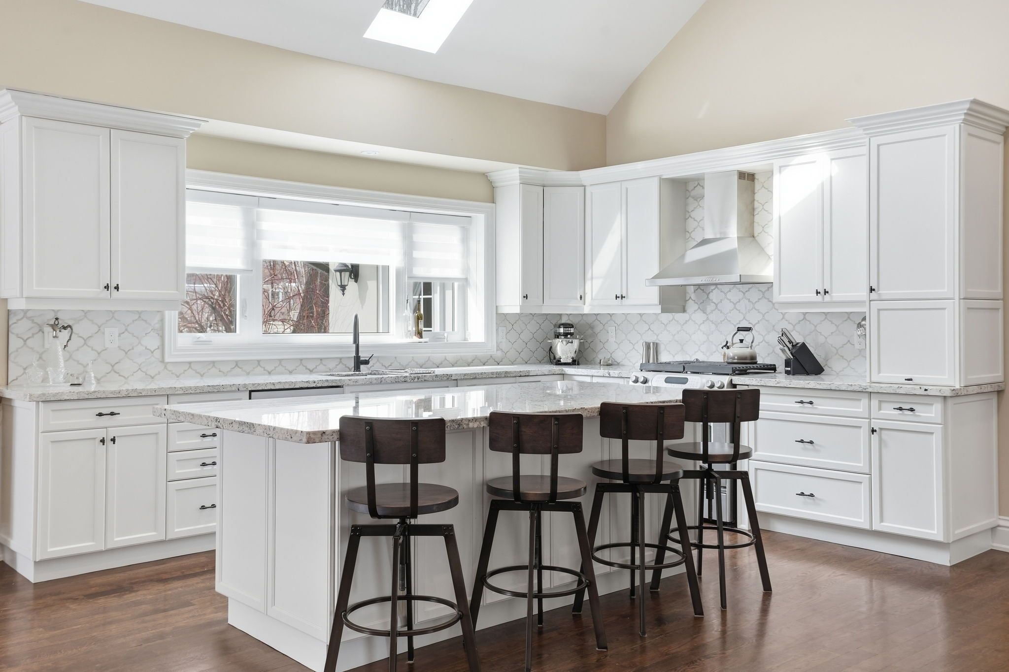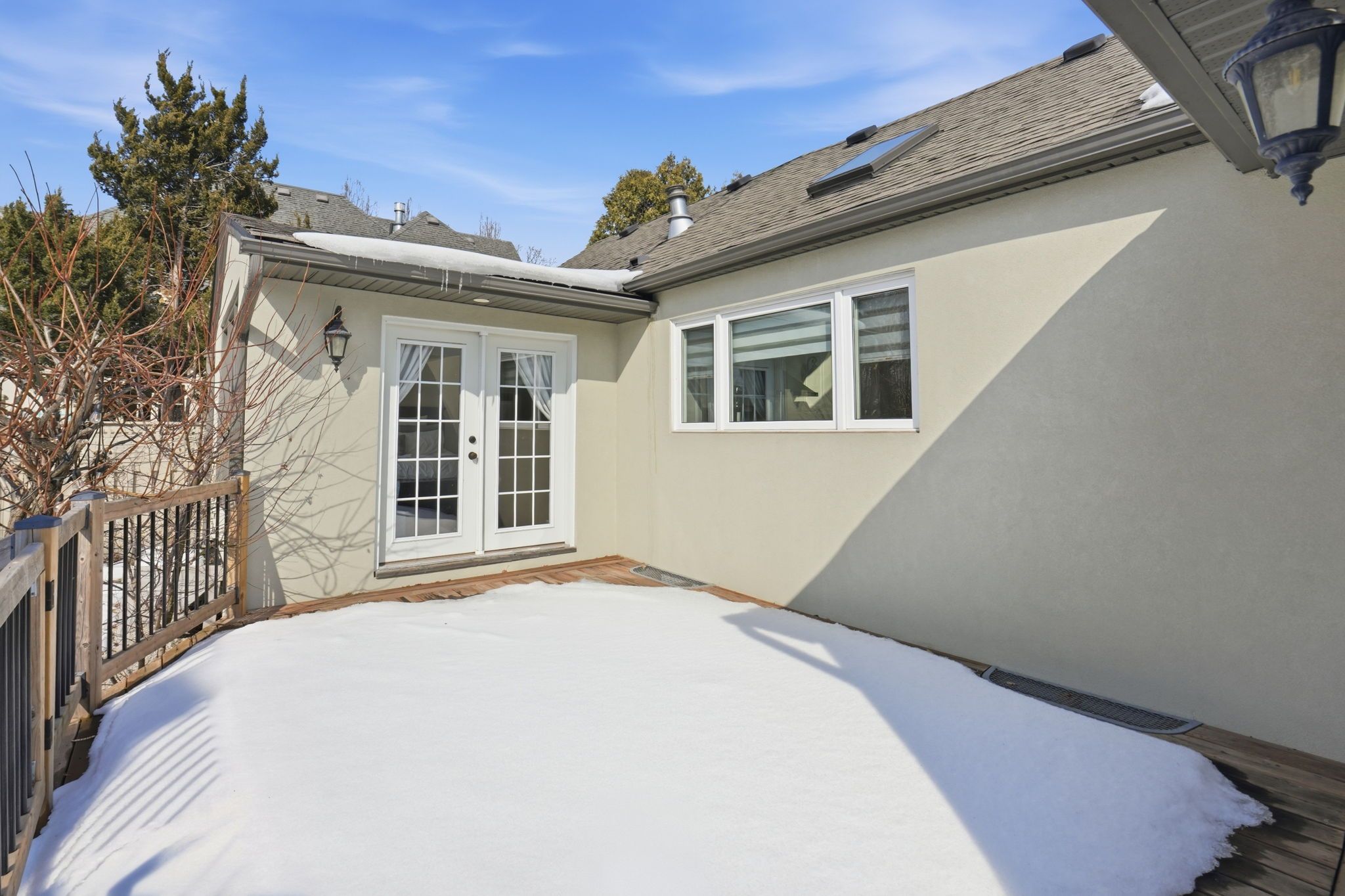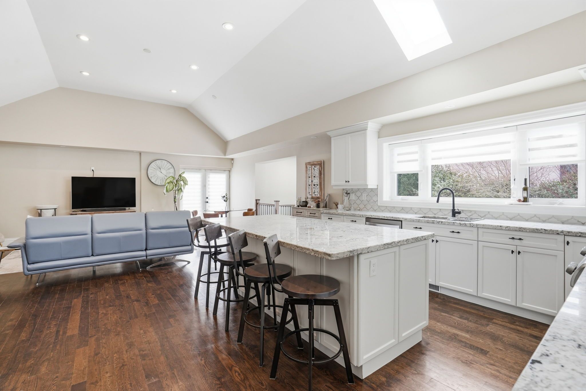 Welcome to a beautifully refined single-level residence where vaulted ceilings, natural light, and thoughtful design create an exceptional everyday living experience. From the moment you arrive, the home's balanced façade, neutral stucco exterior, and covered portico set a tone of understated sophistication. Inside, the open-concept main level unfolds beneath soaring ceilings and skylights, allowing light to pour through the space. Rich wide-plank hardwood flooring and clean architectural lines provide warmth and continuity throughout. The kitchen is positioned at the heart of the home, featuring full-height cabinetry, quartz countertops, a large island ideal for gathering, and seamless connection to the dining area. Sliding glass doors extend the living space outdoors, creating effortless indoor-outdoor flow for entertaining. The primary suite is a private retreat with vaulted ceilings, expansive windows, french door access to the exterior, and a custom walk-in closet with built-in organization. The ensuite offers a double vanity and a glass-enclosed walk-in shower with full-height tile surround for a spa-like feel. Additional bedrooms are bright and versatile, complemented by a finished lower level offering generous recreation space with recessed lighting and durable finishes. Step outside to a fully fenced, private backyard framed by mature trees and established landscaping. An elevated wood deck and generous lawn area provide the perfect setting for outdoor gatherings or quiet relaxation. A rare opportunity to own a thoughtfully updated home that balances architectural character, functionality, and privacy in one cohesive offering.