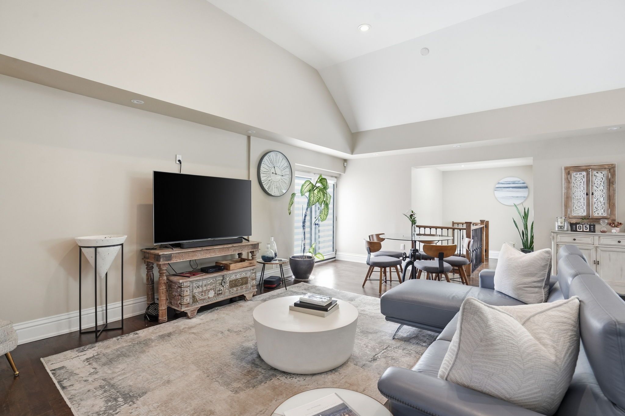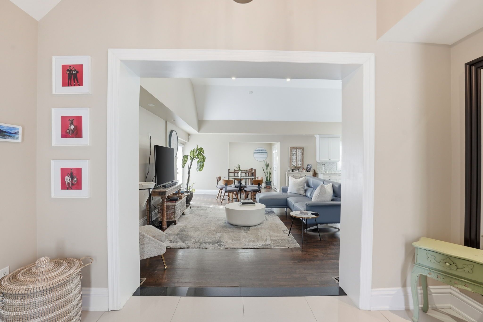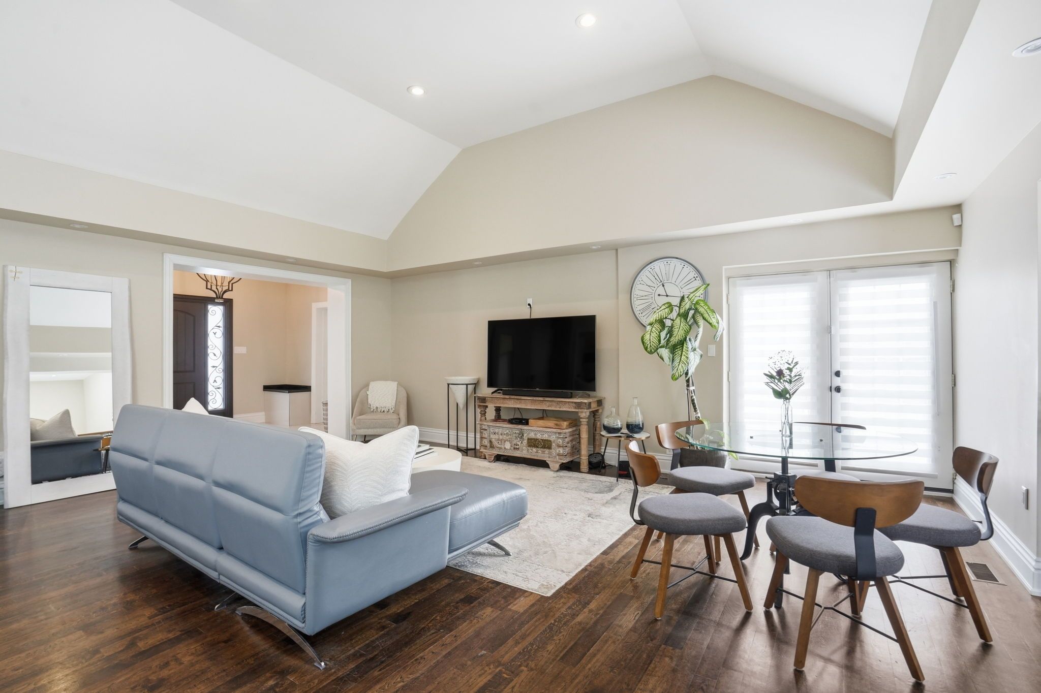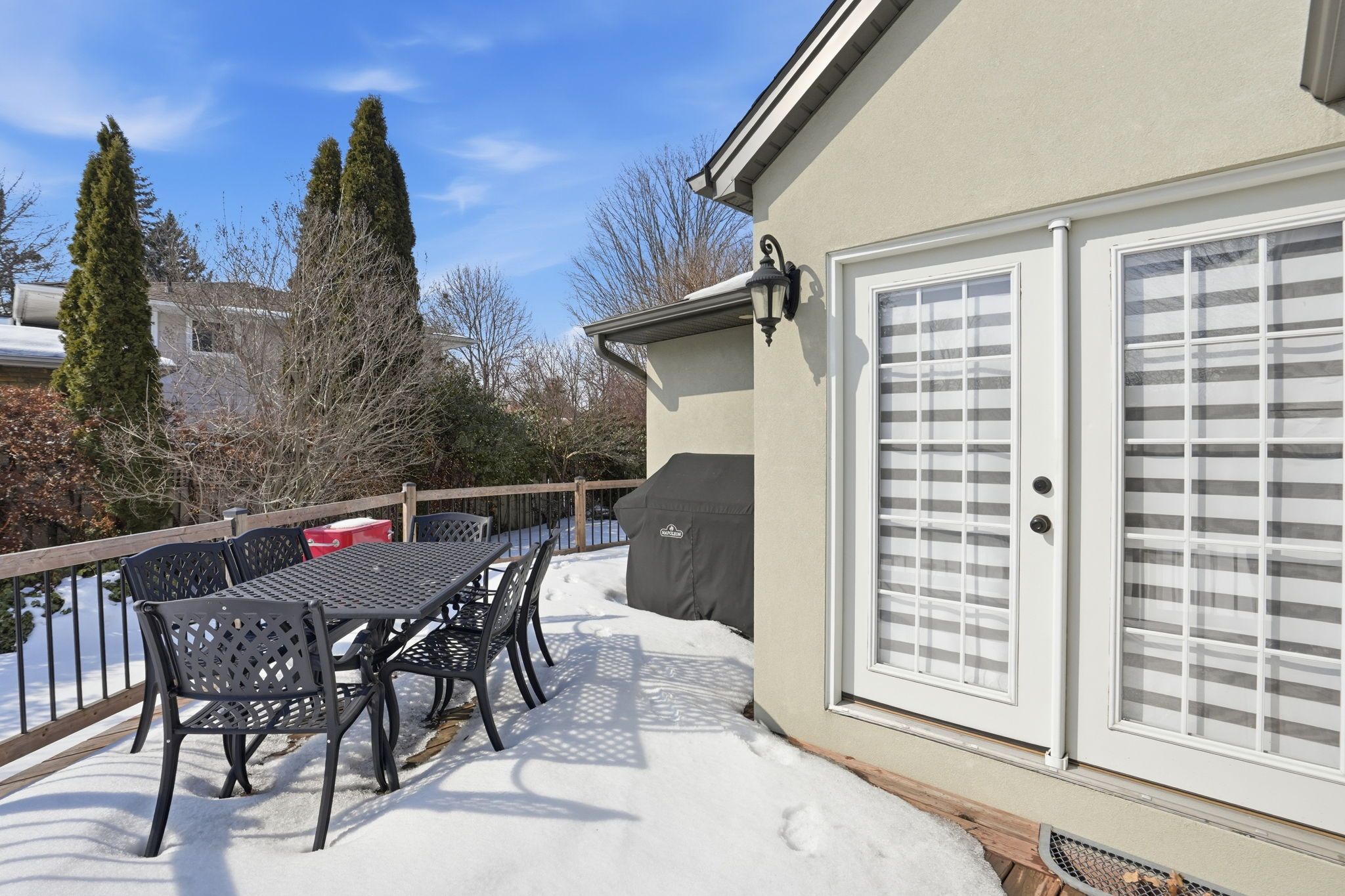 Welcome to a beautifully refined single-level residence where vaulted ceilings, natural light, and thoughtful design create an exceptional everyday living experience. From the moment you arrive, the home's balanced façade, neutral stucco exterior, and covered portico set a tone of understated sophistication. Inside, the open-concept main level unfolds beneath soaring ceilings and skylights, allowing light to pour through the space. Rich wide-plank hardwood flooring and clean architectural lines provide warmth and continuity throughout. The kitchen is positioned at the heart of the home, featuring full-height cabinetry, quartz countertops, a large island ideal for gathering, and seamless connection to the dining area. Sliding glass doors extend the living space outdoors, creating effortless indoor-outdoor flow for entertaining. The primary suite is a private retreat with vaulted ceilings, expansive windows, french door access to the exterior, and a custom walk-in closet with built-in organization. The ensuite offers a double vanity and a glass-enclosed walk-in shower with full-height tile surround for a spa-like feel. Additional bedrooms are bright and versatile, complemented by a finished lower level offering generous recreation space with recessed lighting and durable finishes. Step outside to a fully fenced, private backyard framed by mature trees and established landscaping. An elevated wood deck and generous lawn area provide the perfect setting for outdoor gatherings or quiet relaxation. A rare opportunity to own a thoughtfully updated home that balances architectural character, functionality, and privacy in one cohesive offering.
