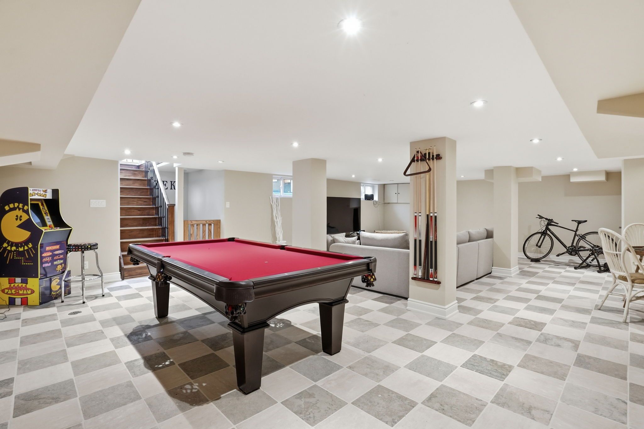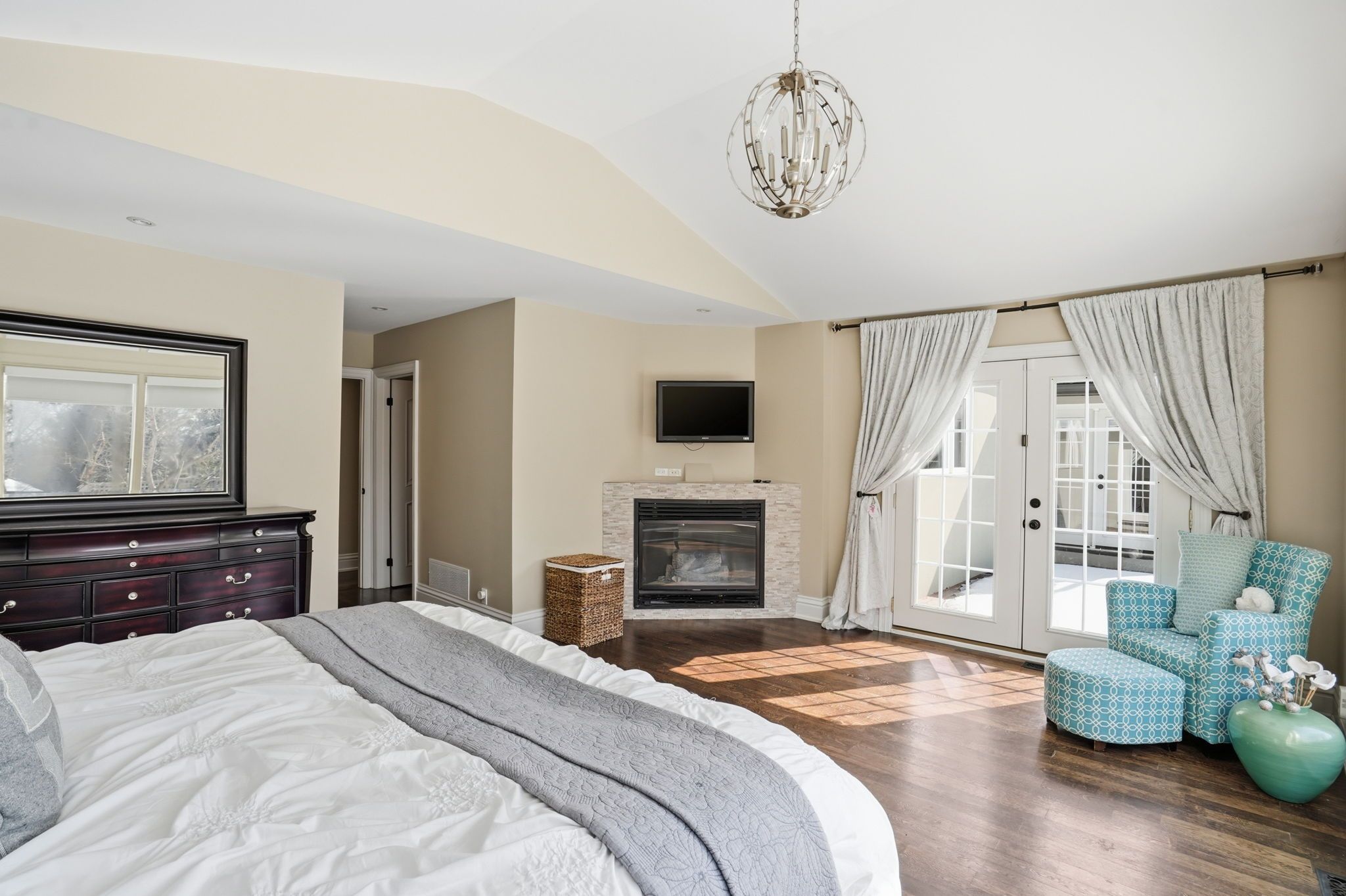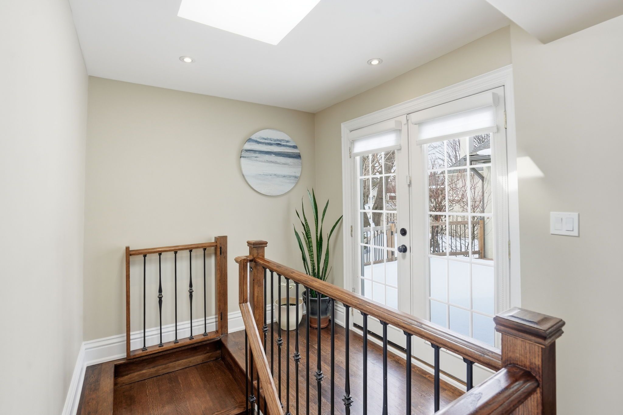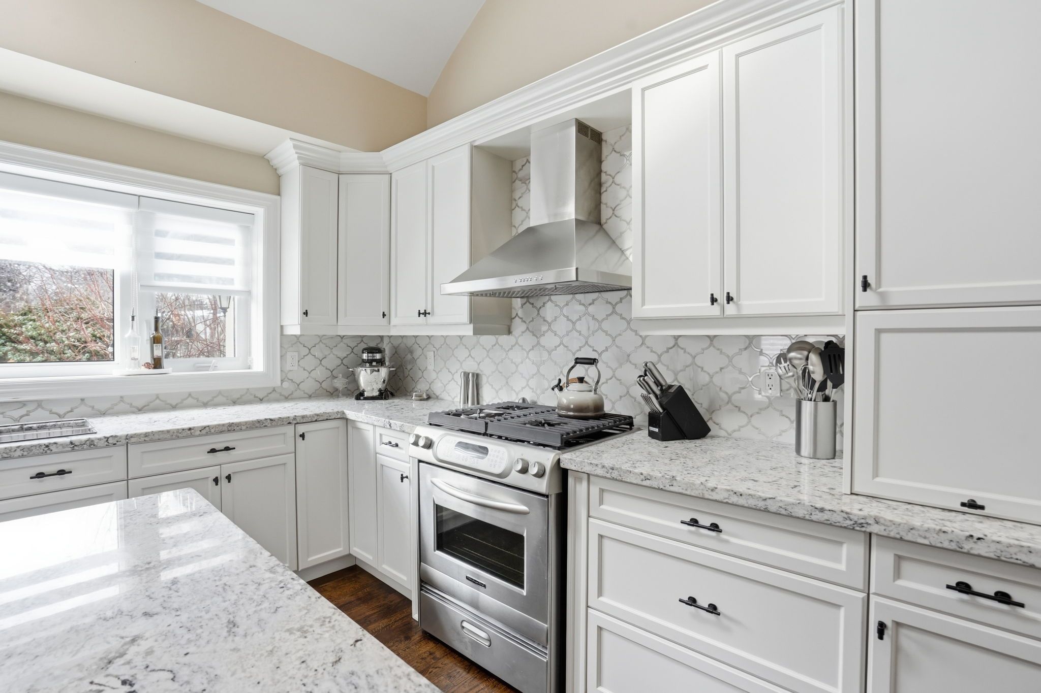 Welcome to a beautifully refined single-level residence where vaulted ceilings, natural light, and thoughtful design create an exceptional everyday living experience. From the moment you arrive, the home's balanced façade, neutral stucco exterior, and covered portico set a tone of understated sophistication. Inside, the open-concept main level unfolds beneath soaring ceilings and skylights, allowing light to pour through the space. Rich wide-plank hardwood flooring and clean architectural lines provide warmth and continuity throughout. The kitchen is positioned at the heart of the home, featuring full-height cabinetry, quartz countertops, a large island ideal for gathering, and seamless connection to the dining area. Sliding glass doors extend the living space outdoors, creating effortless indoor-outdoor flow for entertaining. The primary suite is a private retreat with vaulted ceilings, expansive windows, french door access to the exterior, and a custom walk-in closet with built-in organization. The ensuite offers a double vanity and a glass-enclosed walk-in shower with full-height tile surround for a spa-like feel. Additional bedrooms are bright and versatile, complemented by a finished lower level offering generous recreation space with recessed lighting and durable finishes. Step outside to a fully fenced, private backyard framed by mature trees and established landscaping. An elevated wood deck and generous lawn area provide the perfect setting for outdoor gatherings or quiet relaxation. A rare opportunity to own a thoughtfully updated home that balances architectural character, functionality, and privacy in one cohesive offering.