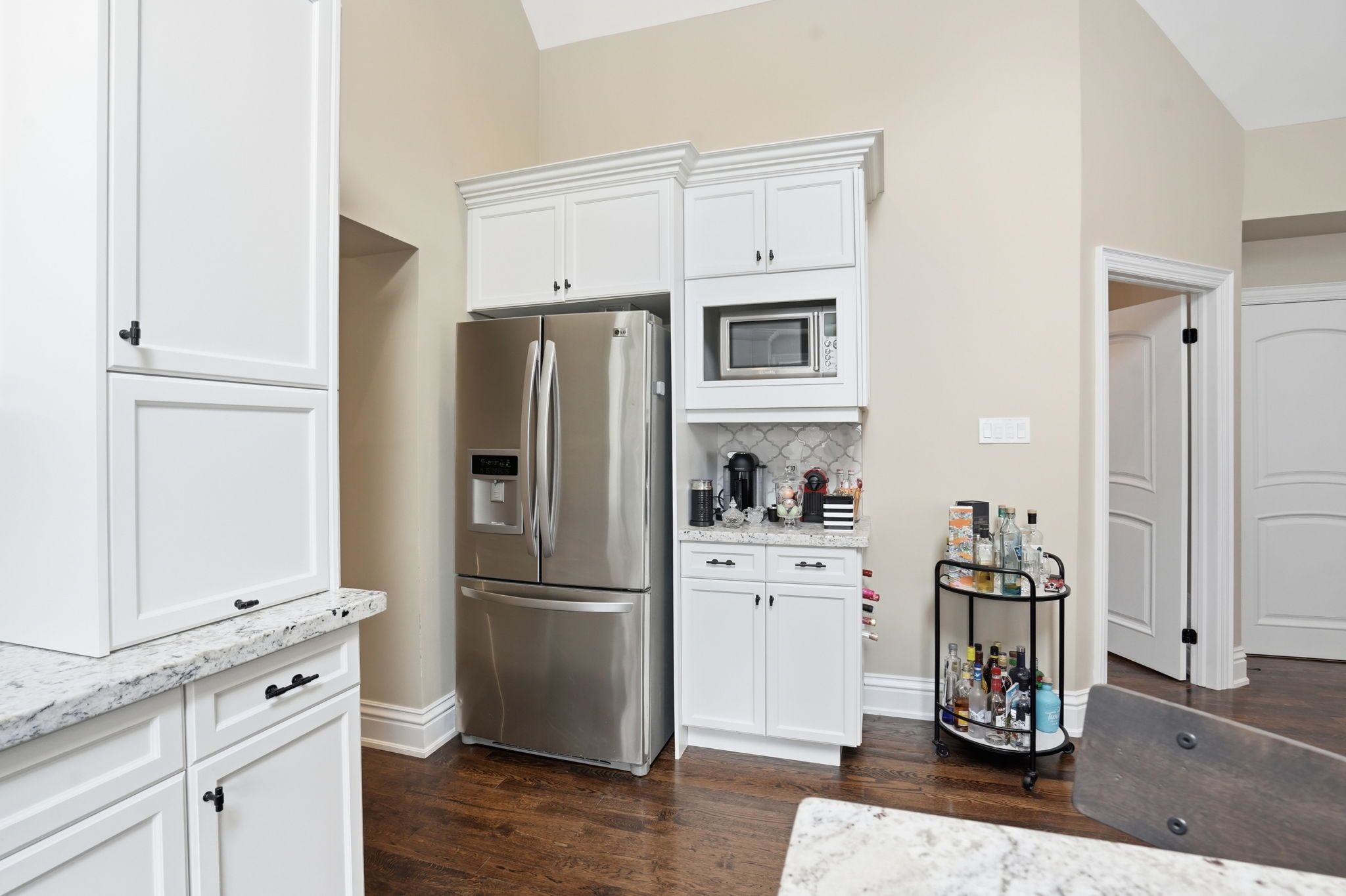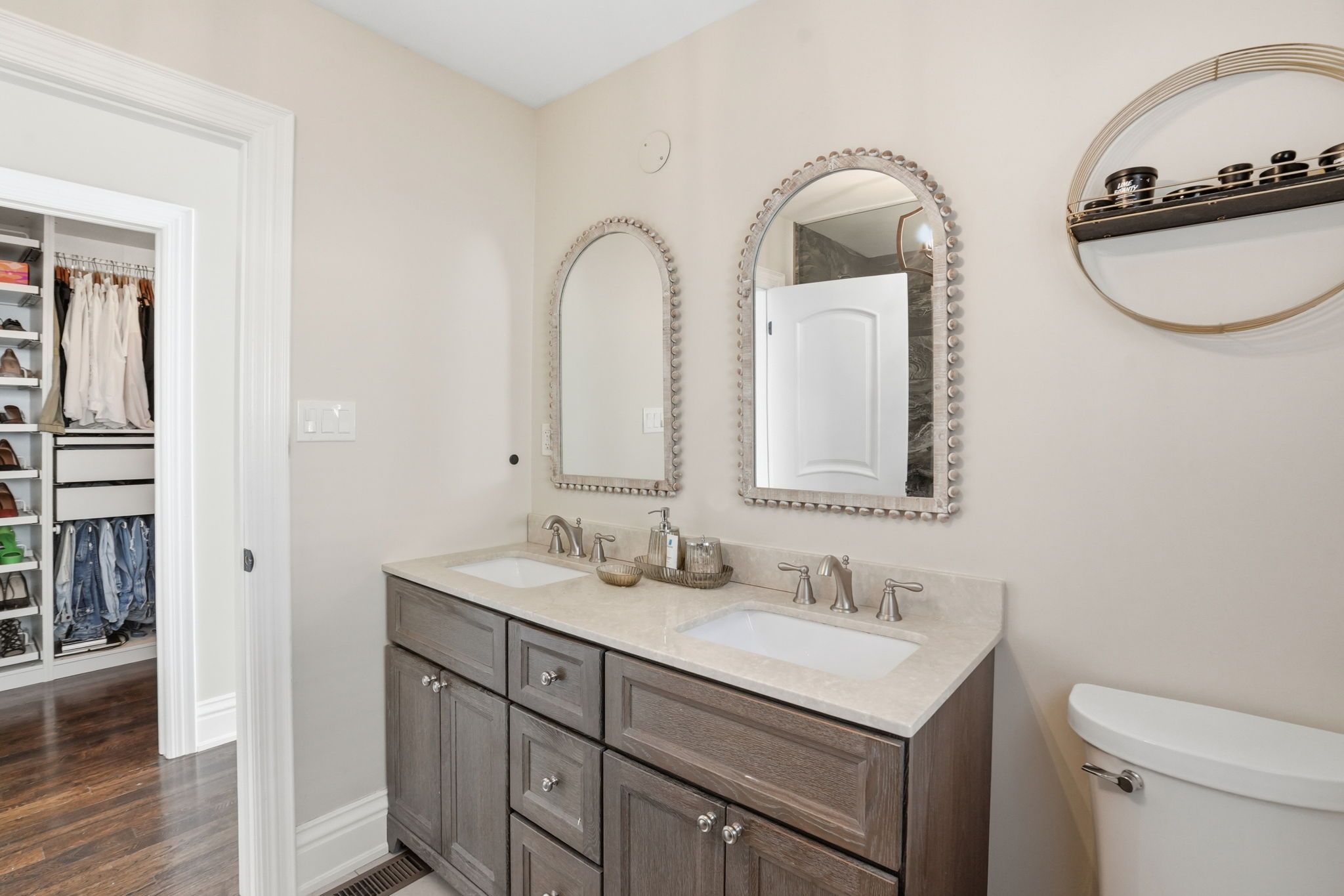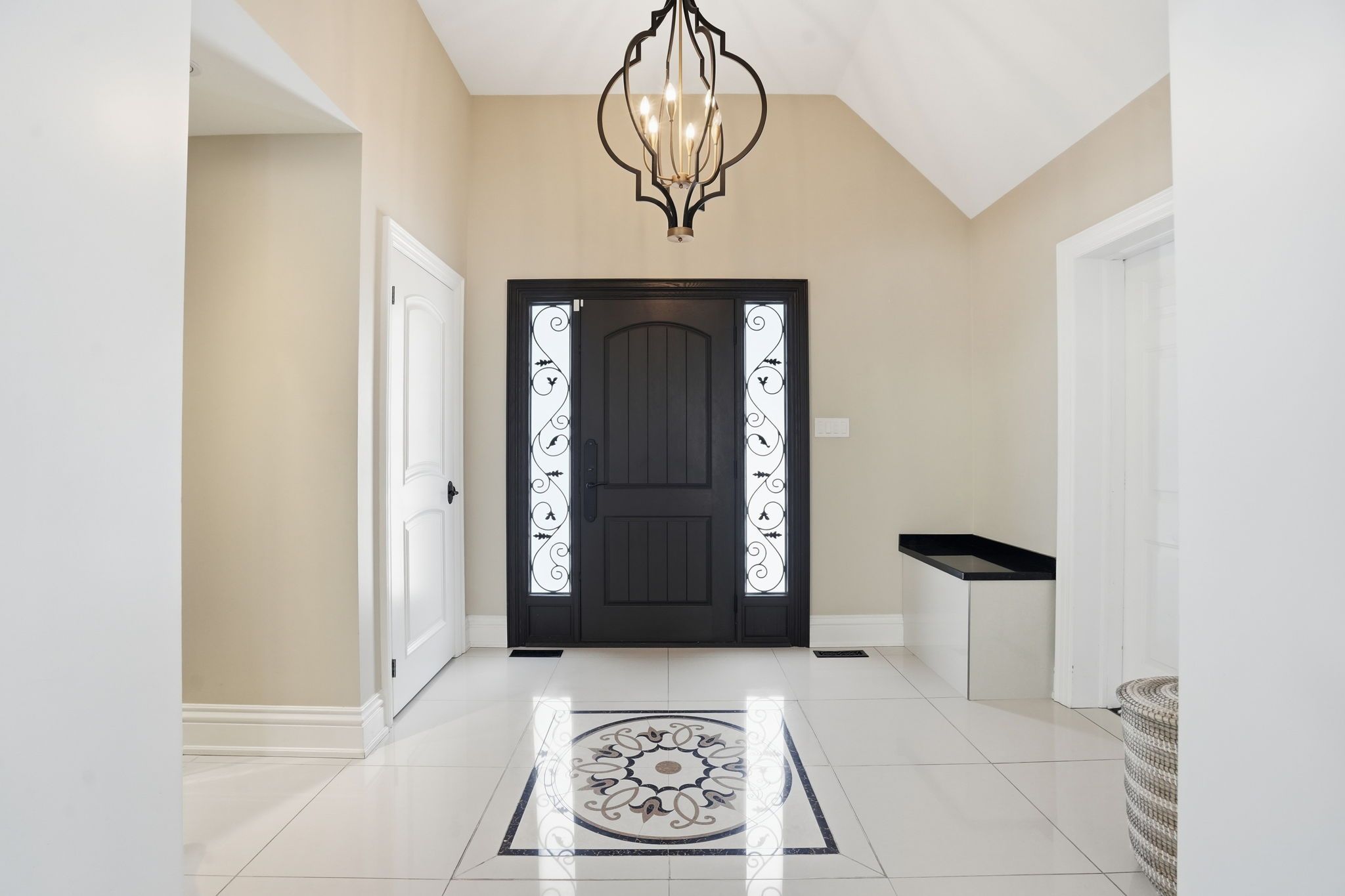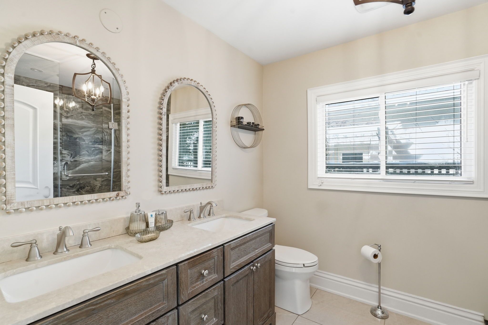 Welcome to a beautifully refined single-level residence where vaulted ceilings, natural light, and thoughtful design create an exceptional everyday living experience. From the moment you arrive, the home's balanced façade, neutral stucco exterior, and covered portico set a tone of understated sophistication. Inside, the open-concept main level unfolds beneath soaring ceilings and skylights, allowing light to pour through the space. Rich wide-plank hardwood flooring and clean architectural lines provide warmth and continuity throughout. The kitchen is positioned at the heart of the home, featuring full-height cabinetry, quartz countertops, a large island ideal for gathering, and seamless connection to the dining area. Sliding glass doors extend the living space outdoors, creating effortless indoor-outdoor flow for entertaining. The primary suite is a private retreat with vaulted ceilings, expansive windows, french door access to the exterior, and a custom walk-in closet with built-in organization. The ensuite offers a double vanity and a glass-enclosed walk-in shower with full-height tile surround for a spa-like feel. Additional bedrooms are bright and versatile, complemented by a finished lower level offering generous recreation space with recessed lighting and durable finishes. Step outside to a fully fenced, private backyard framed by mature trees and established landscaping. An elevated wood deck and generous lawn area provide the perfect setting for outdoor gatherings or quiet relaxation. A rare opportunity to own a thoughtfully updated home that balances architectural character, functionality, and privacy in one cohesive offering.