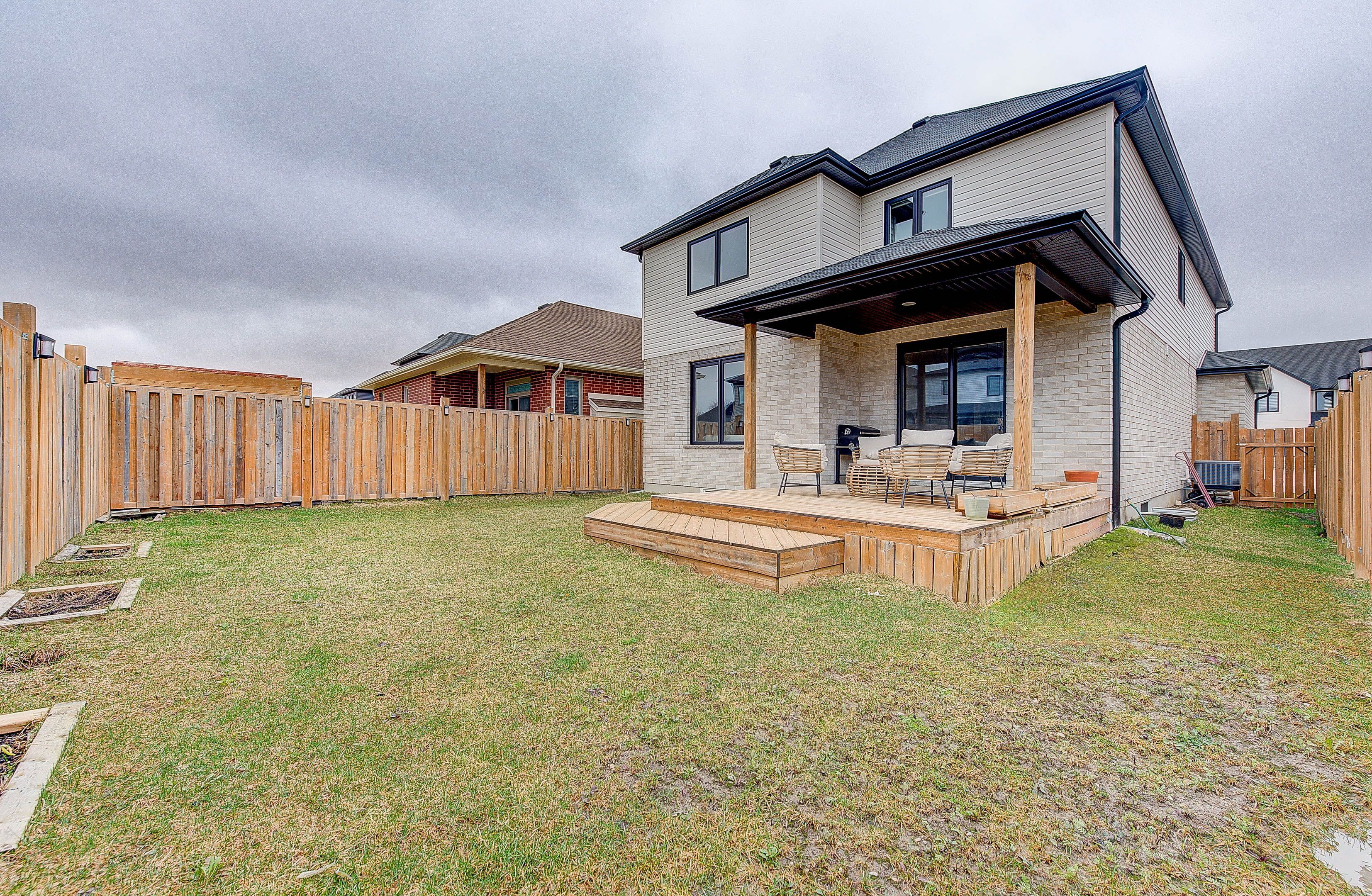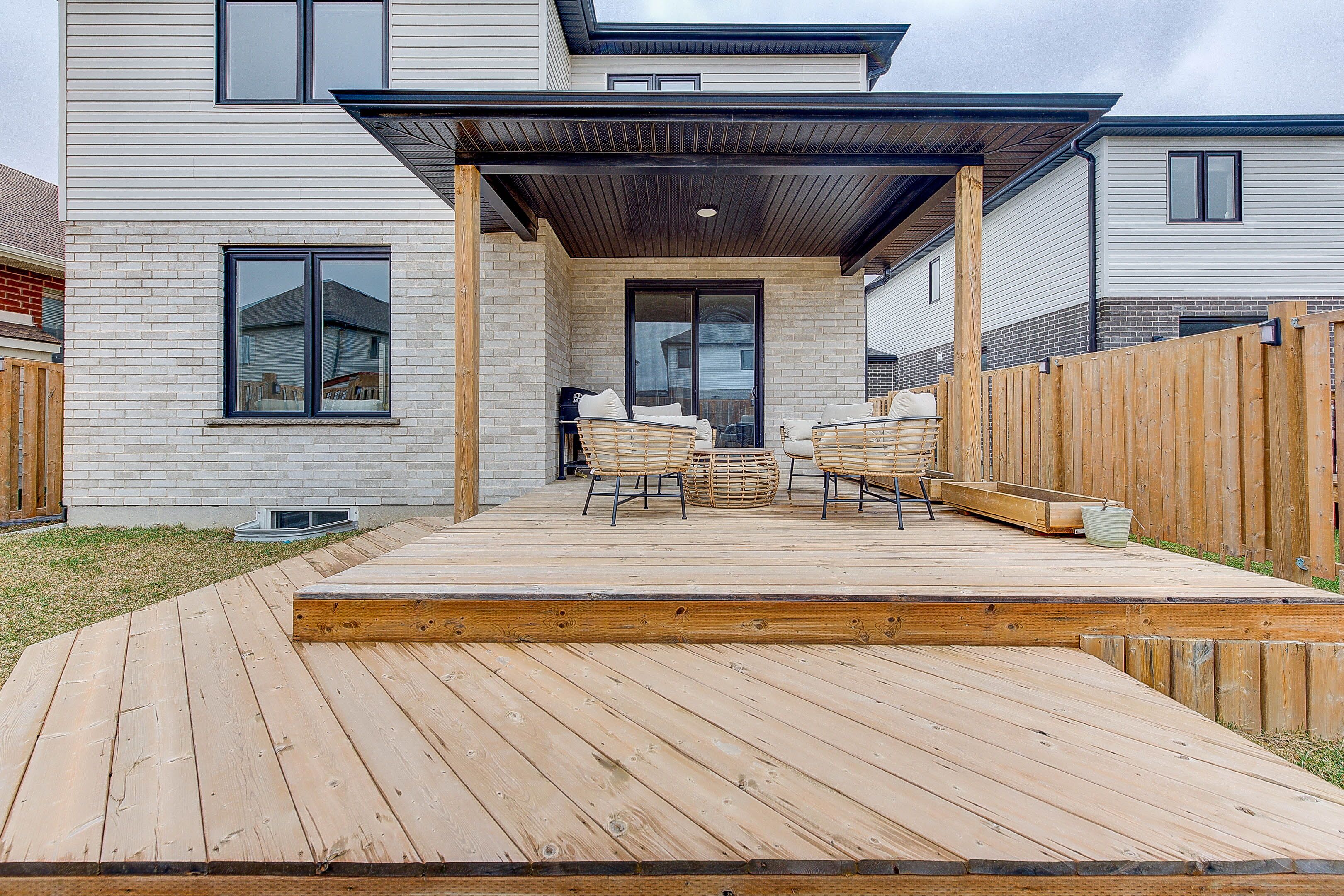 • Custom covered deck with natural gas connection overlooking a fenced yard.