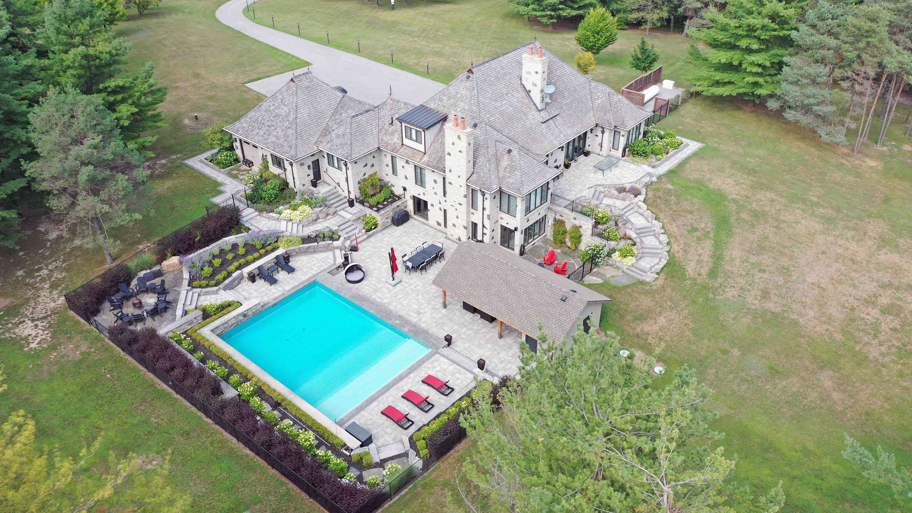 Spectacular custom-built stone estate on 9 private acres featuring rolling meadow, mature forest, nature trails, and perimeter fencing with stone pillars and a mechanical gated entrance. Hand-cut natural stone exterior, architectural gables, premium roof system, and copper downspouts highlight the exceptional craftsmanship. Over 6,000 sq. Ft. Of luxury living space with magazine-quality finishes, cathedral ceilings with exposed beams, custom millwork, designer lighting, premium flooring, and multiple walkouts to 10,000 sq ft of stone patios. Resort-style backyard with a 30x40 custom vinyl pool, six water features, natural/armour stone walls, professional landscaping, large stone terraces, firepit area, and an impressive 32x16 cabana with bar, lounge, change room, bathroom, upgraded electrical, and stone flooring. Highlights include a chef-inspired kitchen with high-end cabinetry and appliances, a stunning primary suite with spa-like ensuite and custom walk-in closet, stylish jack & jill bedrooms, a loft office, and a professionally finished lower level with recreation/media space, natural stone fireplace, full second kitchen, private guest/in-law suite with ensuite, dedicated home gym with bathroom, and custom craft/storage room. Soaring mature trees with nature trails. Site plan approval in place for an additional 4276 sq ft building/shop. Located minutes to musselman's lake, stouffville, ballantrae, aurora, markham, hwy 404, york regional forest, and approx. 40 minutes to toronto. A rare, private, resort-like country estate offering exceptional quality and lifestyle.