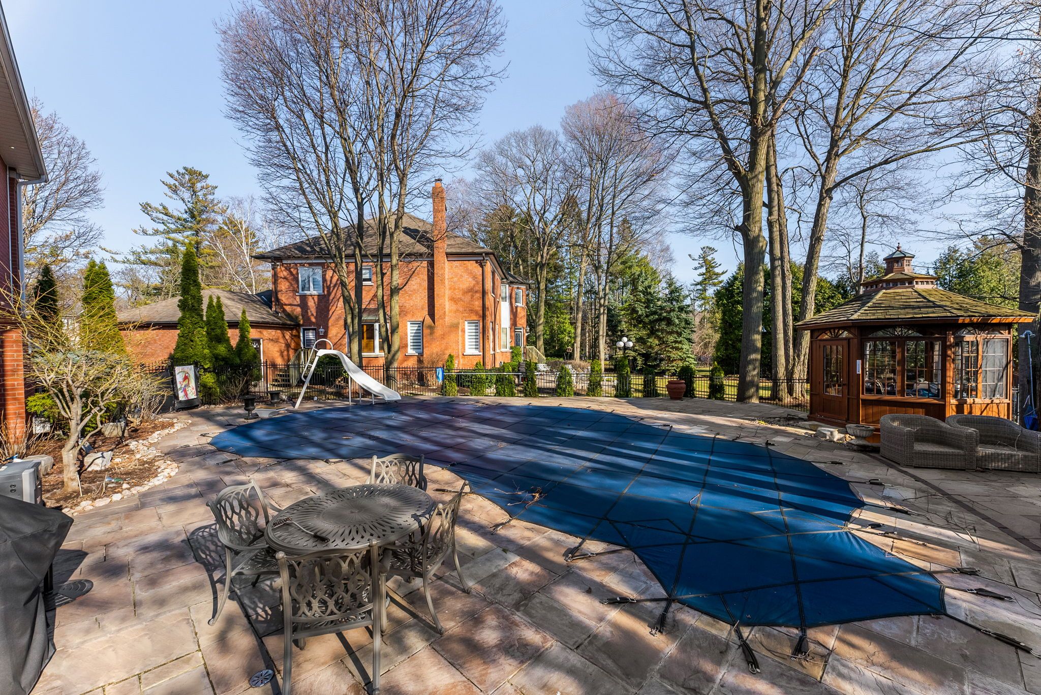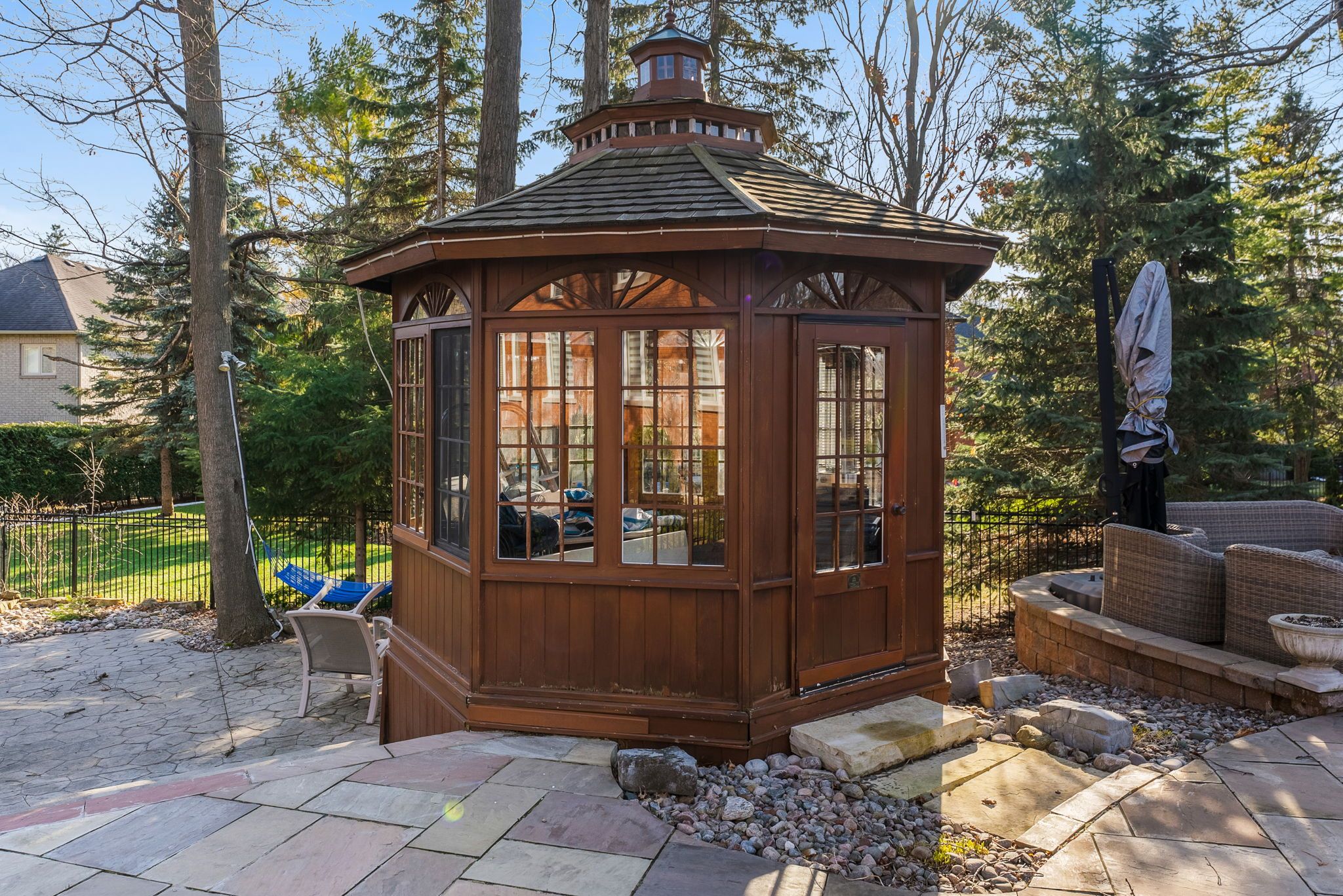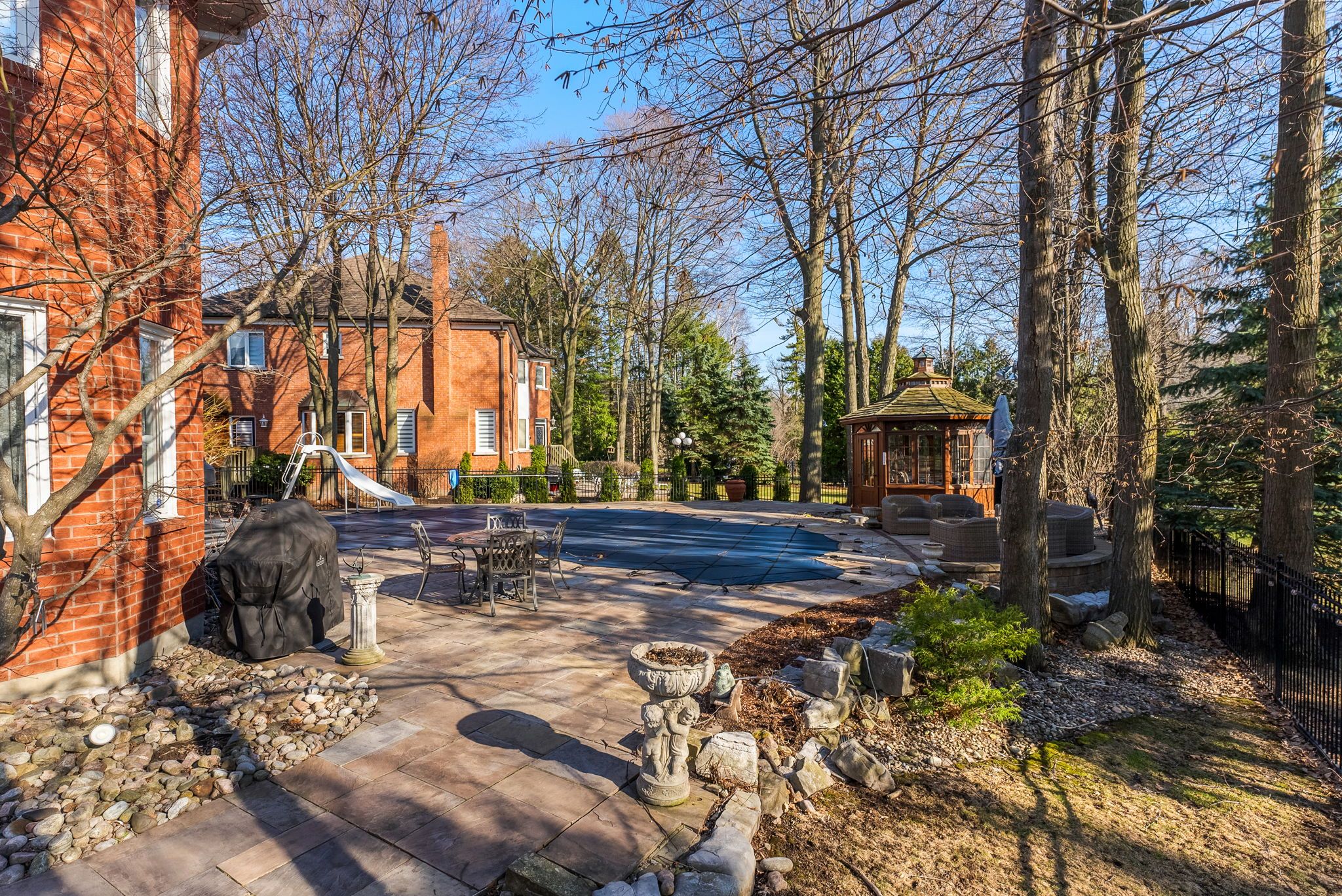 • Private backyard oasis with swimming pool, gazebo, and professional landscaping.