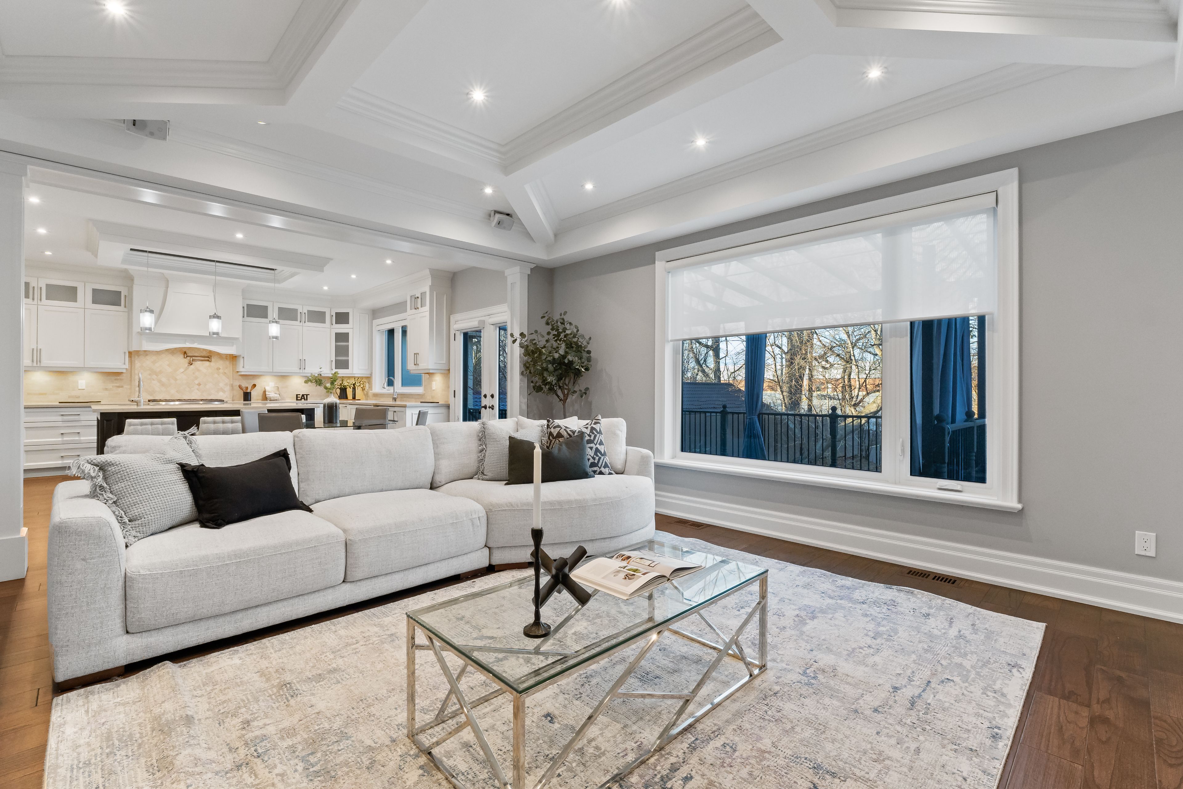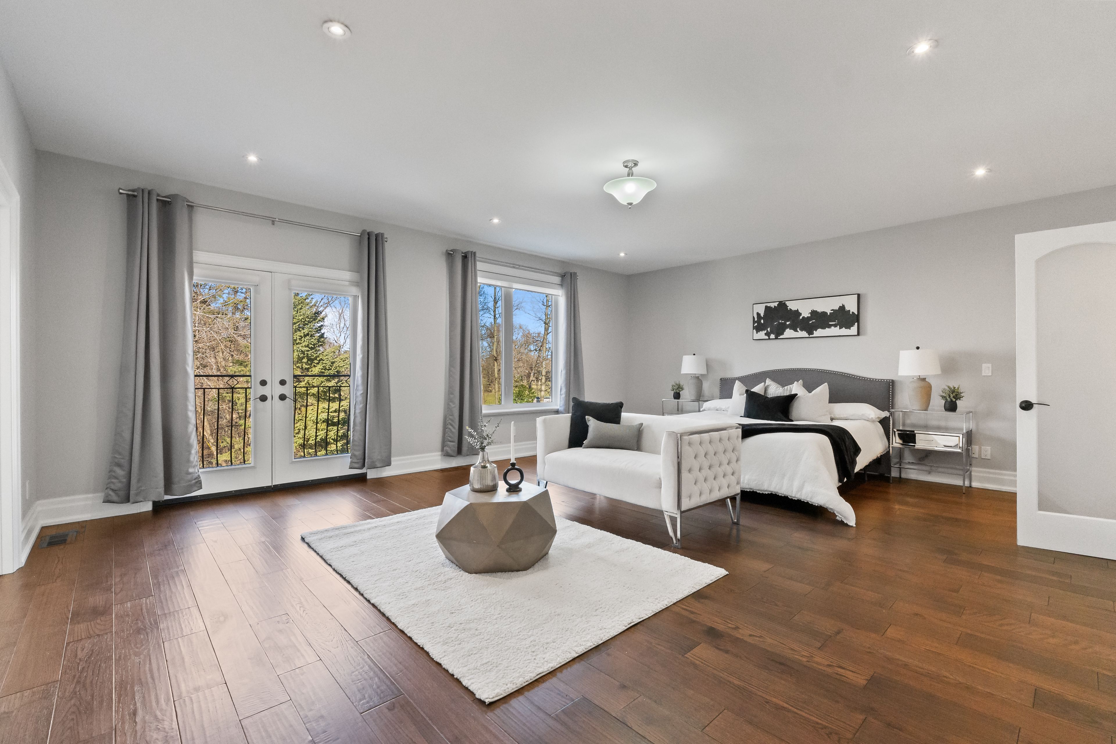 • Open concept design with high ceilings and large windows for natural light.