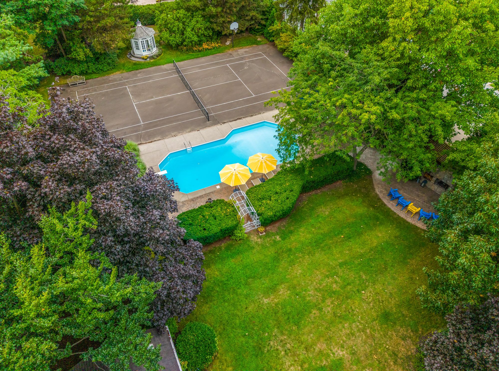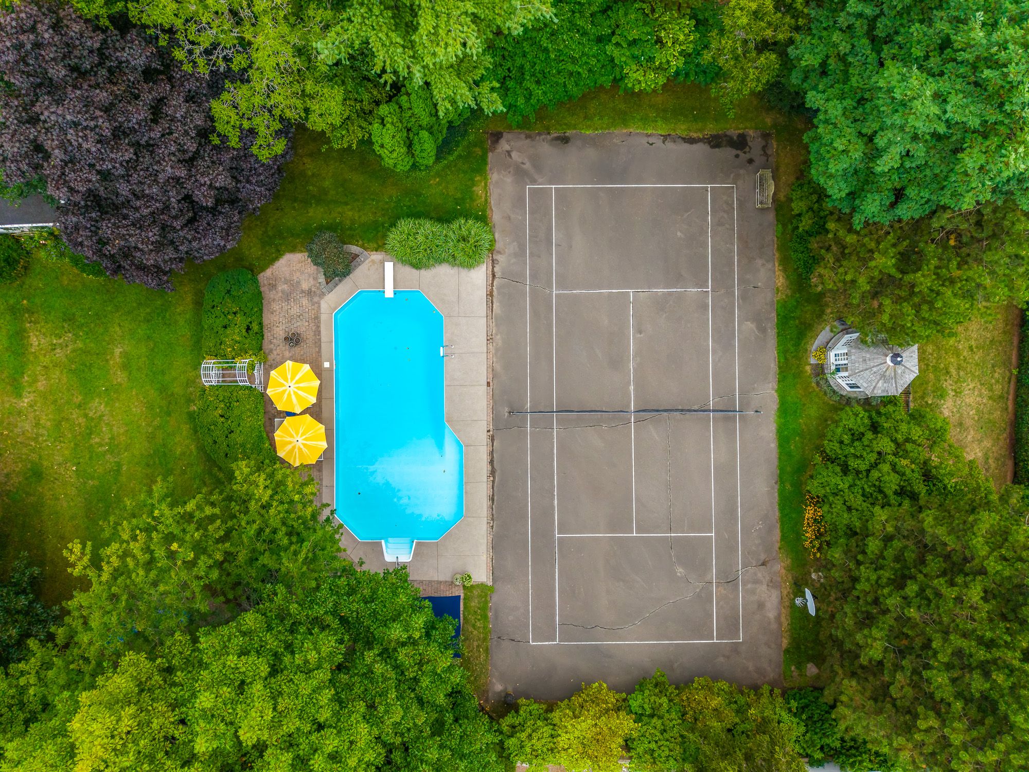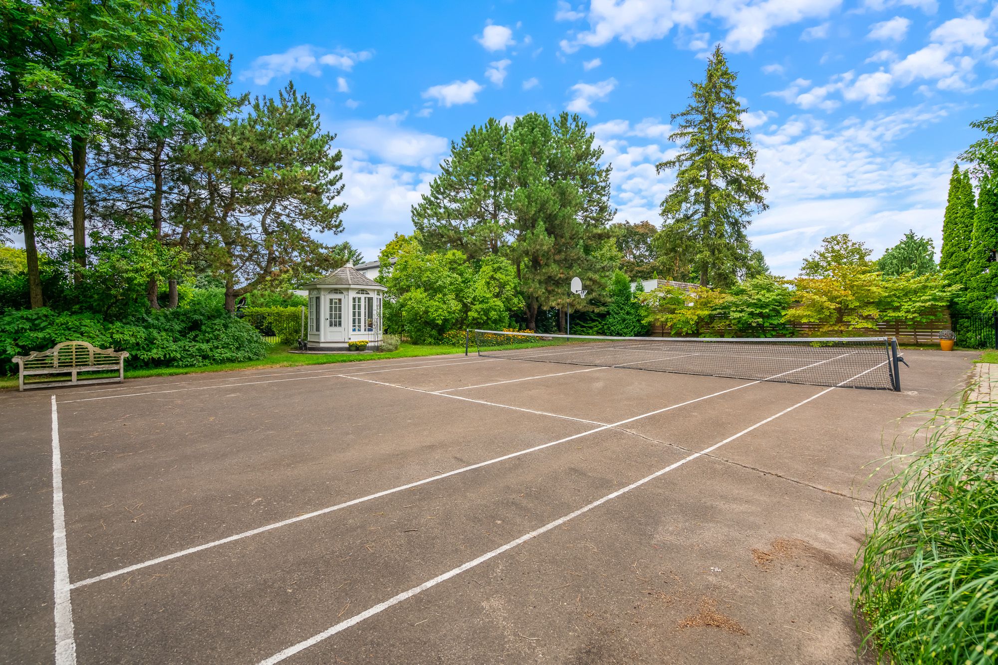 • Impressive outdoor space with in-ground heated pool, tennis court, and gazebo.