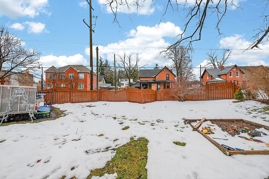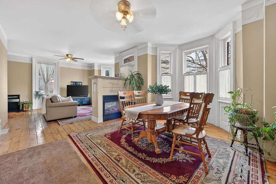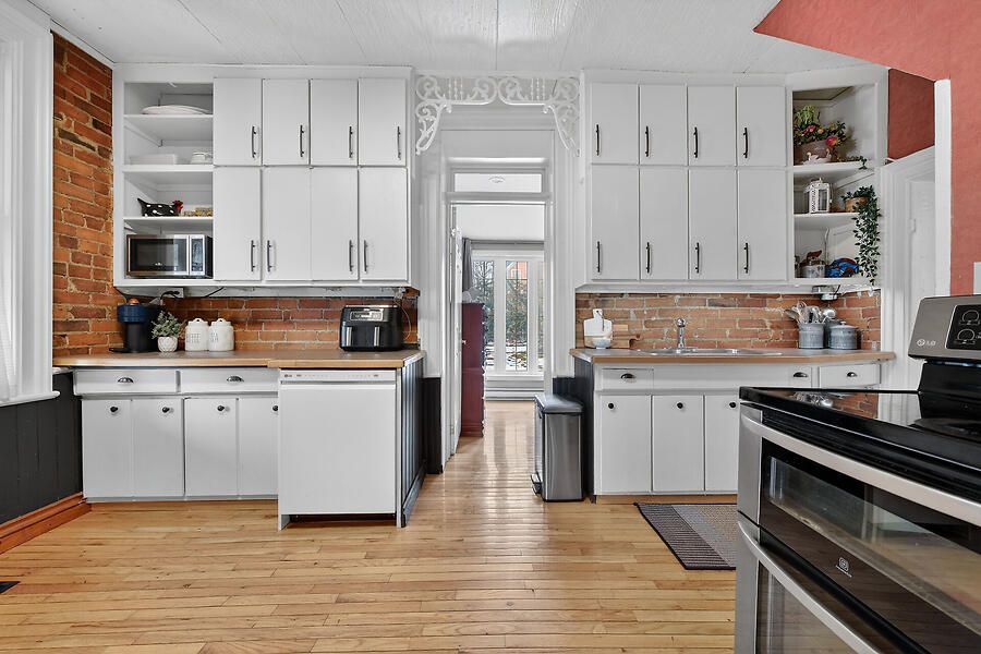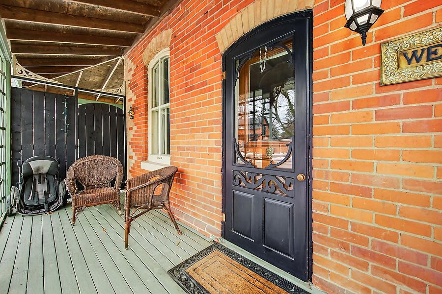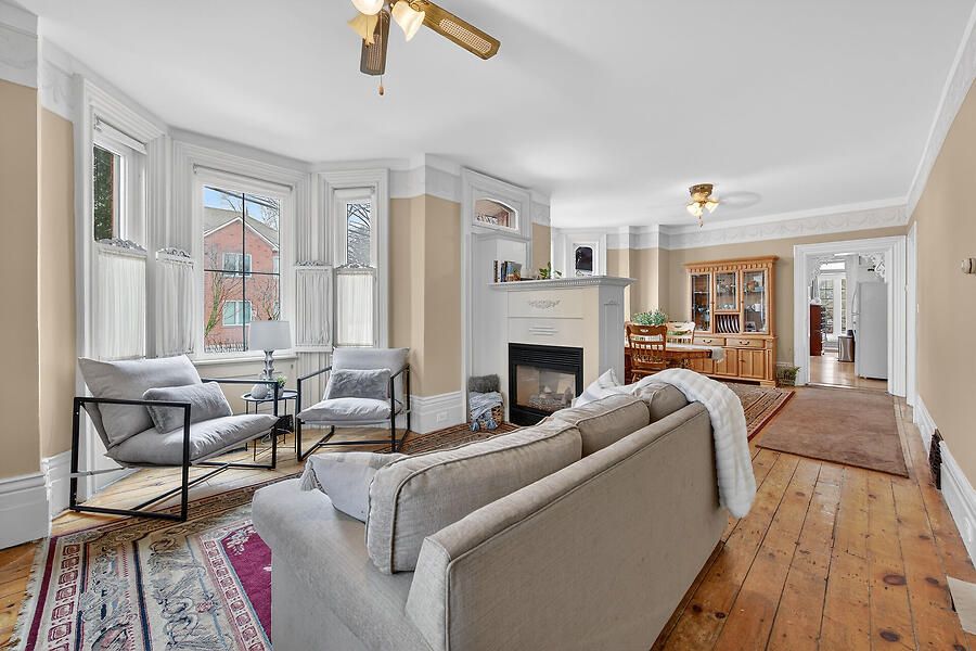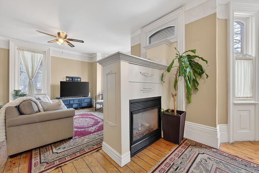 Welcome to 149 argyle st. N., a charming victorian home filled with original character and period details, blended with everyday modern comforts. This spacious property features large principal rooms and tall ceilings and windows. The main level offers a generous eat-in kitchen, formal dining room, and living room with a double-sided gas fireplace and two impressive bay windows that bring in plenty of natural light. There's also a bedroom with a 4-piece ensuite, a large second bedroom, mudroom with side entrance, and a 2-piece bath. The second floor has its own separate entrance and functions as a self-contained in-law suite. It includes a spacious living/dining area with walk-out to a balcony, an eat-in kitchen with ample cabinetry, a large bedroom, and a 4-piece bath with vaulted ceiling, clawfoot tub, skylight, and exposed beams. The suite also has its own washer and dryer. The laundry servicing the main floor is located in the unfinished basement. Outside, you'll find two separate paved driveways - providing 2 spaces for the 2nd floor and 3 spaces for the main floor, a large landscaped lot with custom fencing, a wraparound side/rear porch, separate front porch, a 10 x 10 shed with power and a 12 x 16 work shed, which has it's own panel. An excellent opportunity for an owner-occupied business, multi-generational living, or owner/tenant setup. With some updating, it could easily be converted back into a spacious 5-bedroom family home. Great curb appeal and ideally located within walking distance to the grand river, trails, schools, parks, and shopping.