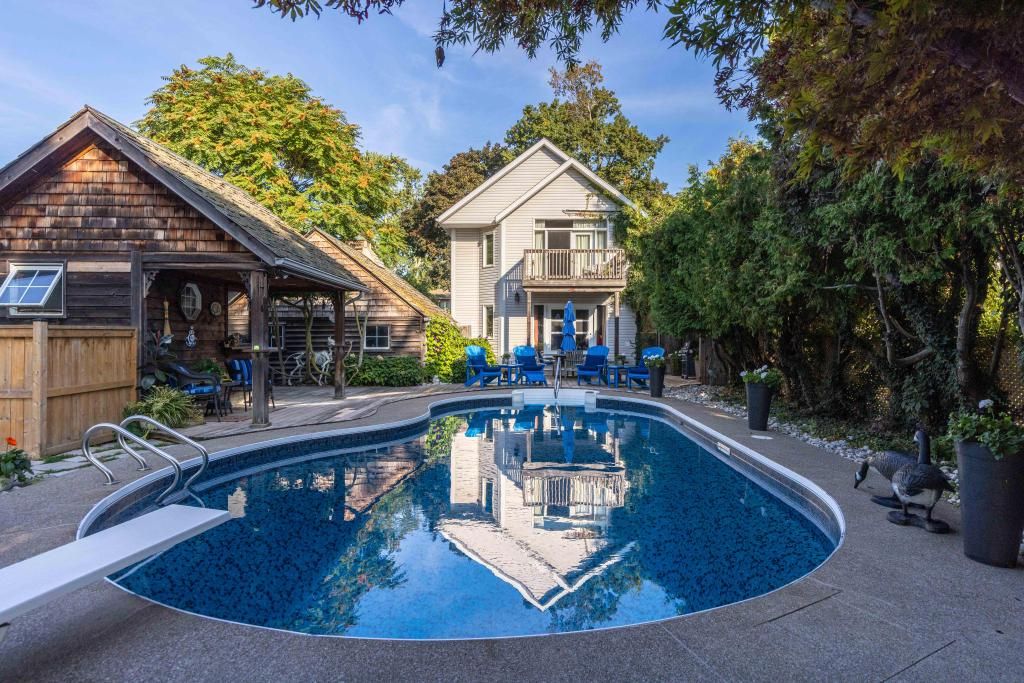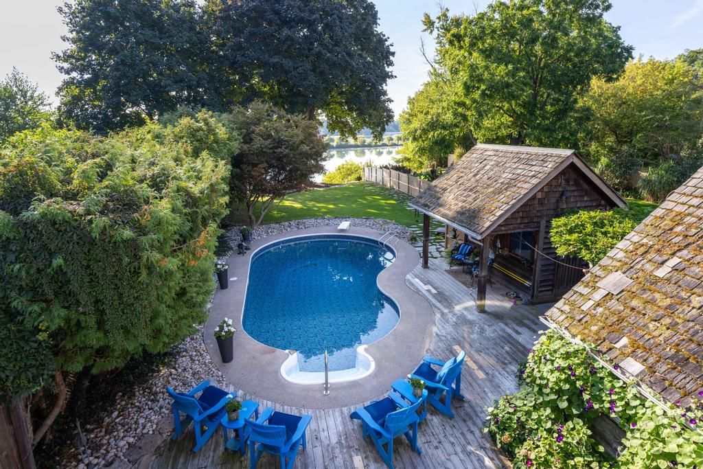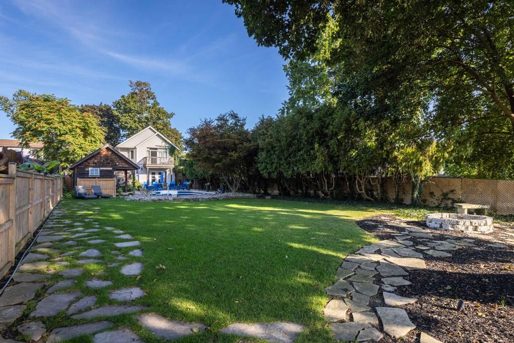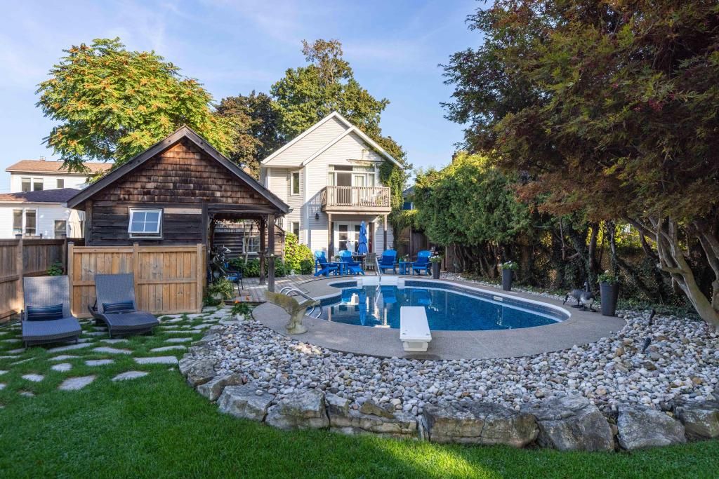 Only offered twice in 40 years, this is a rare and romantic slice of port dalhousie, tucked behind a white picket fence and framed by majestic century trees. This exceptional waterfront property stretches to the shores of martindale pond, offering serenity, privacy, and natural beauty rarely found within city limits. The backyard is a true retreat, featuring an inground pool, charming cabana, lush gardens, and a private dock at the water's edge. Enjoy morning coffee, sunset cocktails, or front-row views of world-class rowing from your own shoreline. Inside, the home blends historic charm with a thoughtfully designed 2-storey, 1,680 sq ft addition, creating a warm and welcoming space ideal for gathering. The original 950 sq ft home showcases custom millwork, a beamed dining room ceiling, and cozy character, while the 2010 addition offers a stunning kitchen, pond-view great room, and a spectacular primary suite with balcony, vaulted ceiling, gas fireplace, and breathtaking outlook. Two staircases enhance flow and flexibility. Skylit bedrooms, 3 gas fireplaces, and a layout that allows for a separate guest retreat or private children's wing add versatility. A poured concrete basement with 9' ceilings offers outstanding potential for additional finished living space, while a generac generator, updated mechanicals, and meticulous care throughout provide comfort and peace of mind. Port dalhousie is a prestigious lakeside enclave known for sandy beaches, private marinas, waterfront trails, acclaimed dining, and the world-famous henley island rowing course. Minutes to wineries, golf, and highway access, this is one of niagara's most exclusive lifestyle communities.