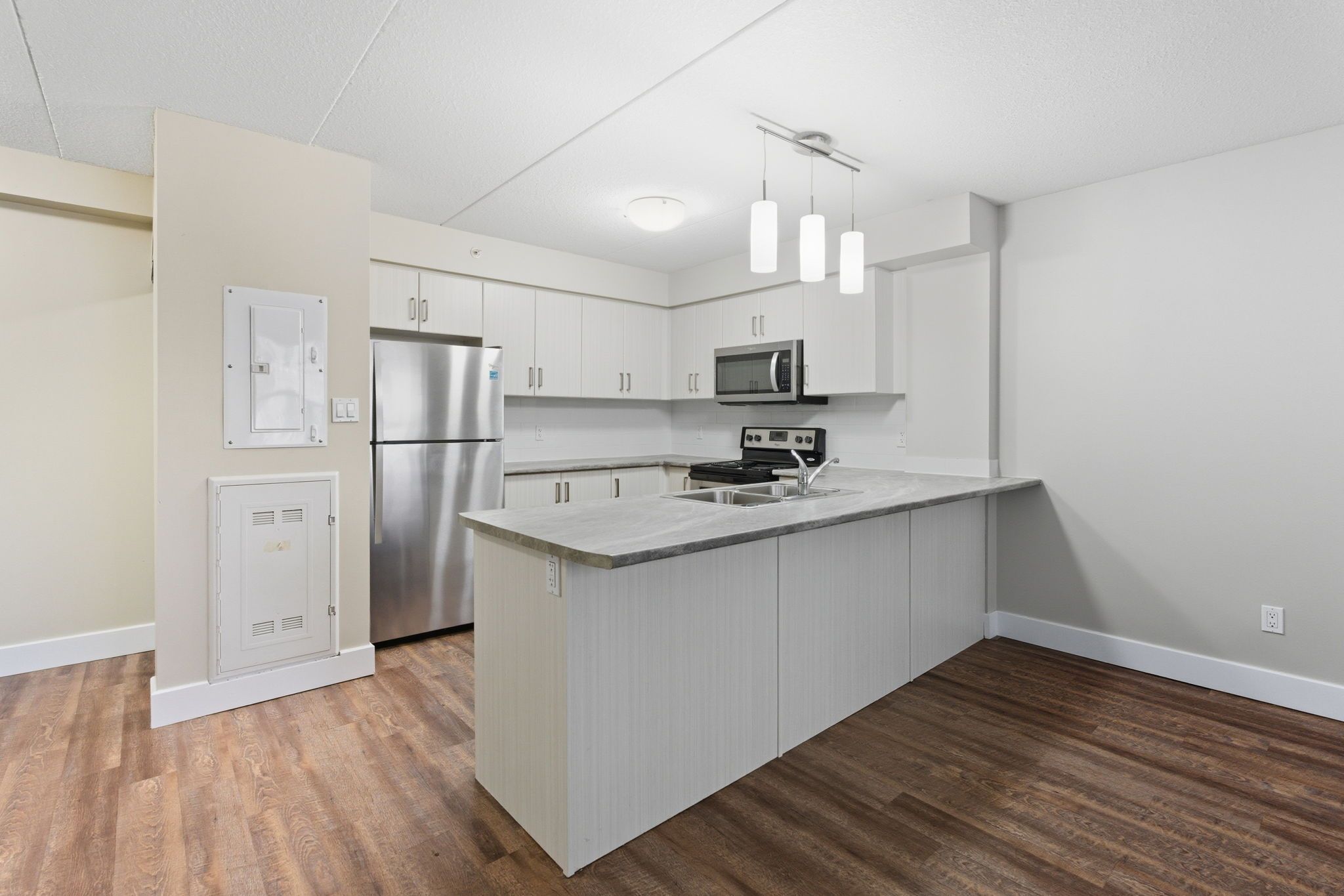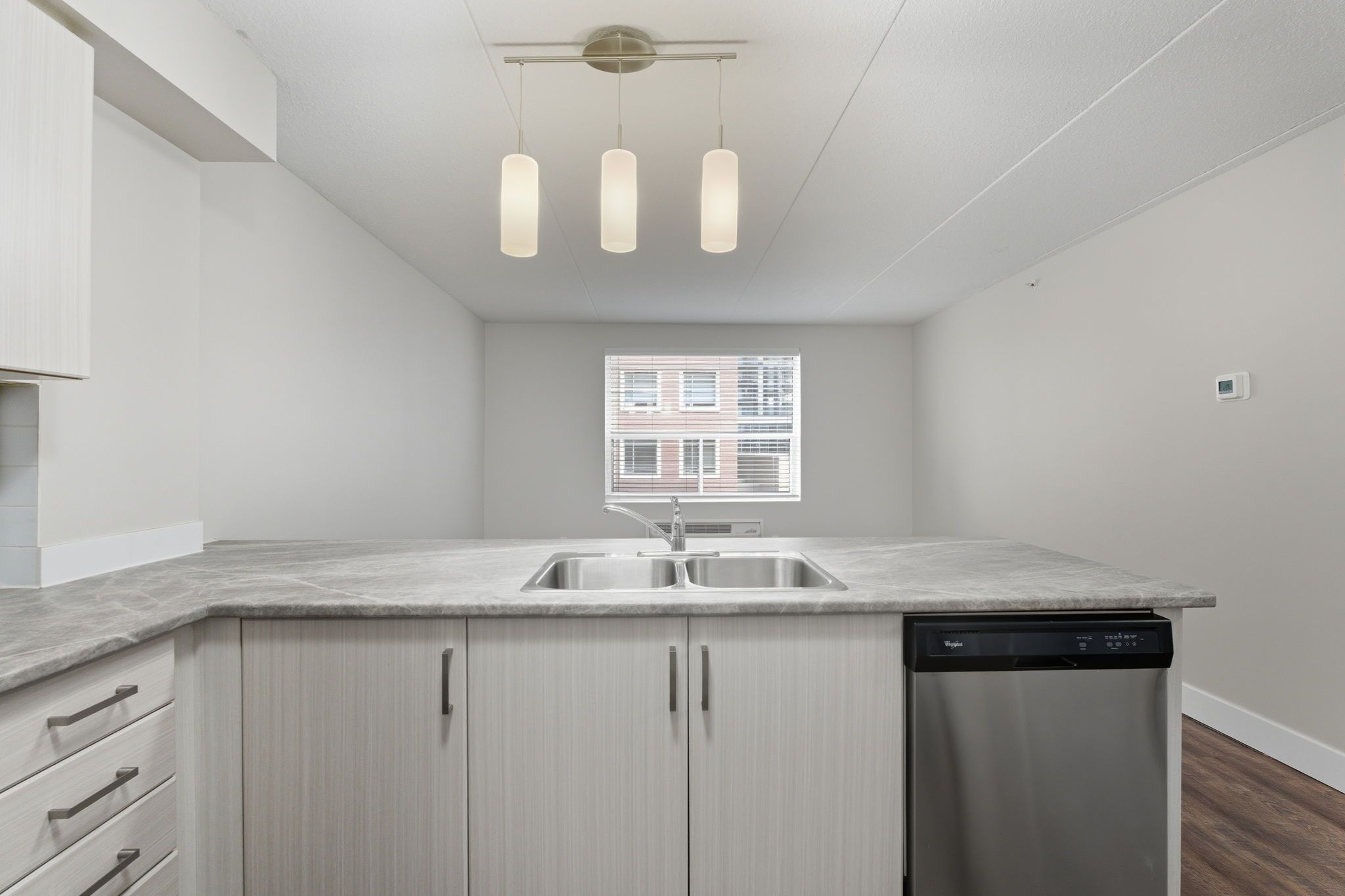 • Stylish one-bedroom unit with open-concept kitchen and large island.