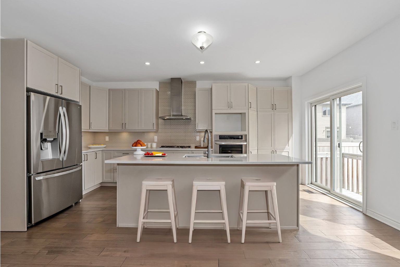 • Stylish kitchen with stainless steel appliances and large center island.