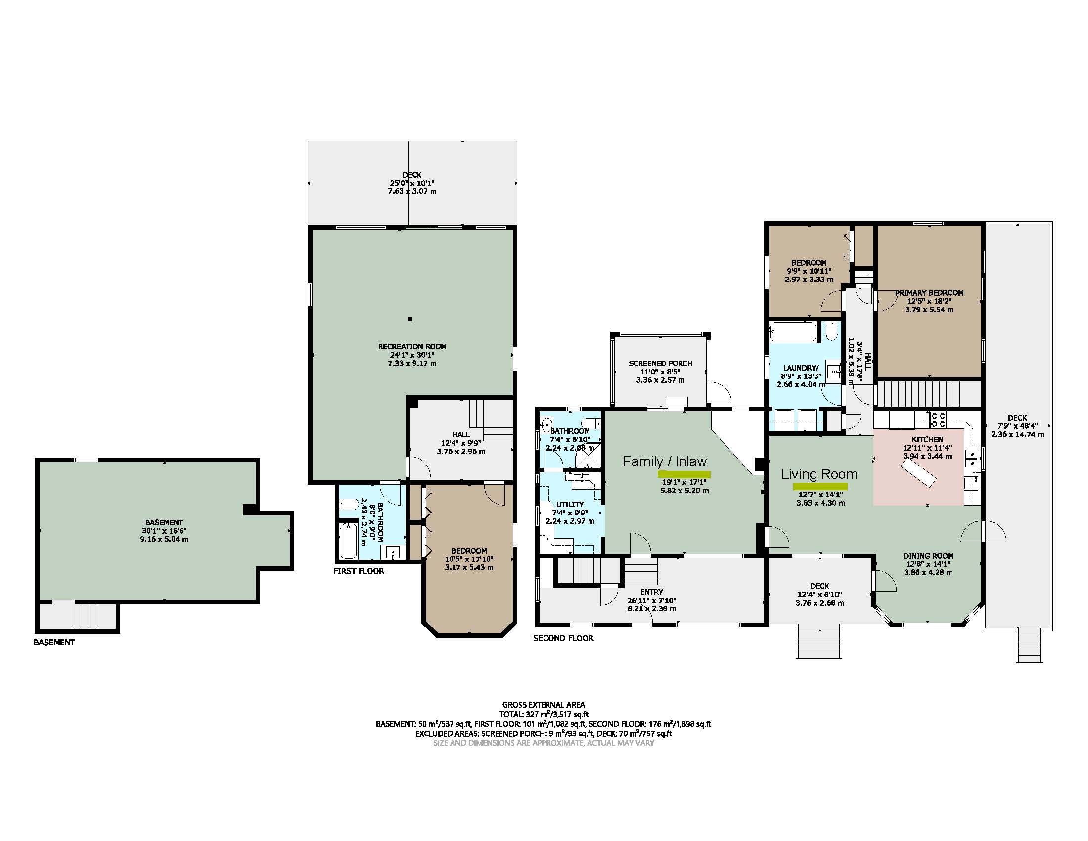 • Main floor features family room, laundry, and primary bedroom with deck access.