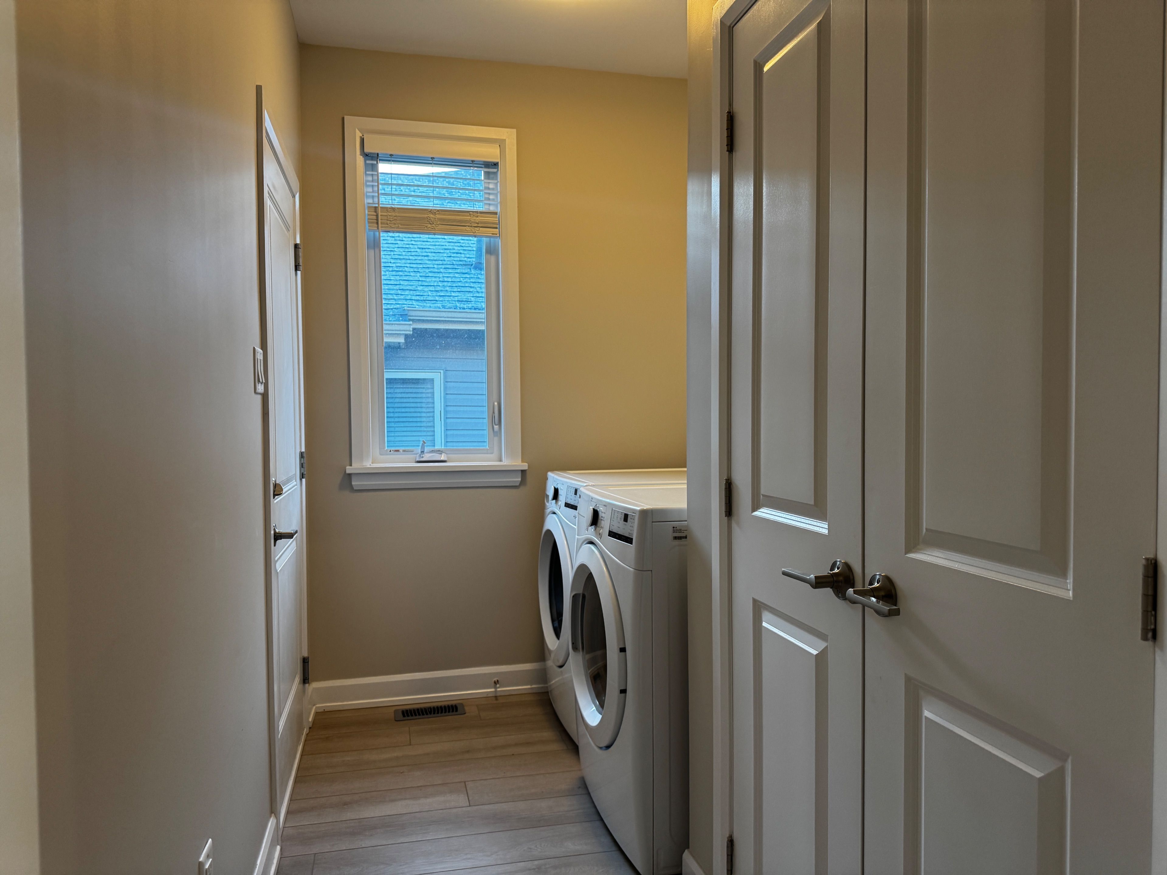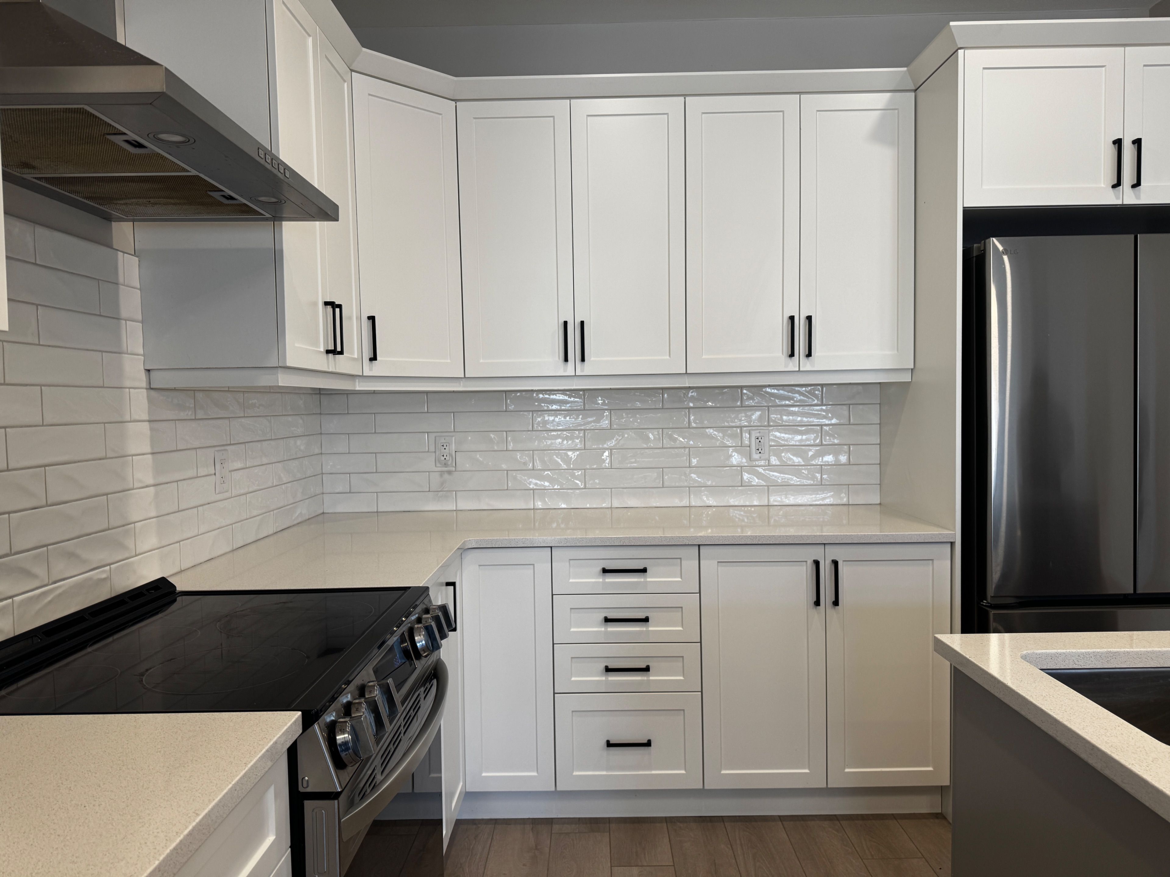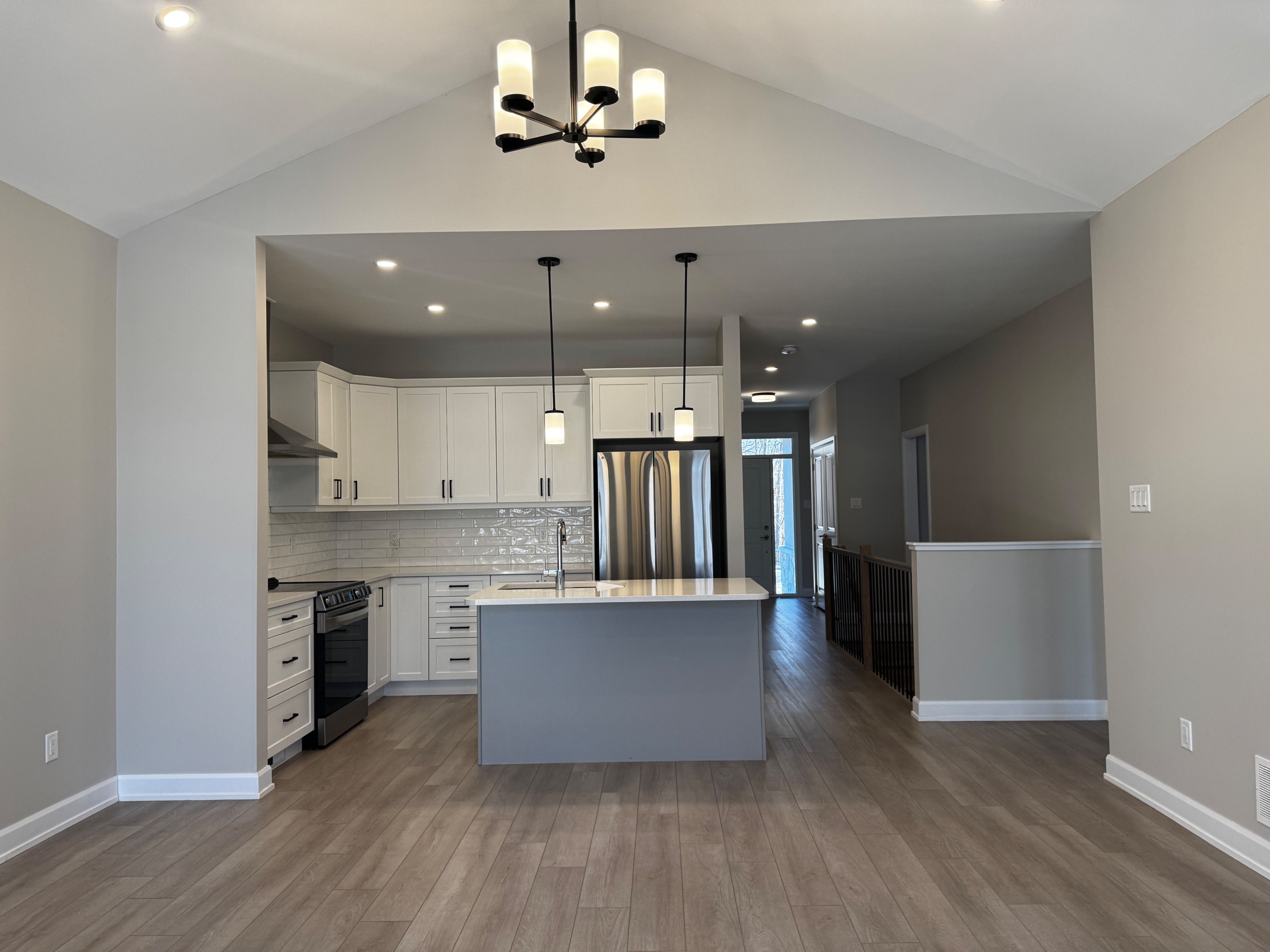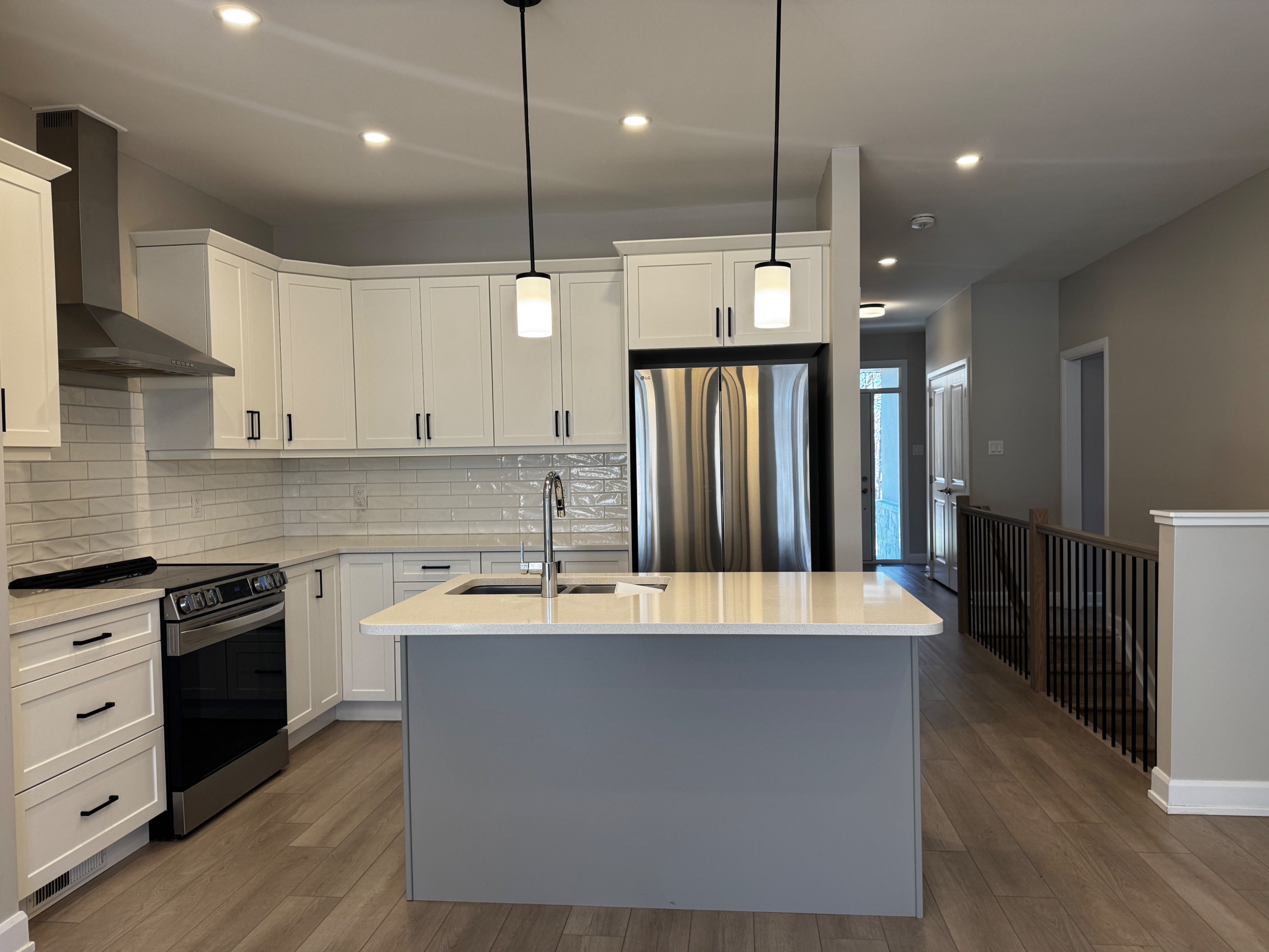 • Kitchen features ample cabinetry, quartz counters, and a large island.
