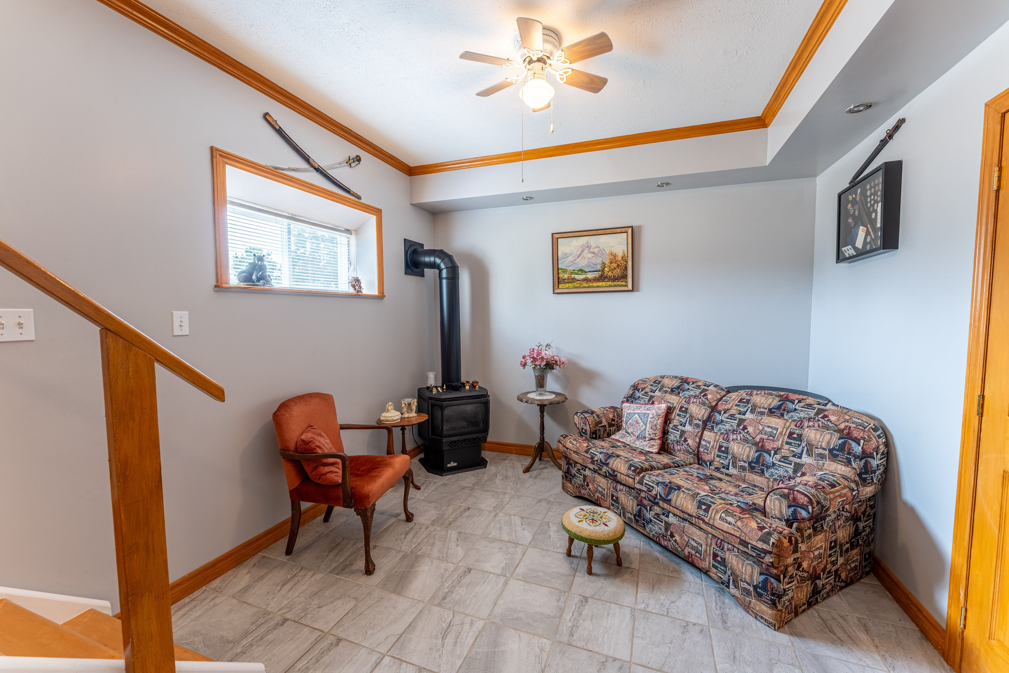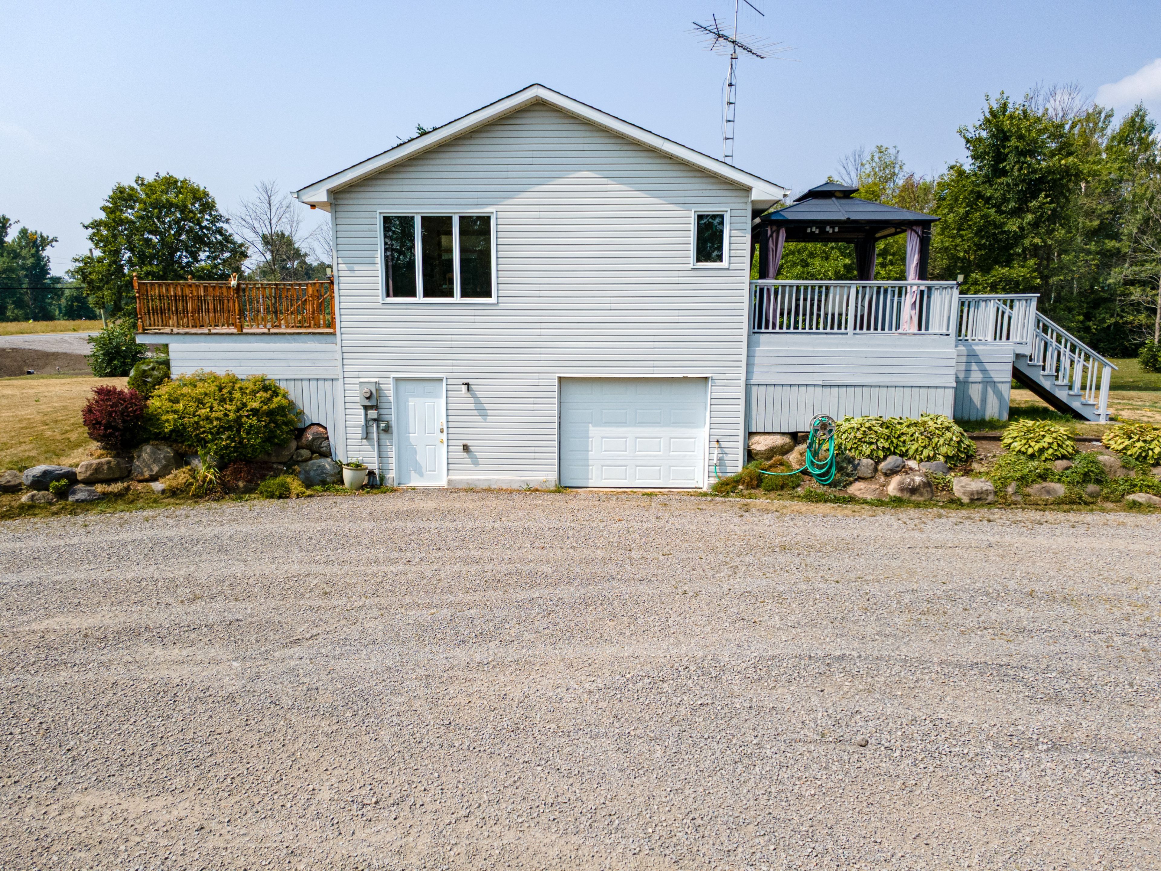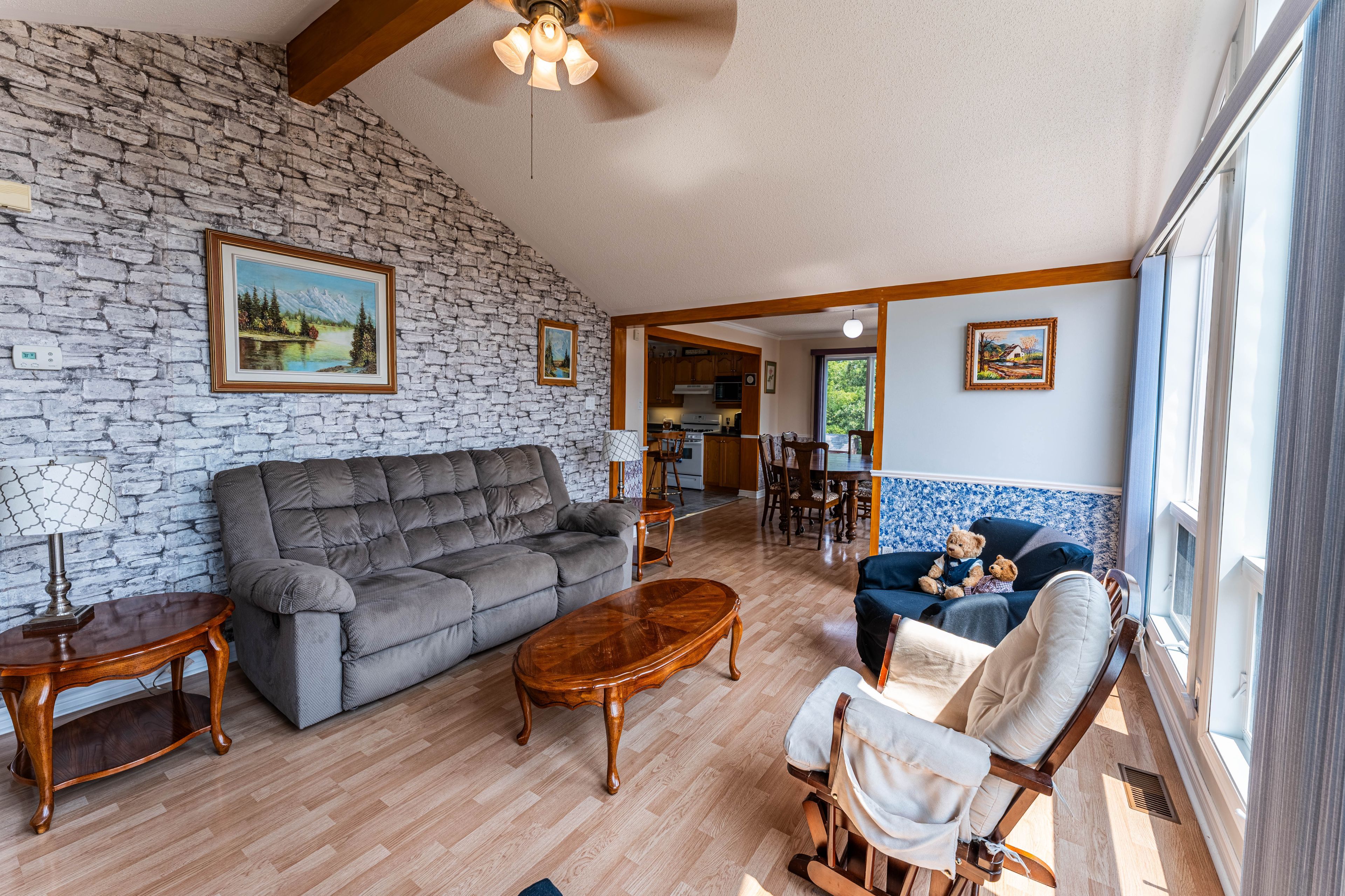 Charming 2-bedroom, 2-bathroom bungalow built in 2005, set on a spacious double lot. This bright and inviting home features a living room with wall-to-wall ceiling-high windows that fill the space with natural sunlight. The kitchen opens to a large back deck, perfect for entertaining, while the dining area offers walkout access to a front deck. The basement includes a finished rec room and potential to expand by dividing the extra-large heated, insulated garage double deep for a workshop or abundant storage. The oversized driveway provides ample parking and a 50-amp rv hookup. The property is on septic and well and city water is at the road ready for hook up. This home is just waiting for a family who loves the outdoors. Call today for a private viewing.