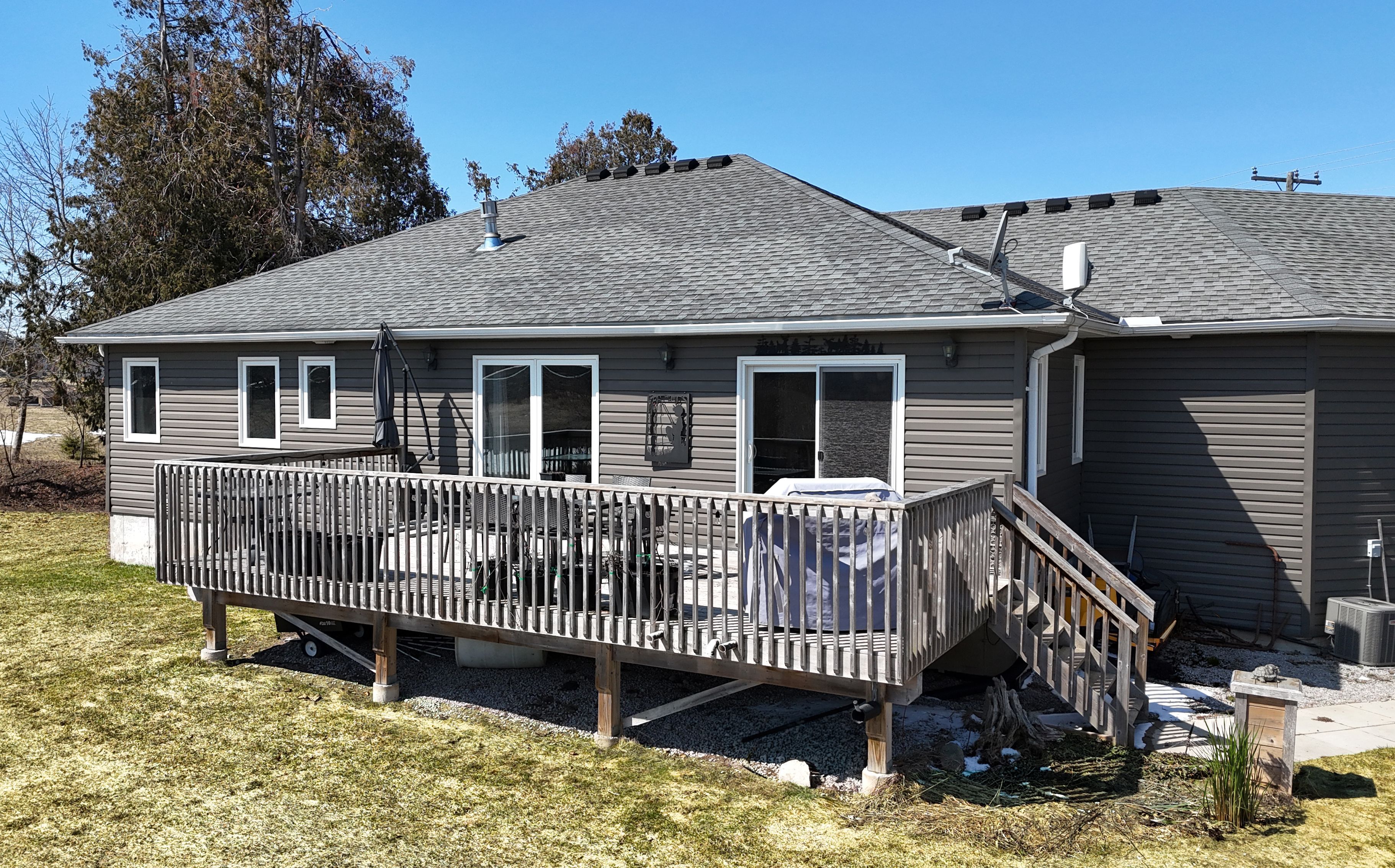 • Oversized garage with work nook, high ceilings, and a large deck.