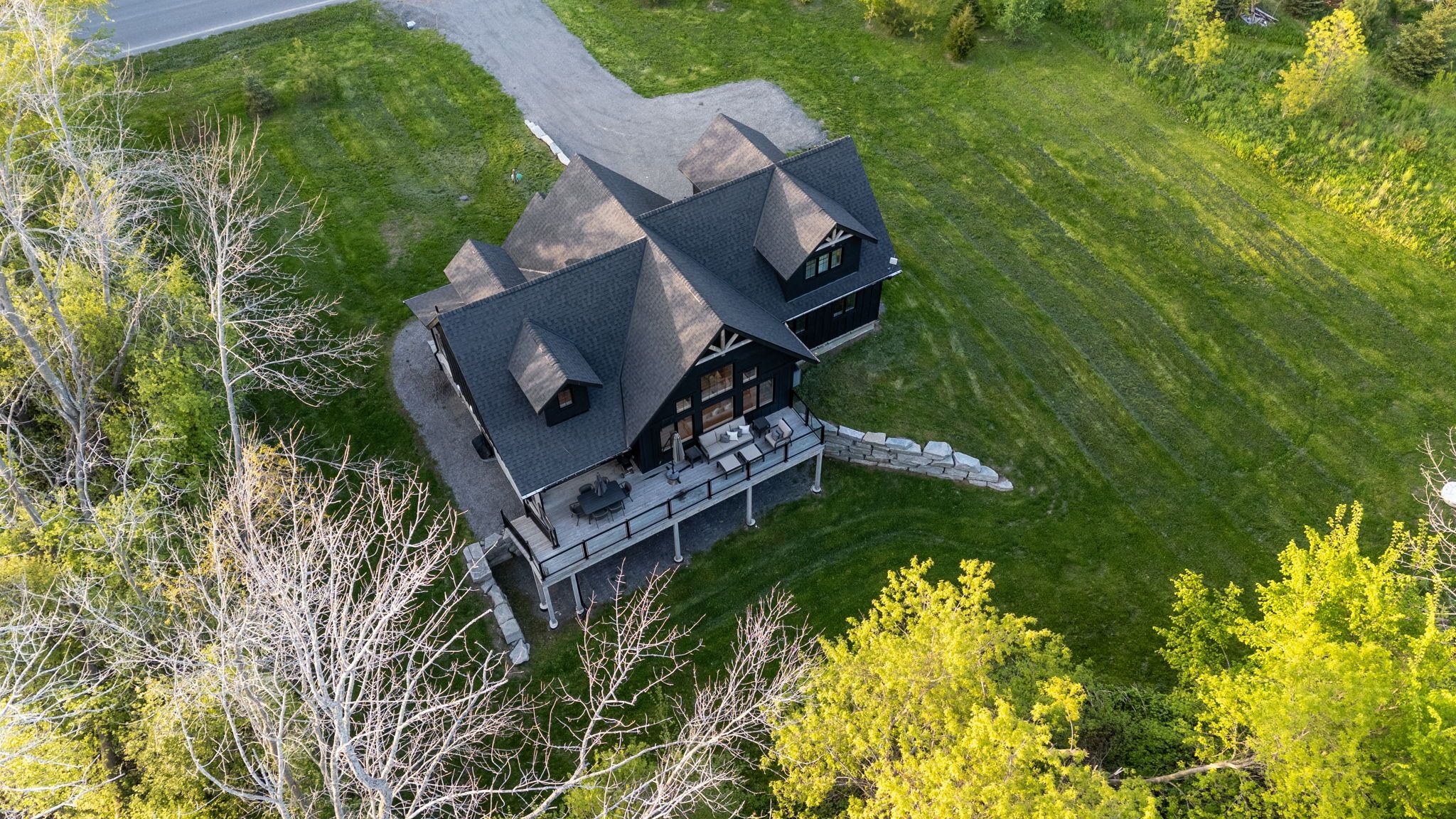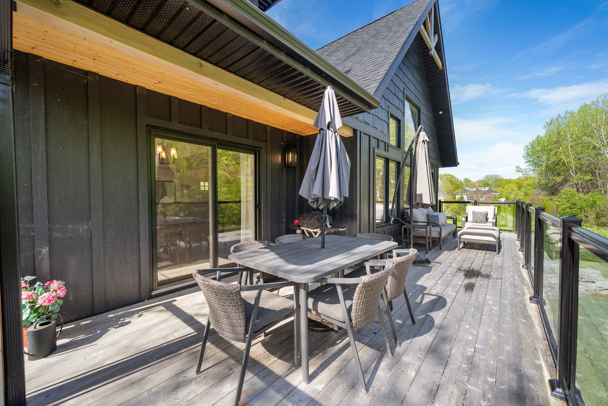 • Open-concept design with vaulted ceilings and large windows for natural light.