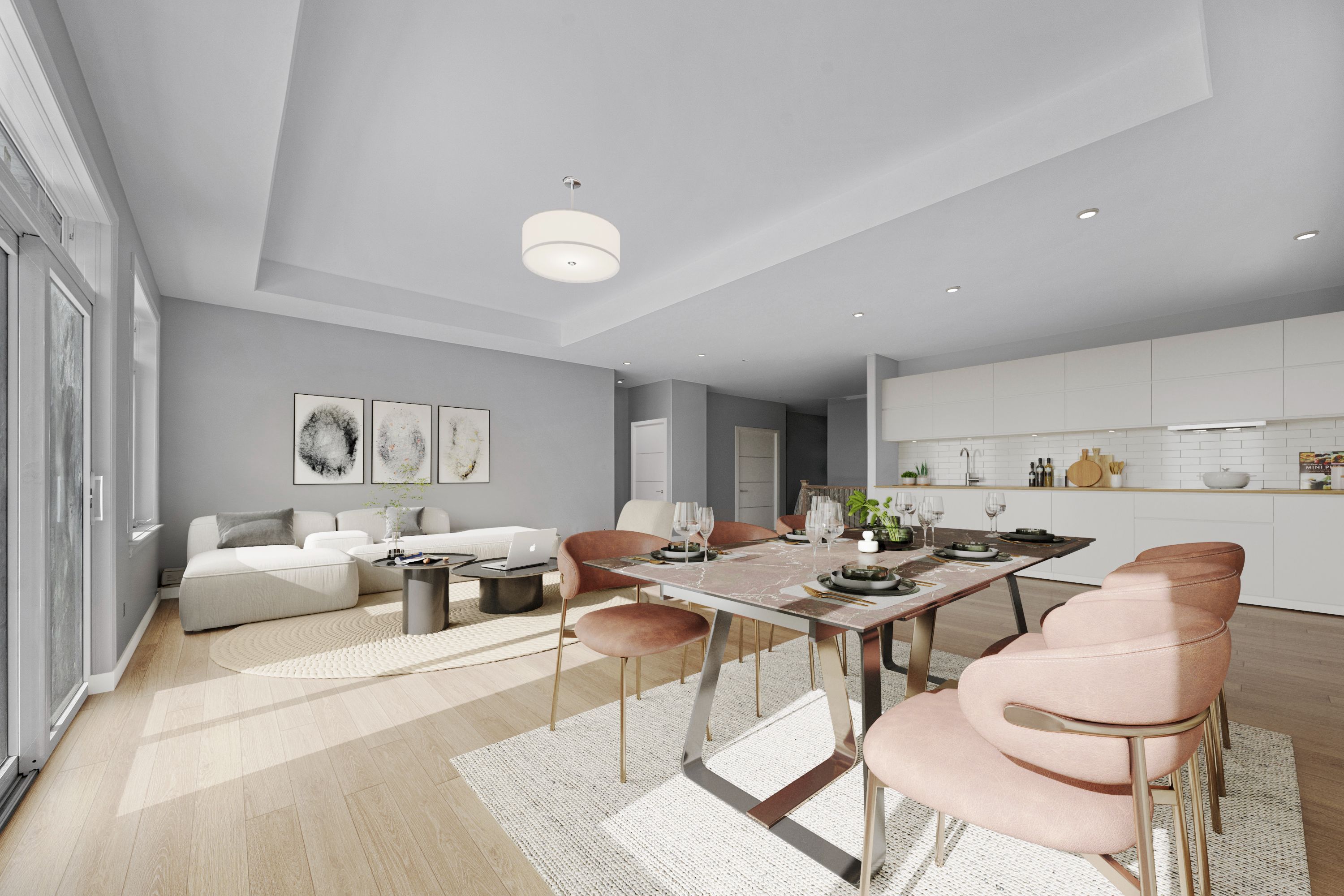 • Spacious kitchen with soft-close cupboards and quartz countertops.