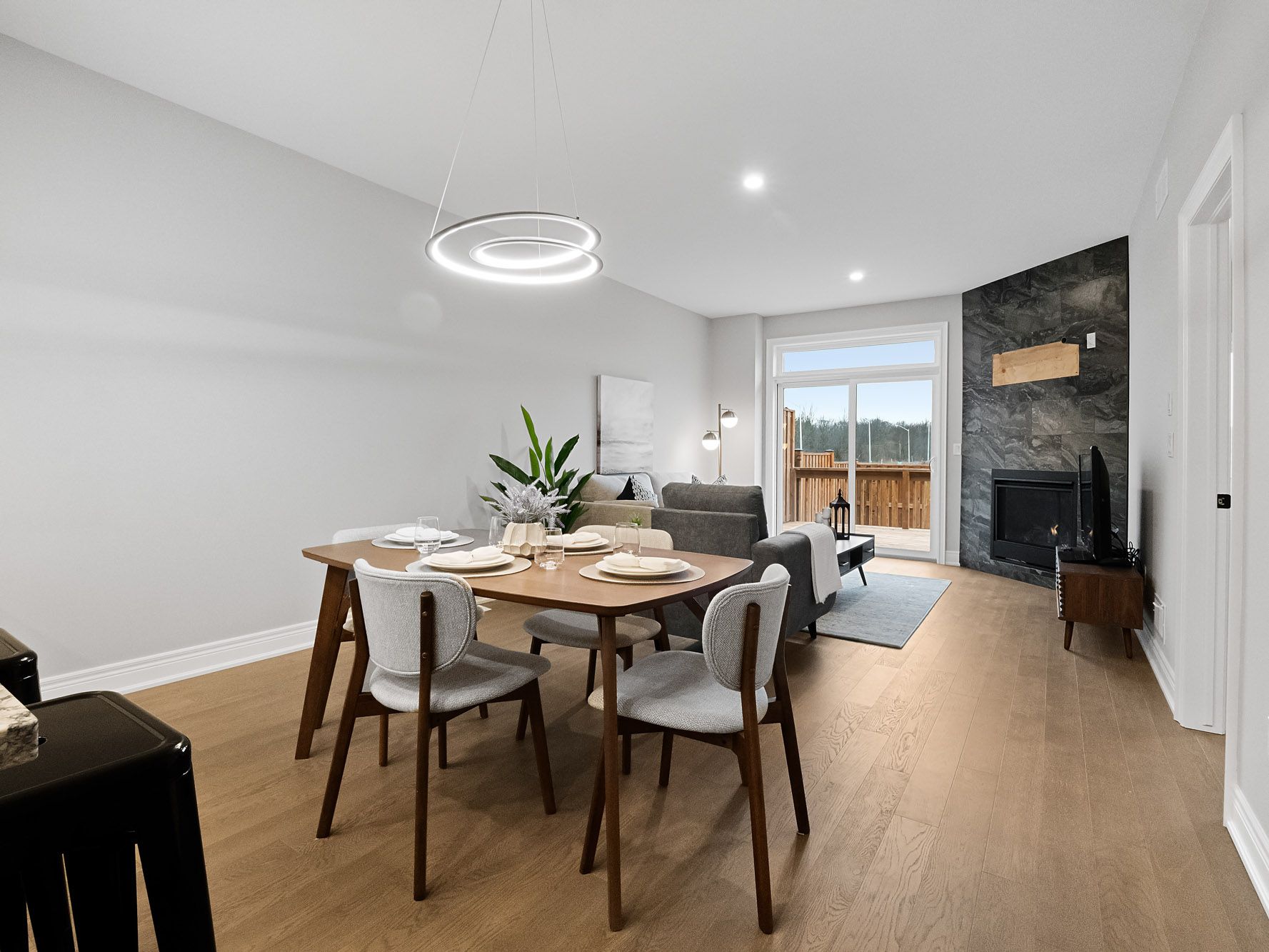 • Open-concept main floor with a chef's kitchen and cozy fireplace.