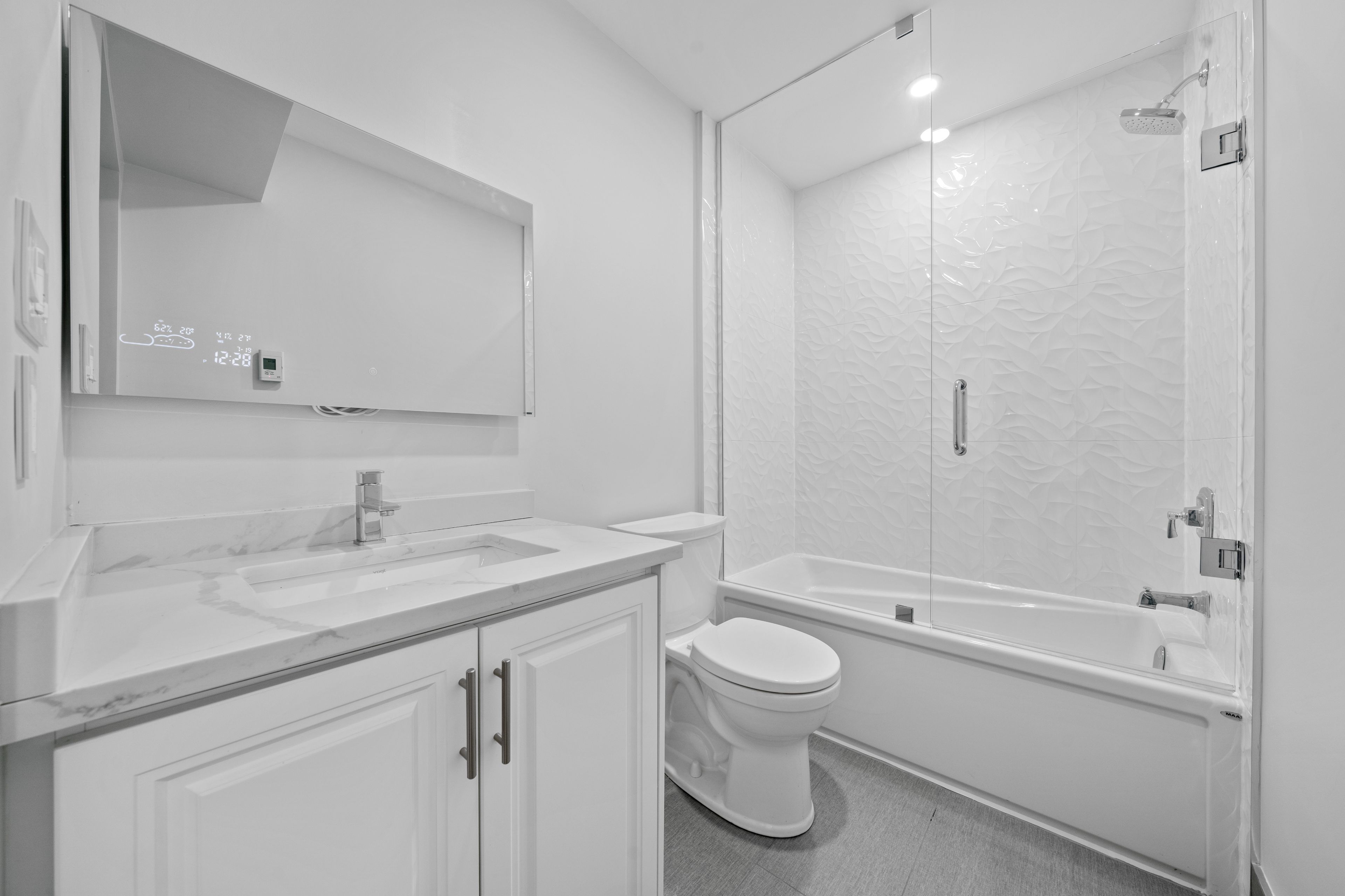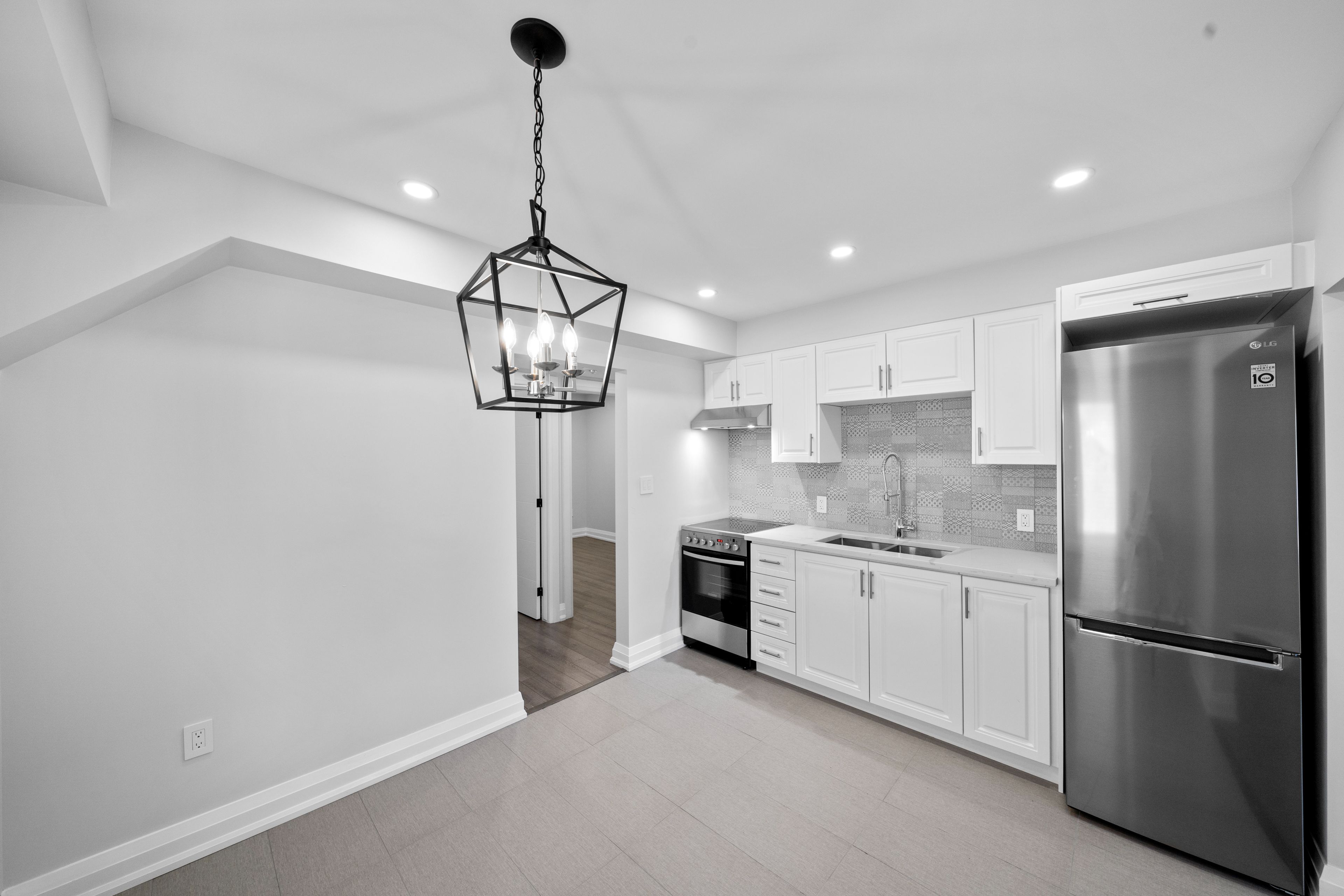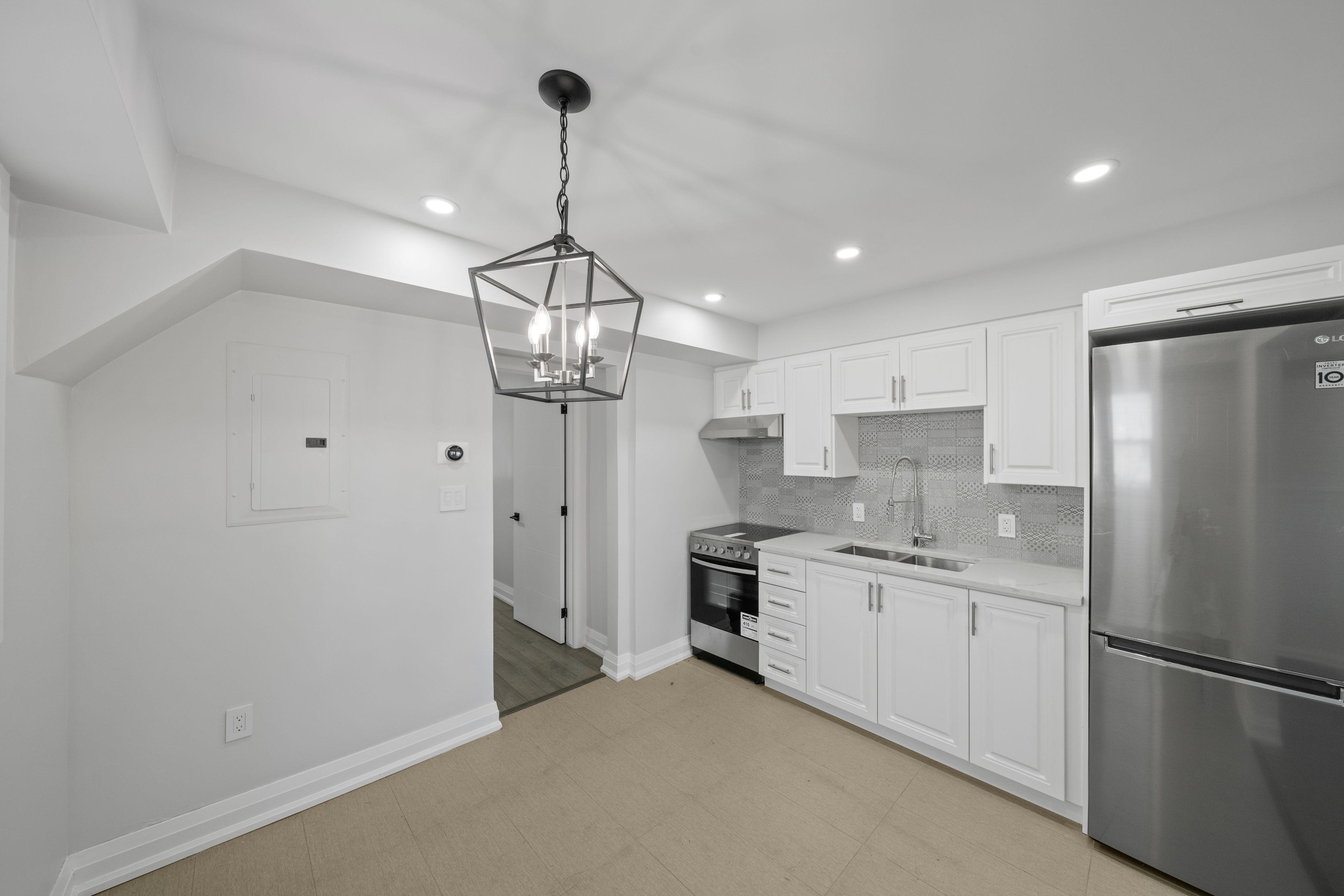 • Modern kitchen with heated bathroom floors for extra comfort.