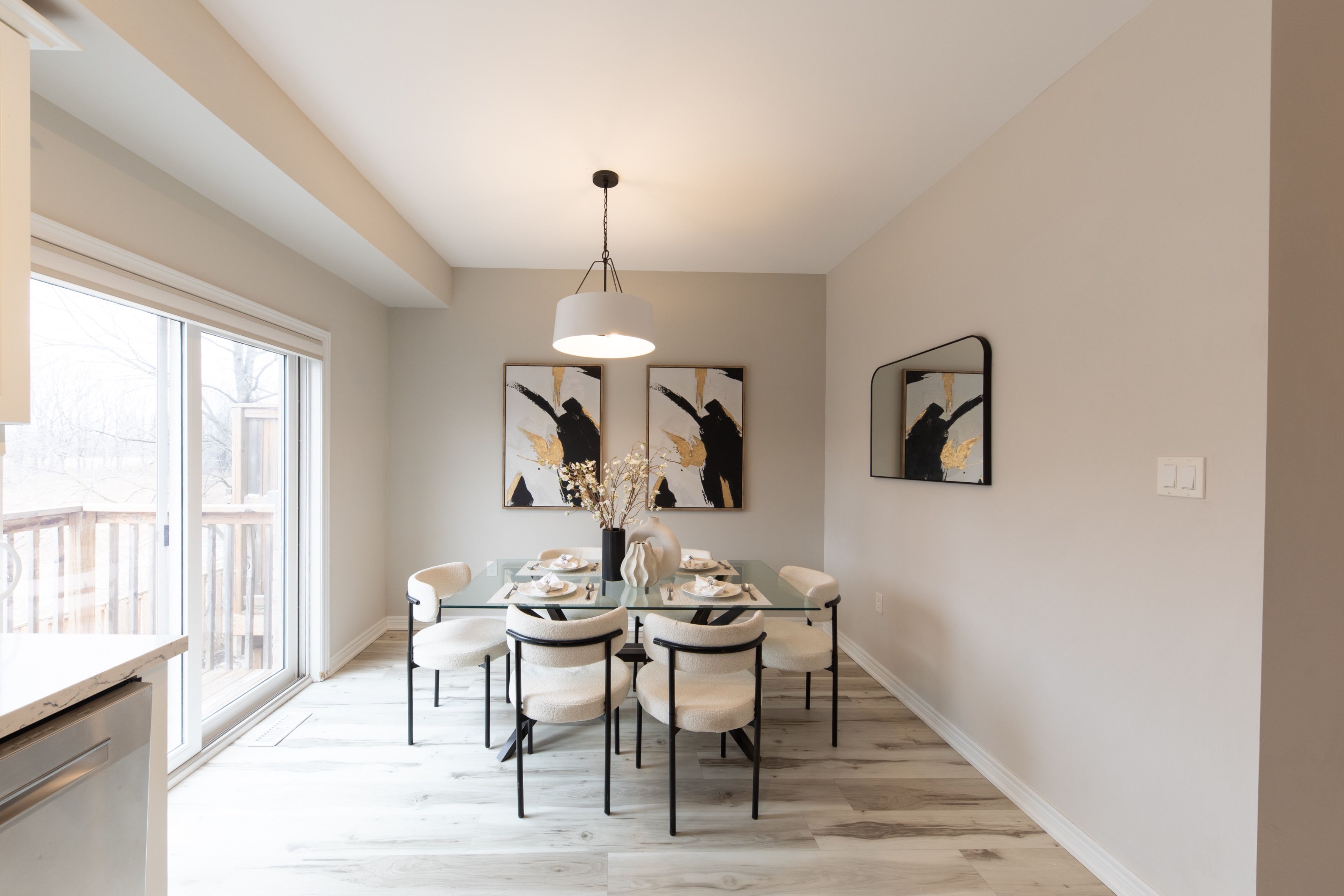 Modern 3-storey townhome in ancaster's prestigious meadowlands. Backing onto mature trees with no direct neighbours in front or behind, this home offers a private and quiet setting. Thoughtfully designed with a ground-level walk-out, main living space on the second floor, and three bedrooms on the upper level, the layout provides clear separation of living areas and everyday functionality. The bright open-concept second floor features an oversized living area, upgraded oak stairs, and a modern white kitchen with quartz countertops, extended-height cabinetry, and quality appliances. The dining area walks out to a private balcony overlooking mature trees. The primary bedroom includes a walk-in closet and an upgraded ensuite. All bathrooms are finished with quartz counters and upgraded fixtures. The ground-level walk-out offers flexible additional space with direct access to the backyard and garage. A standout feature is the extra-wide garage with built-in shelving on both sides, along with access to additional storage space. Concrete block partition walls between units enhance soundproofing, privacy, and durability. Ideally located minutes to hwy 403 and the linc, within walking distance to schools and parks, and a short drive to meadowlands shopping, including costco, cineplex, and sobeys.