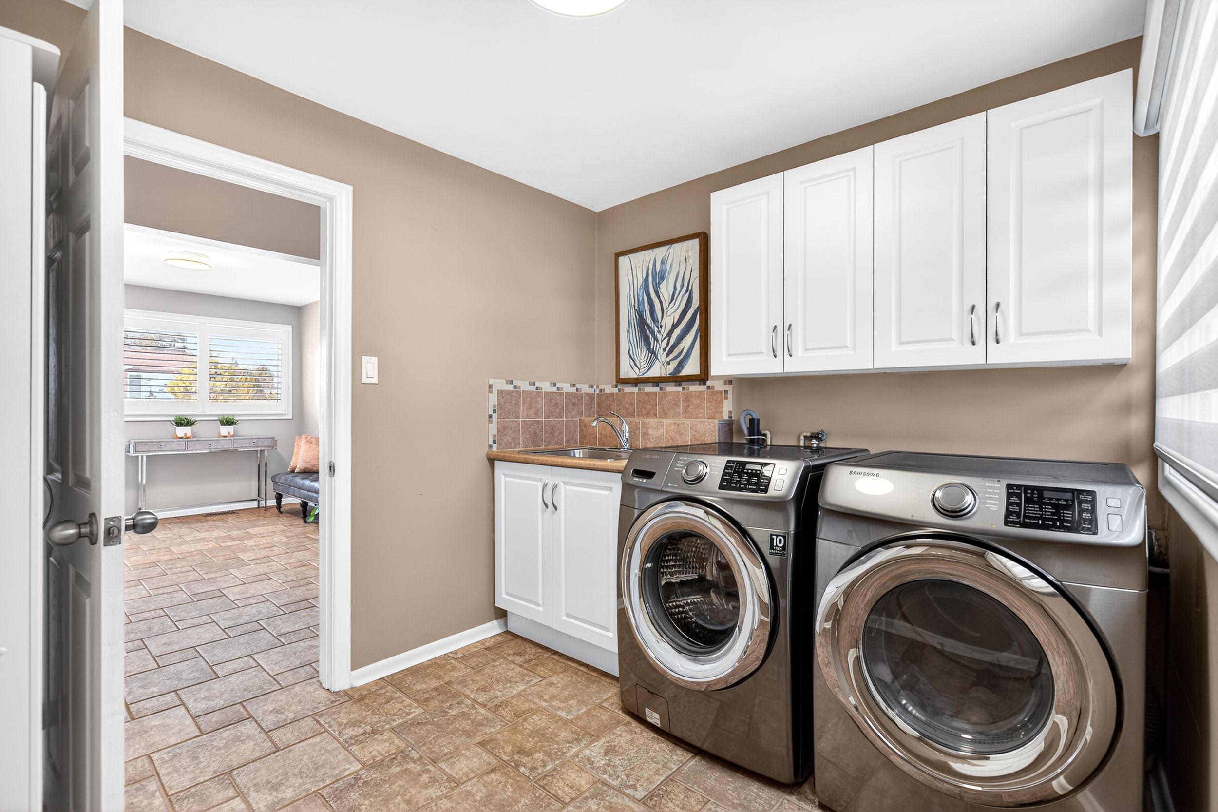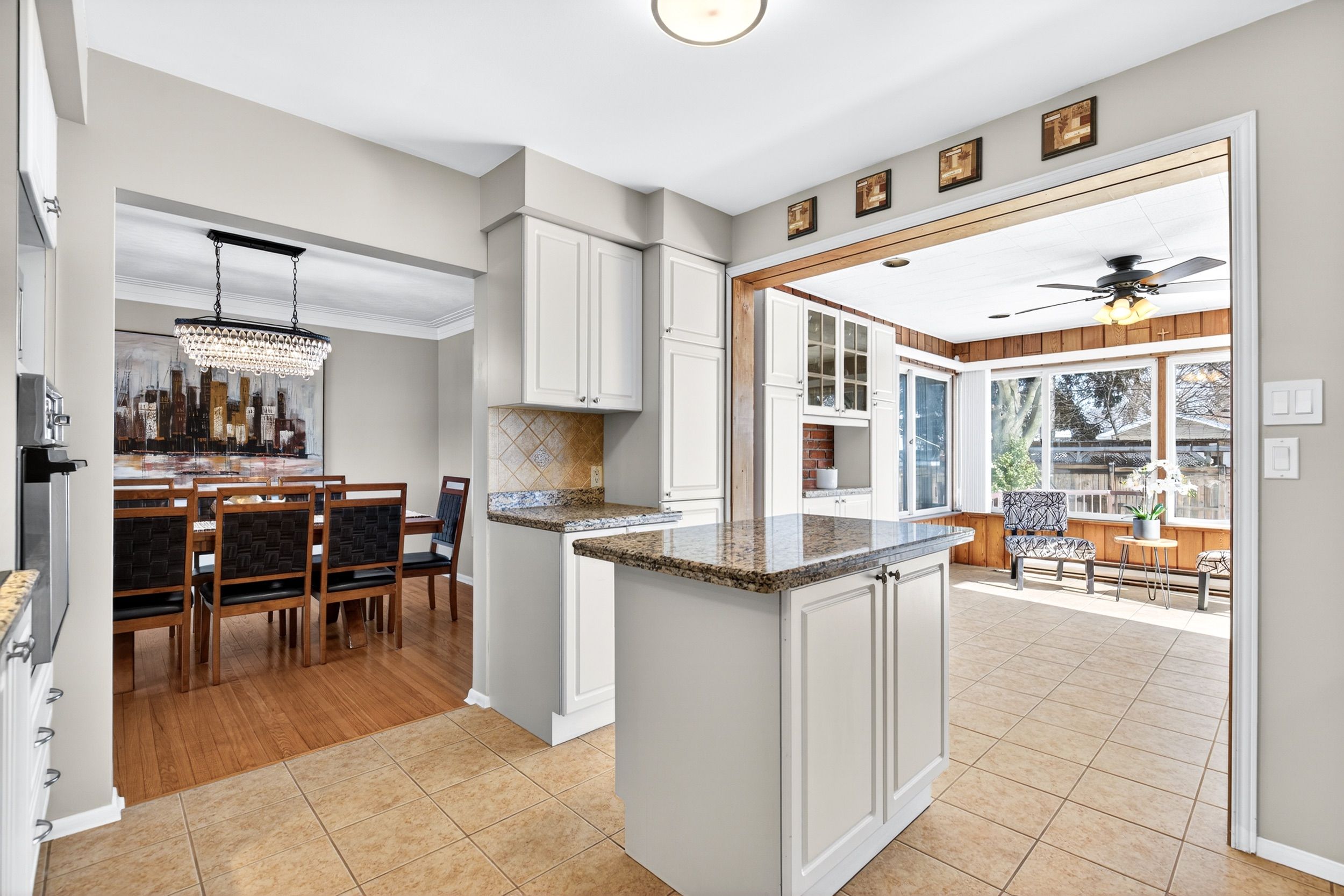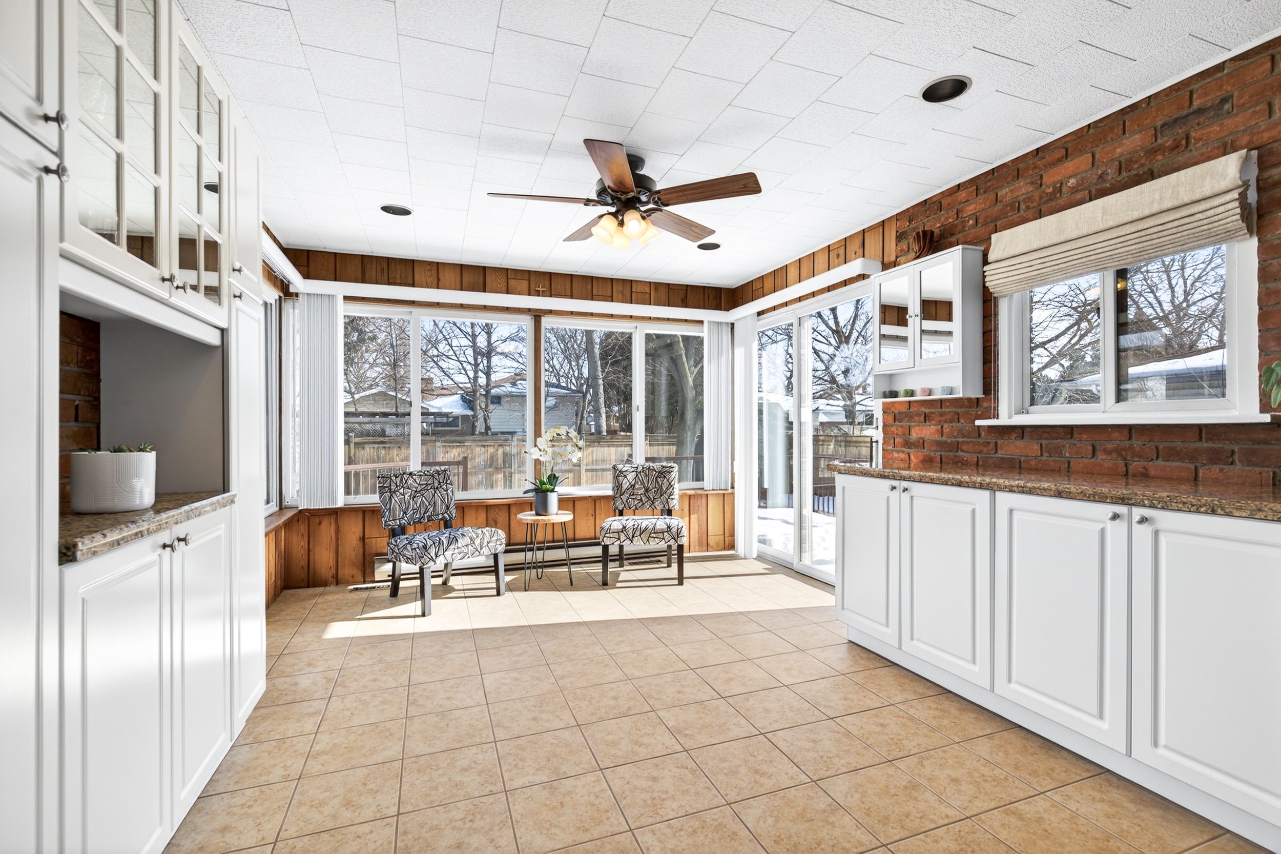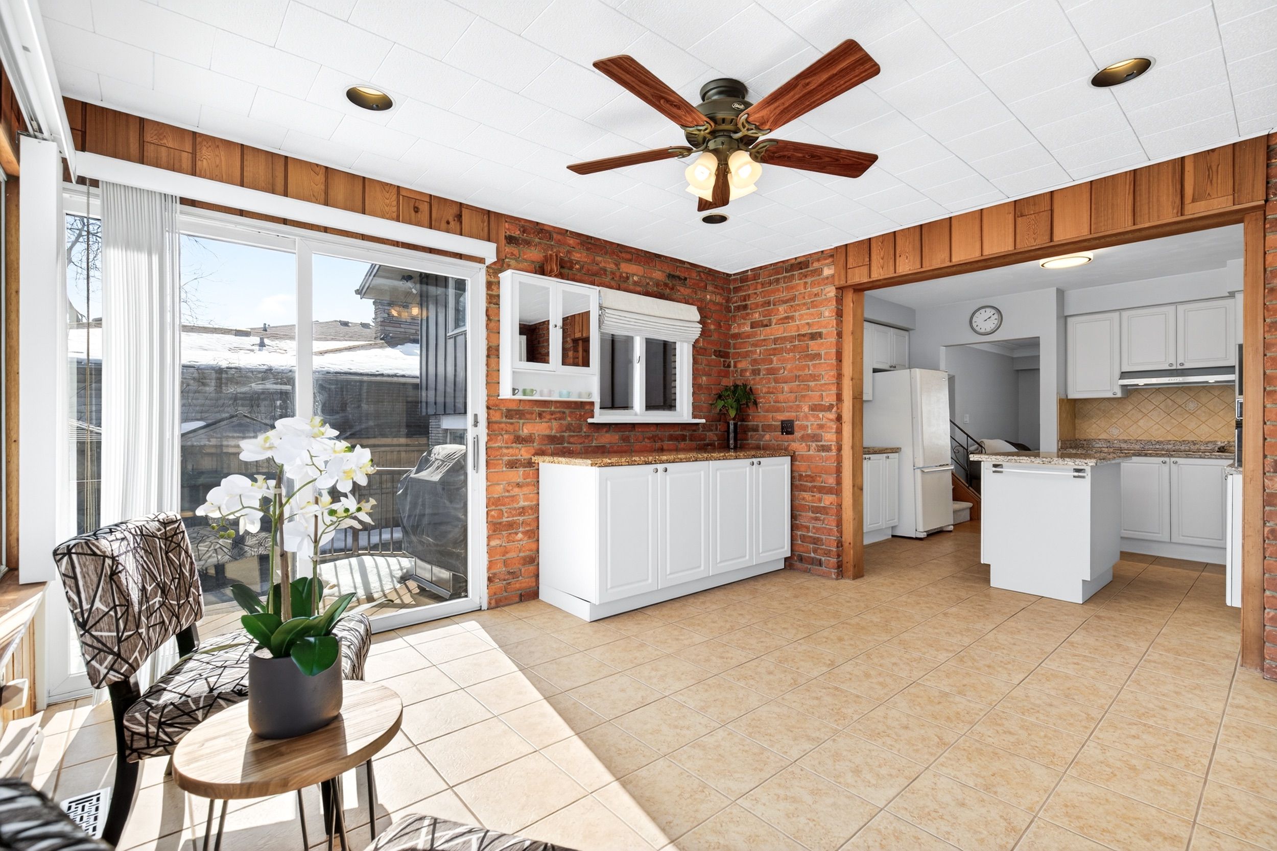 • Sun-filled kitchen and sunroom with brick walls overlooking the backyard.